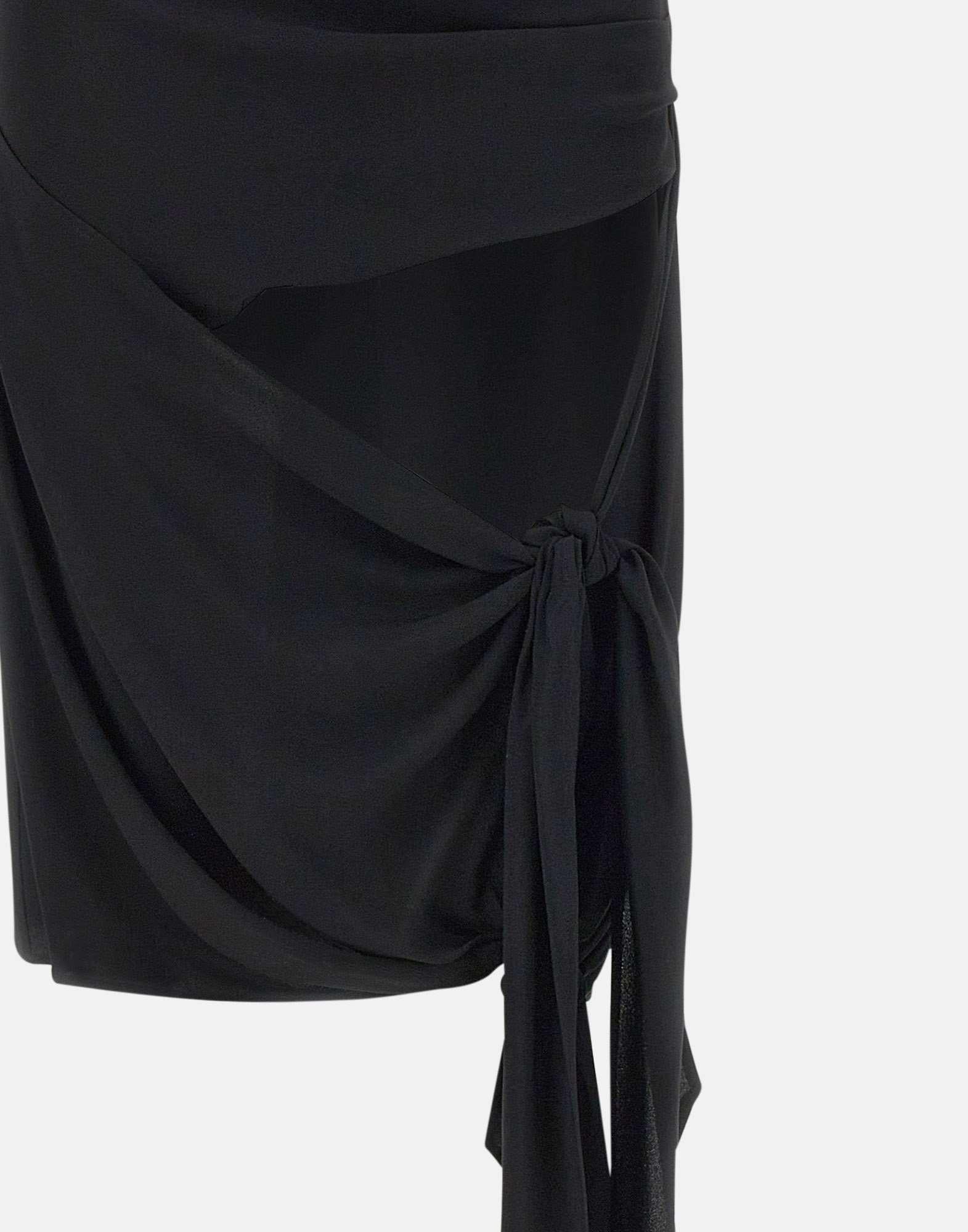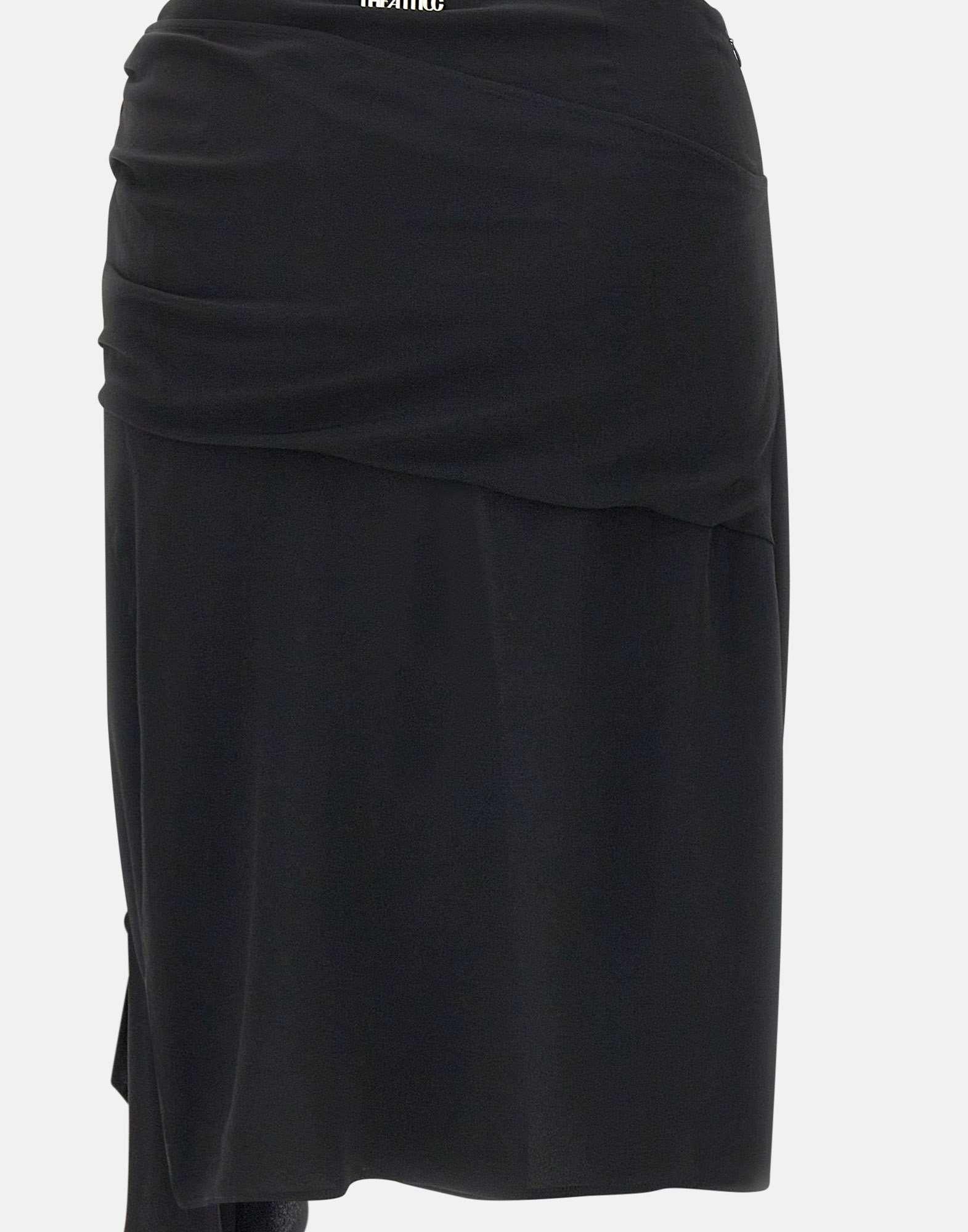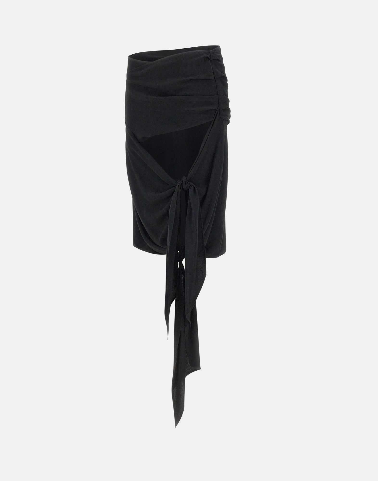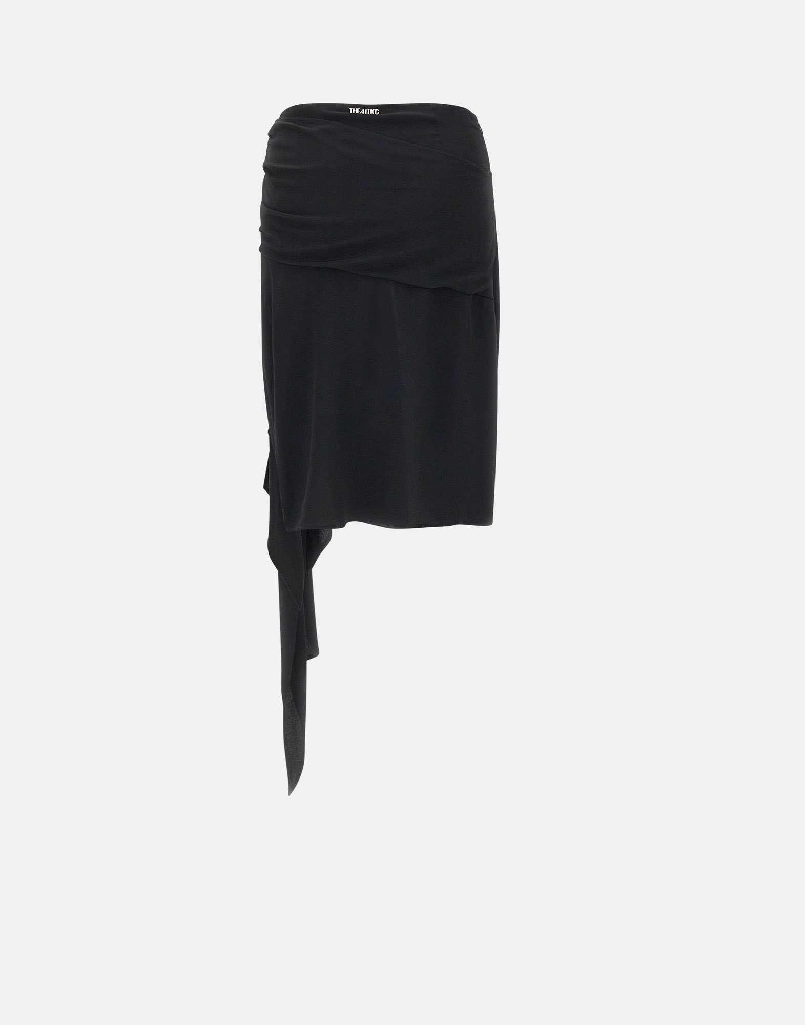 The Attico black silk-blend crêpe midi skirt featuring side ruching and two adjustable knots on the left side for a customizable slit effect. Detailed with a central metallic logo and a soft fabric drape on the back for added movement. Concealed side zip closure. Made in Italy. A refined, bold piece ideal for evening looks.