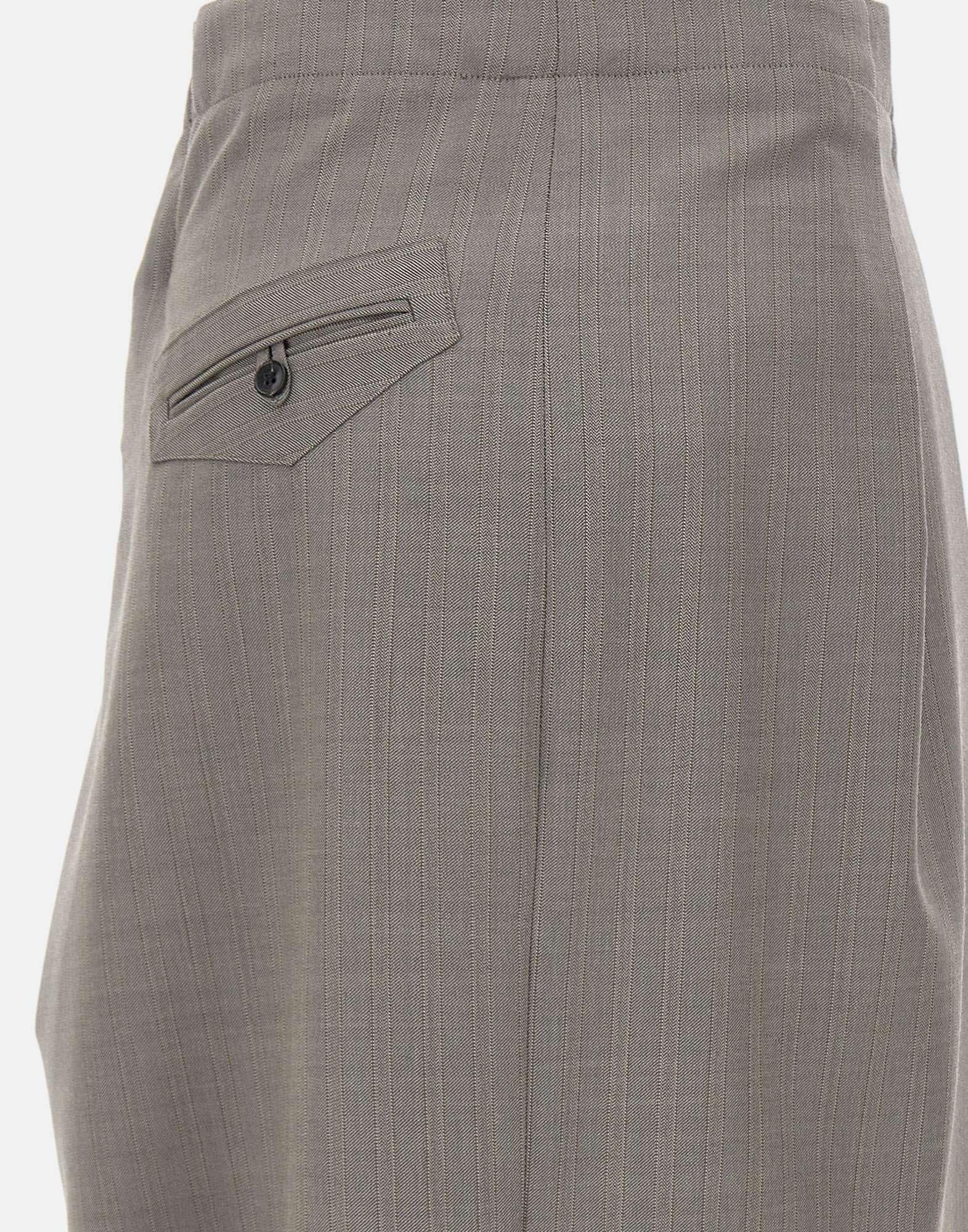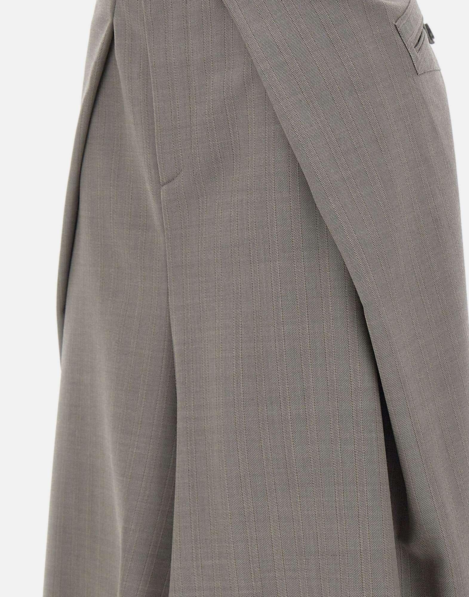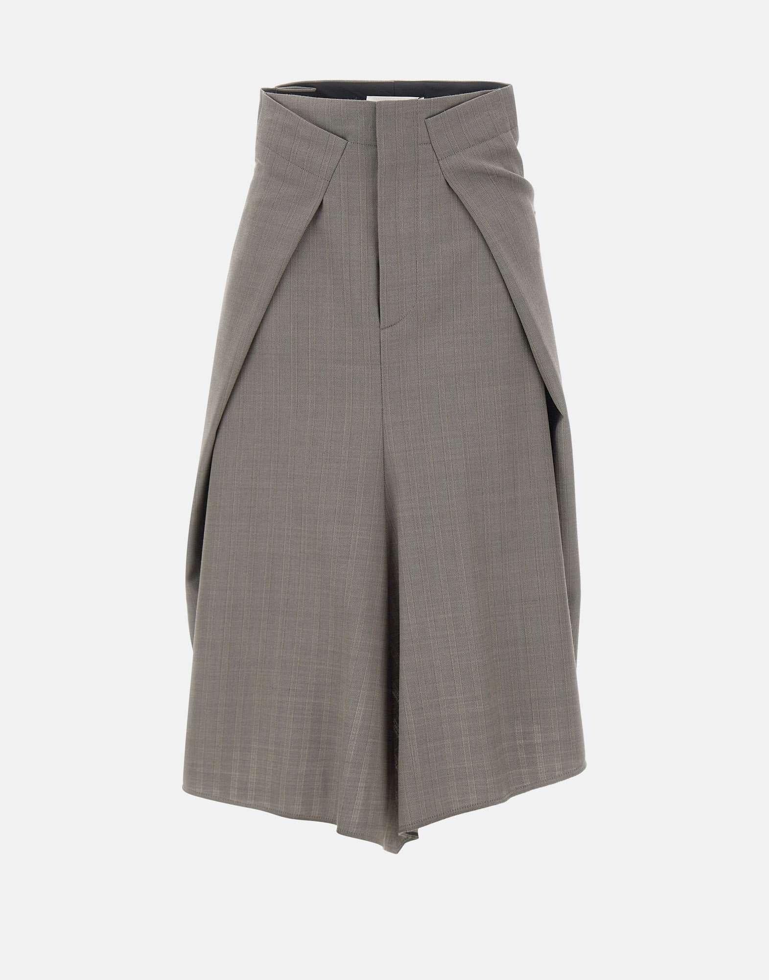 Victoria Beckham women's skirt crafted from grey virgin wool with a subtle texture, designed for a sophisticated and contemporary wardrobe. The style features a mid-rise waist and midi length with an asymmetric hem, creating an elegant and modern silhouette. Folded front panels add movement and structure to the design, enhancing its clean aesthetic. The zip, hook, and button closure completes the piece with a refined and functional finish. Regular fit.