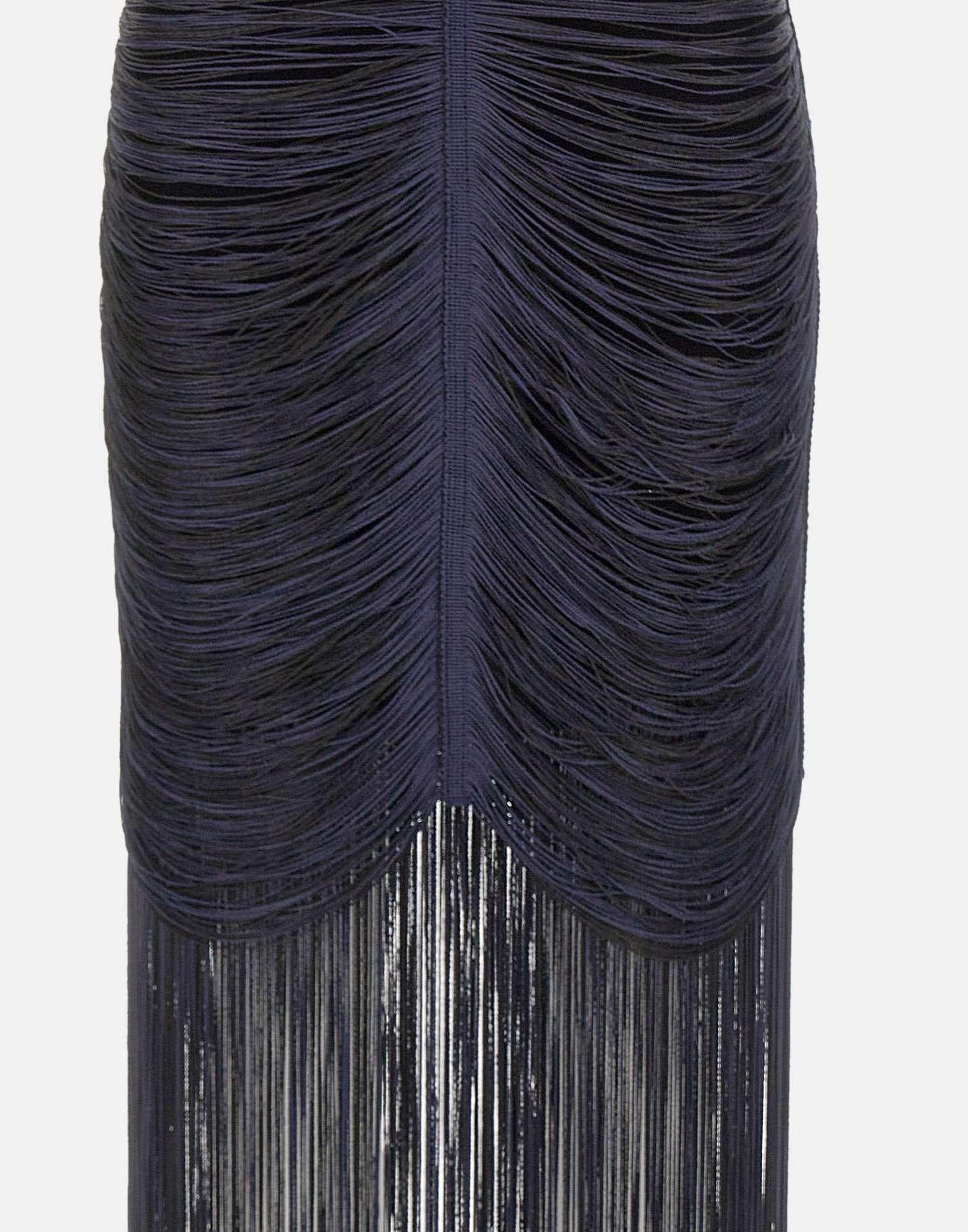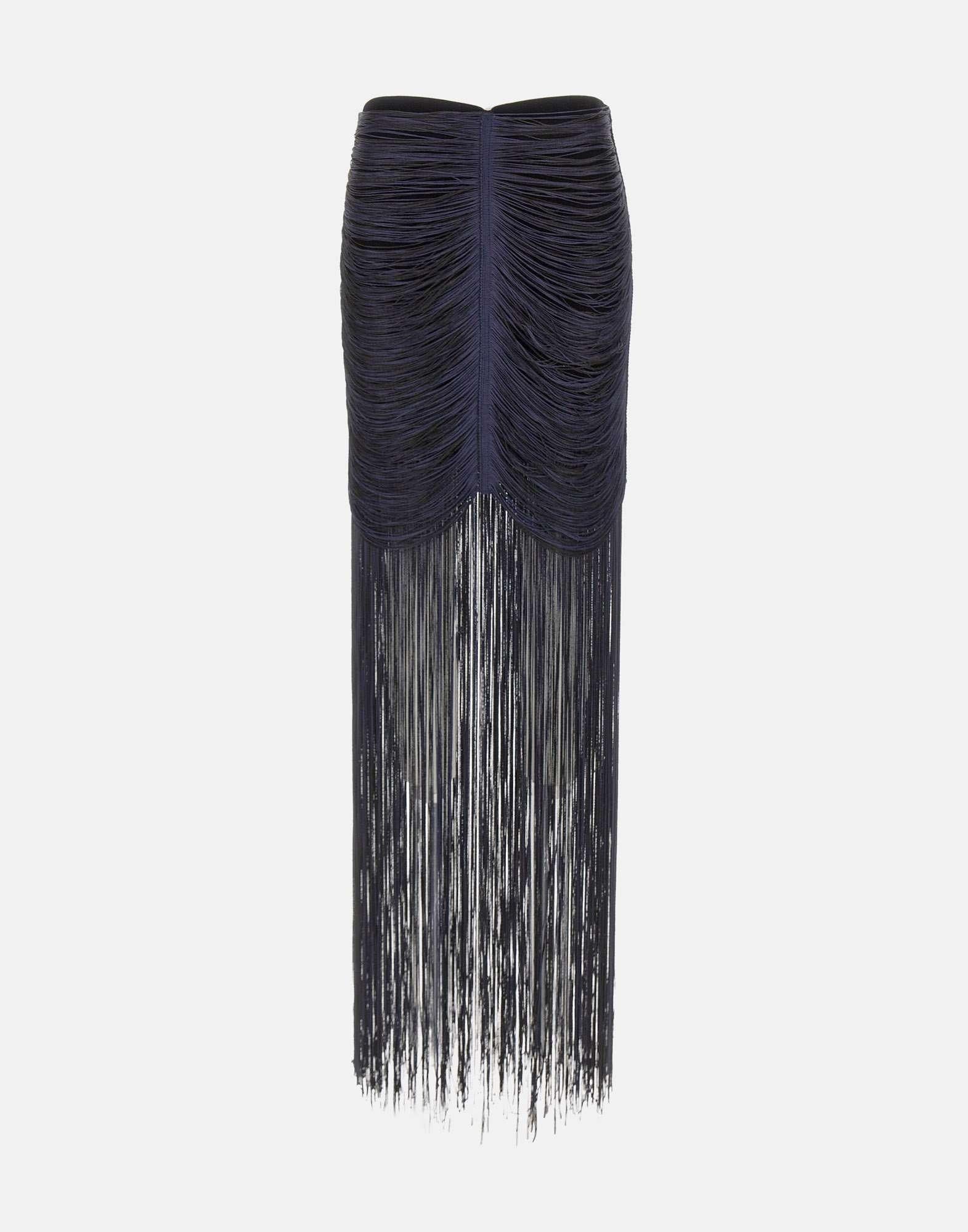 Bless "Ruscello" women's skirt crafted on a black base and embellished with handworked fringes in midnight blue and black tones. The style cinches at the waist and falls gracefully to the floor, creating a fluid and elegant silhouette. Designed for strong visual impact, it moves with a dynamic and sophisticated effect, making it ideal for evening events and elegant dinners. A back zip closure completes this women's long skirt with a discreet and functional detail.