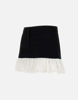 "Noah mini skirt" The Garment, black, stretch wool blend, zip and hook fastening, side French pockets, back pocket with button, balloon-cut insert at hem contrasting fabric, regular fit.