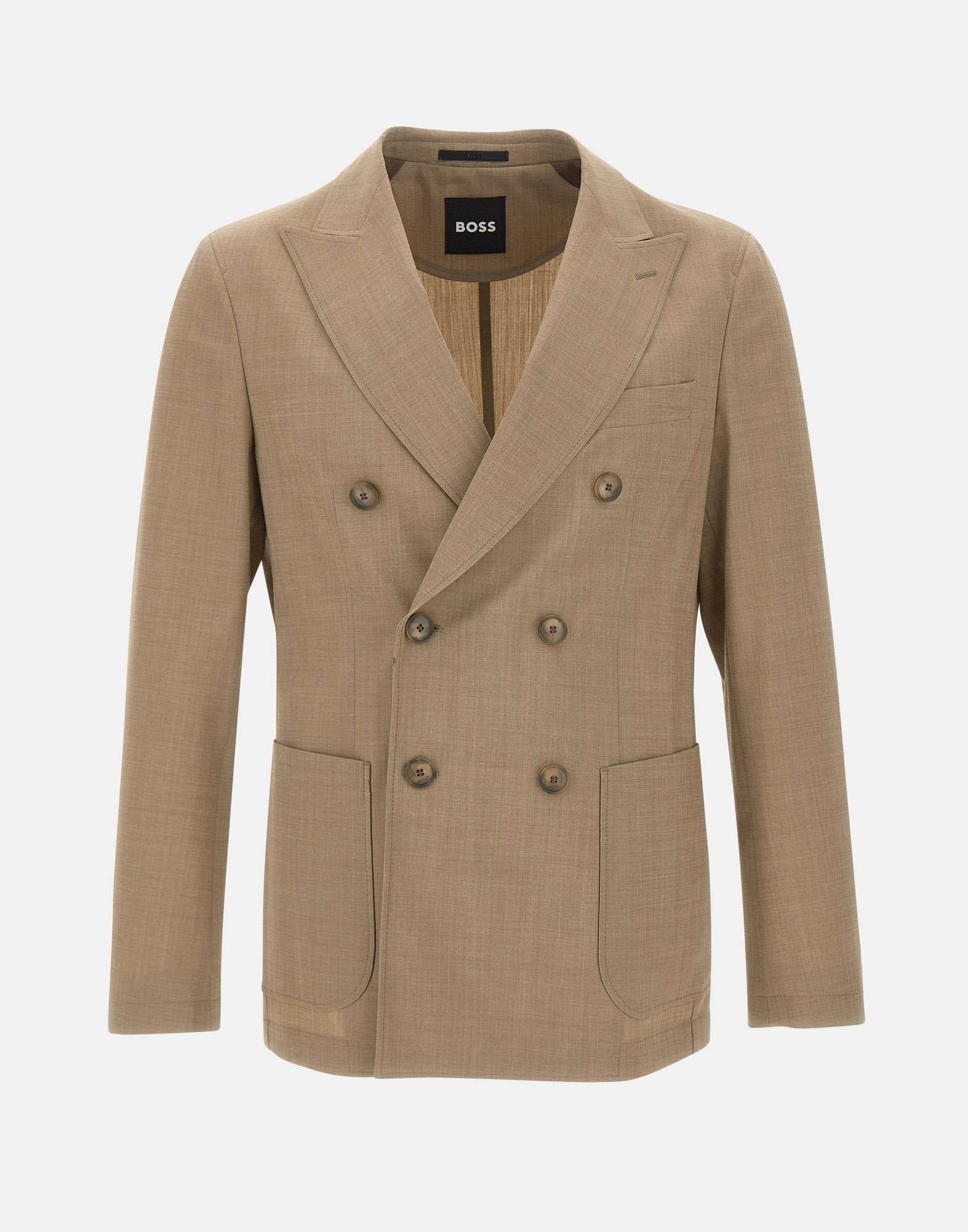 BOSS men's "P-Hanry-DB-WG" blazer in light brown stretch fabric, ideal for a range of formal occasions with a modern edge. Crafted from breathable high performance wool blend, it features a relaxed fit with structured shoulders for a contemporary, refined silhouette. The double breasted front is detailed with two side pockets, a chest welt pocket, and back side vents for added comfort and ease.
