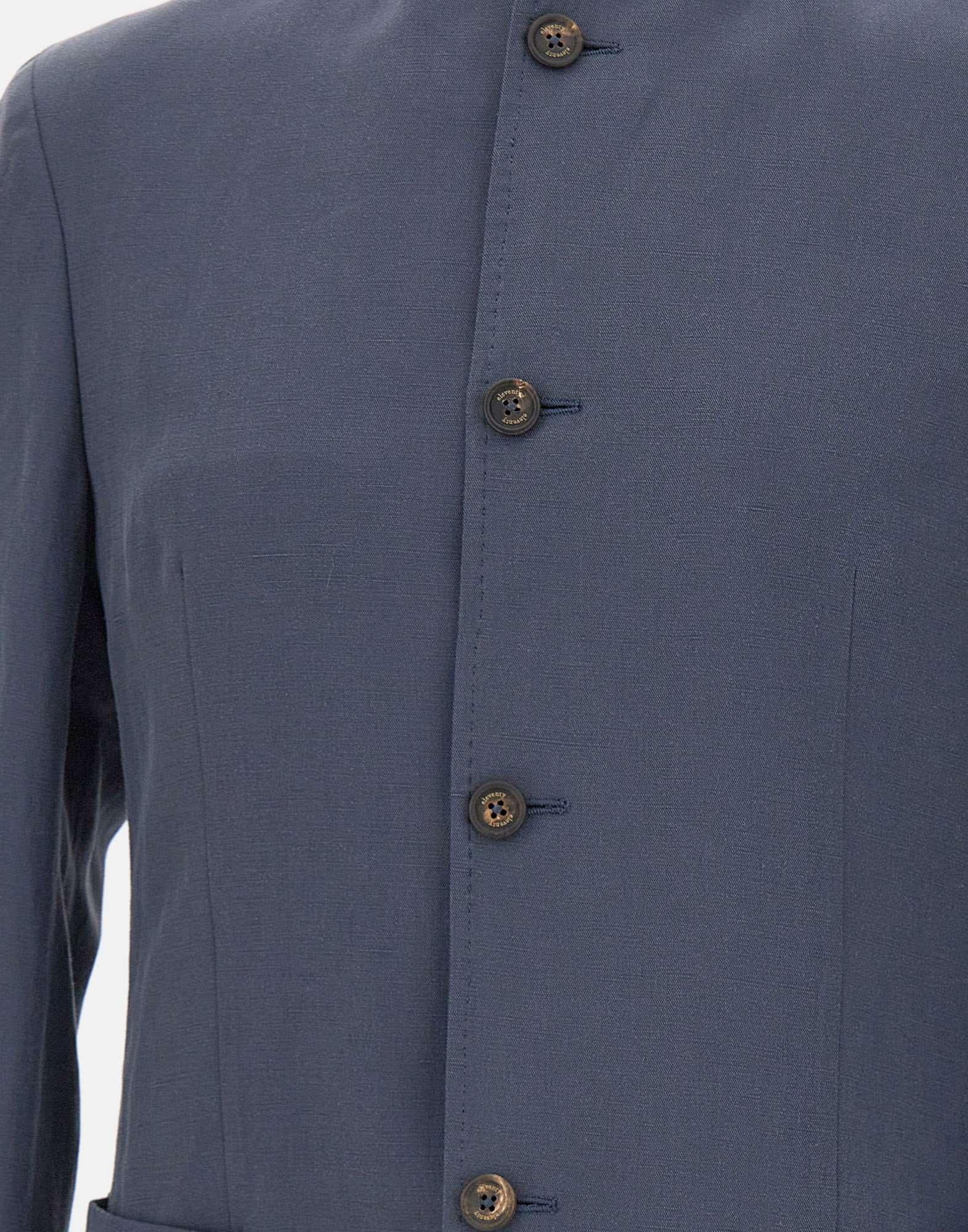 Men's Eleventy blazer crafted from a blue linen blend, defined by a refined Korean collar that adds a modern touch. Features a front fastening with four contrasting branded buttons, two front patch pockets, and darts that shape the silhouette with balance. Finished with double back vents and adjustable buttoned cuffs for comfort and versatility. The regular fit makes it perfect for elegant yet relaxed warm-weather looks. Made in Italy.