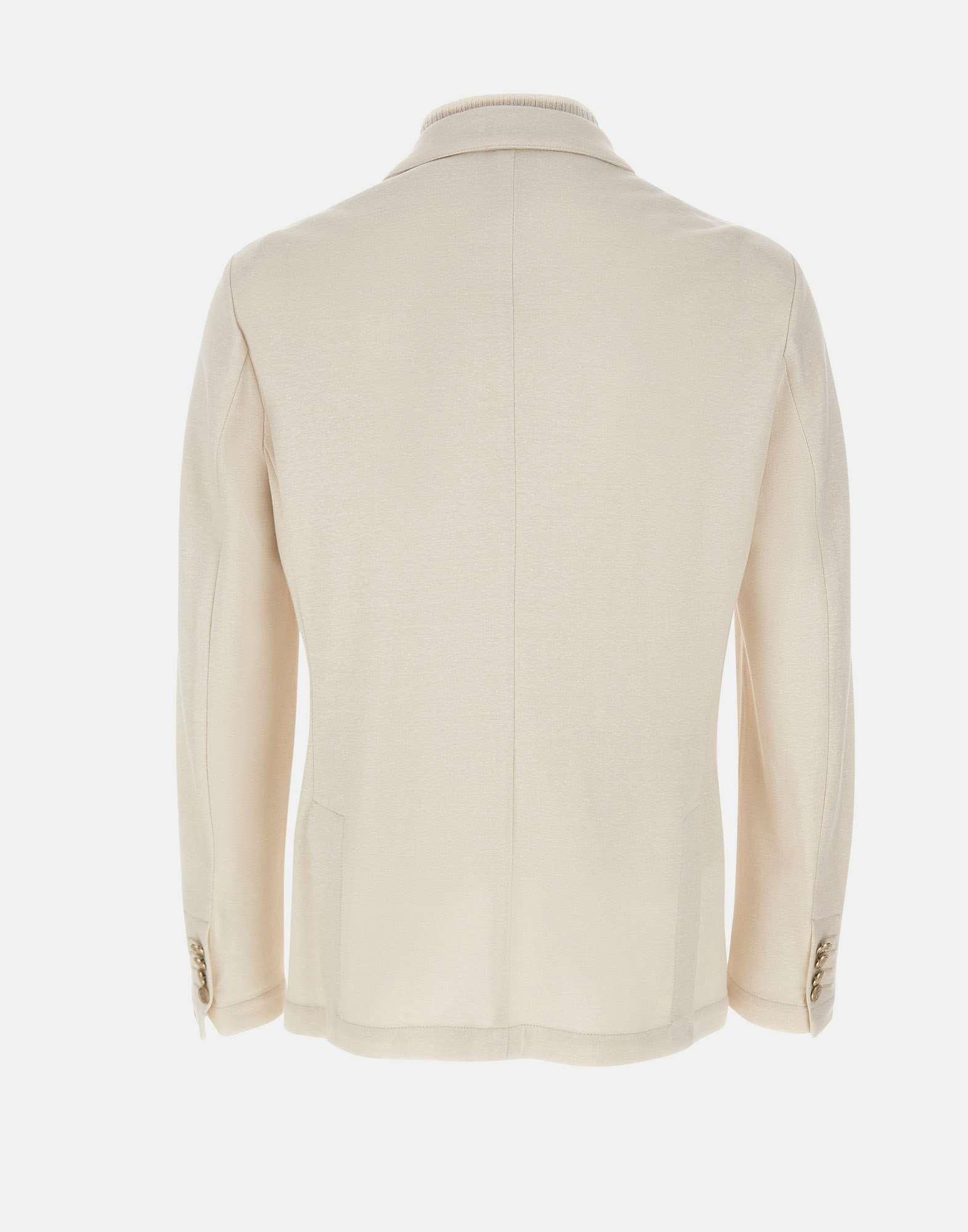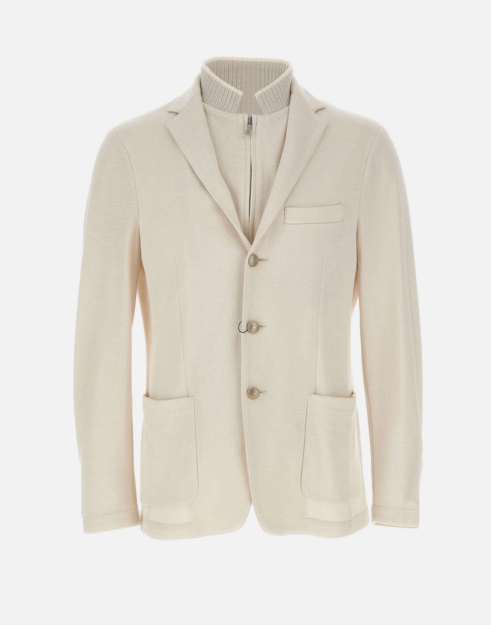 Eleventy men's blazer crafted from a cotton and linen blend in light beige, defined by a refined single-breasted design with a contemporary attitude. The style is enhanced by a detachable jersey bib with a ribbed stand collar and a two-way zip closure, a detail that adds versatility and functionality. The elasticity of the knit and jersey fabrics ensures a comfortable fit that adapts naturally to the body while maintaining a polished look. The design is completed by two patch pockets, cuffs finished with four buttons and a double back vent, reflecting the brand's tailored craftsmanship. Made in Italy.