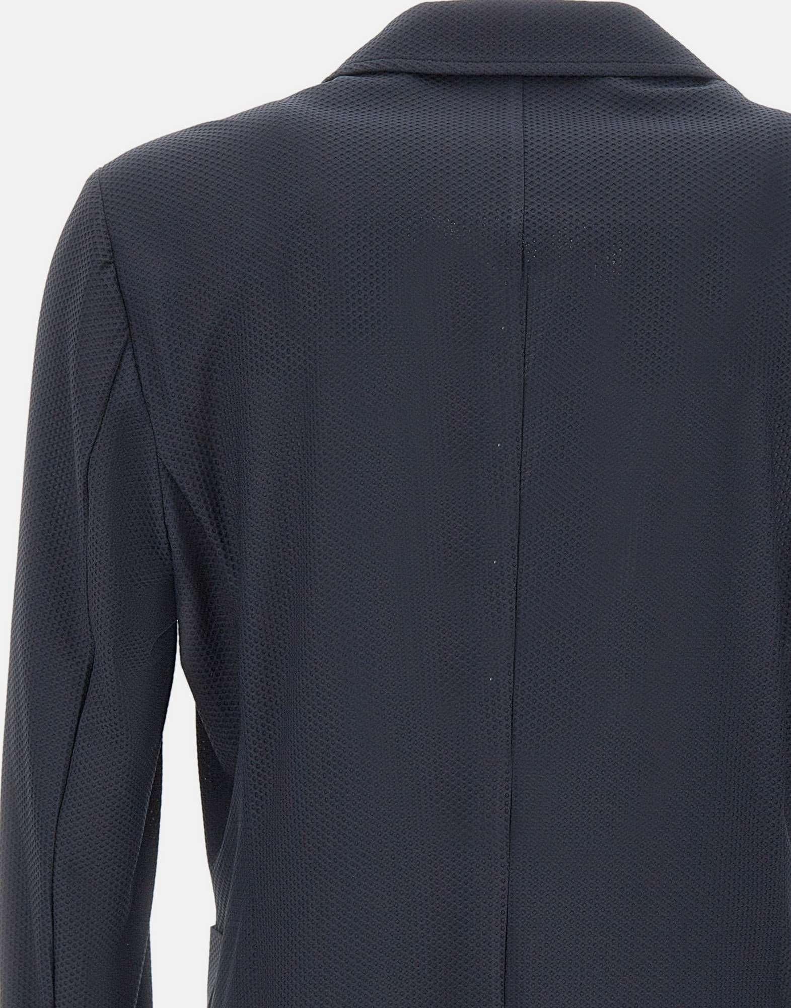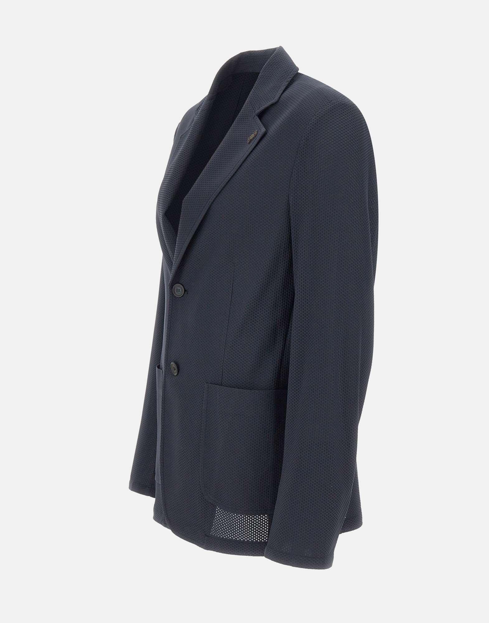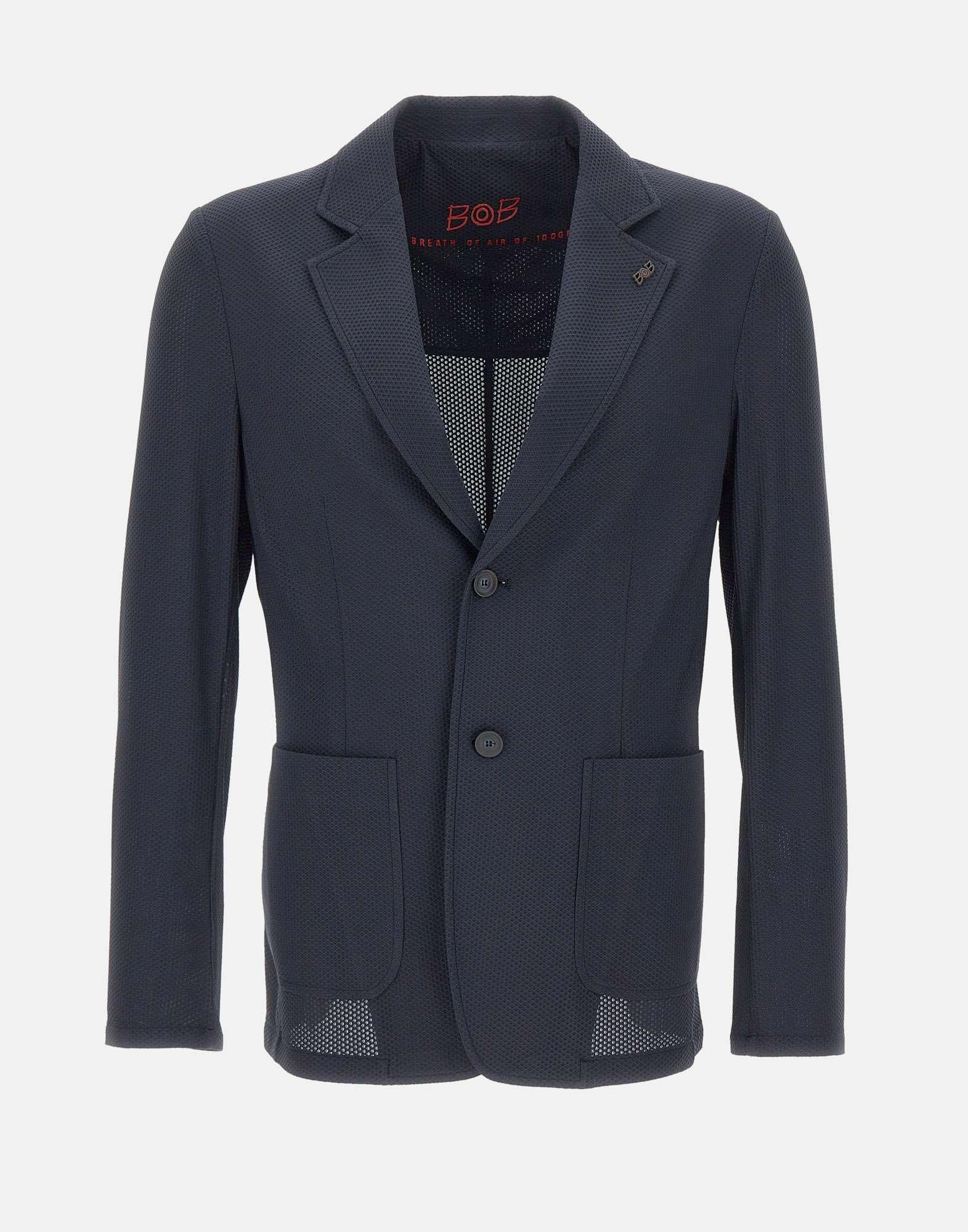 Bob "Golden" blazer crafted in soft and lightweight navy blue mesh fabric, a contemporary piece designed to combine elegance with practicality. This single-breasted two-button style features a classic lapel enhanced by a logo pin and two front patch pockets that add a refined yet relaxed touch. The unlined construction makes this blazer especially light and comfortable, ideal for warmer seasons and a dynamic lifestyle. The slim fit enhances the silhouette, while the matching travel pouch allows the blazer to be easily stored during trips.