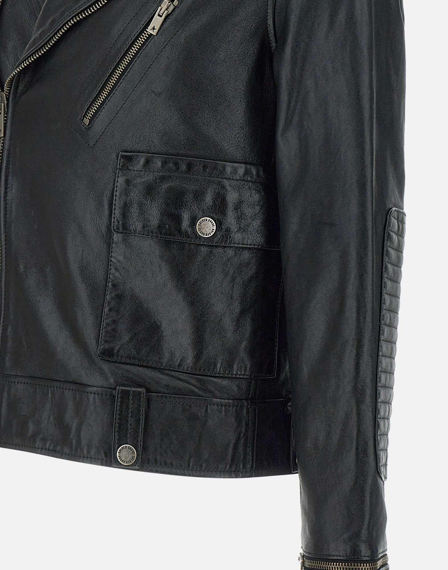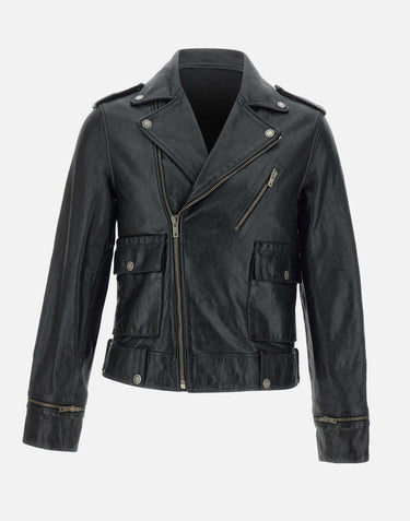 Golden Goose ‘Norwood’ men's coat sheepskin, black, Journey Collection, inspired by energy of Nineties, collar with lapels, shiny effect on shoulders and cuffs, zip fastening, flap pockets with logoed buttons on front, slanted pocket with zip on chest, lined, regular fit, made in Italy