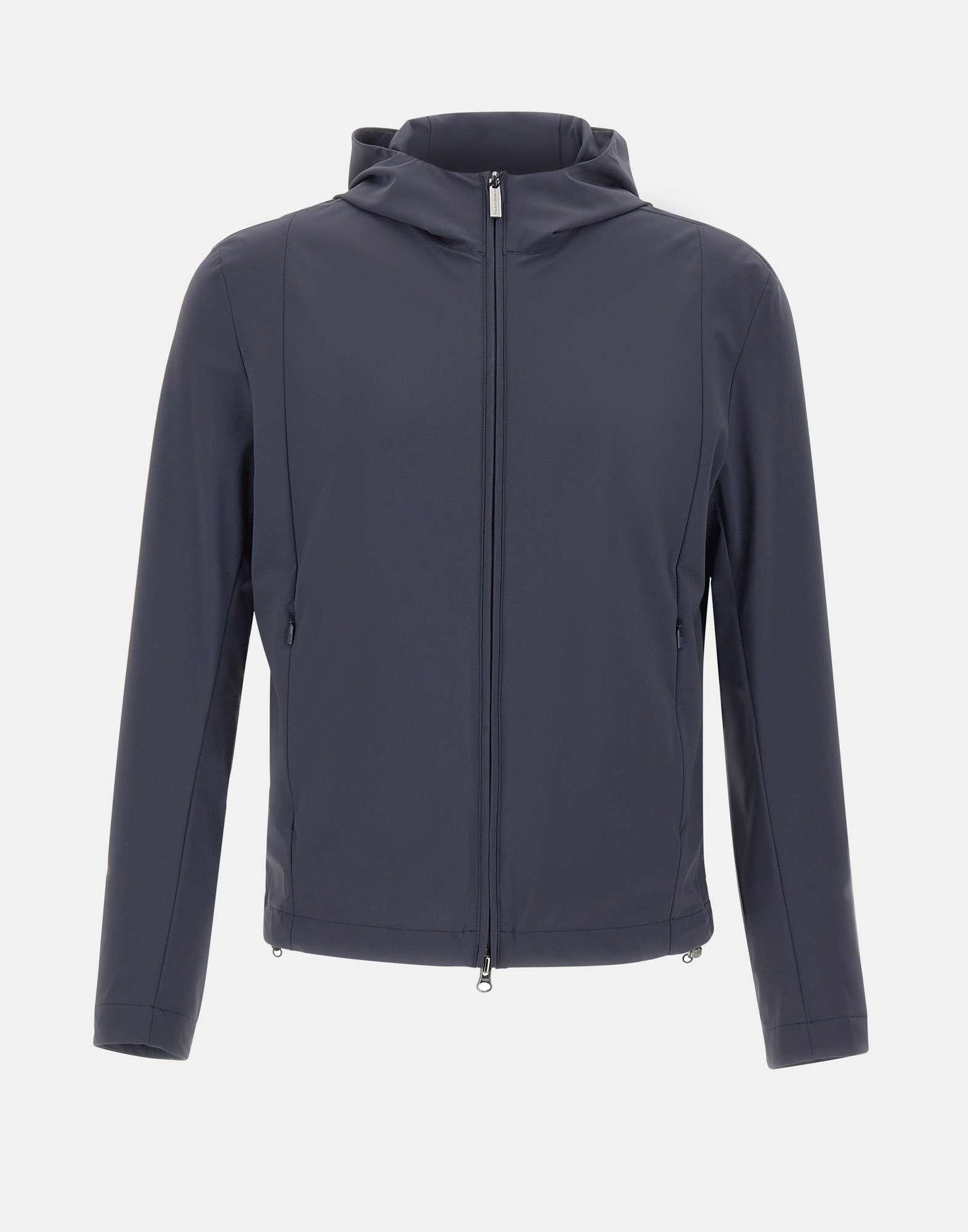 Colmar Originals men's jacket crafted from dark blue stretch microfiber jersey, designed to deliver comfort and freedom of movement in a clean and contemporary silhouette. The style features a hood, a two-way zip closure and side pockets with concealed zip, functional details that enhance its practicality for everyday wear. The adjustable drawstring at the hem allows for a more personalized fit, while the tone-on-tone logo with glossy finish on the left sleeve creates an elegant contrast against the matte fabric, adding a distinctive yet understated touch. Regular fit.