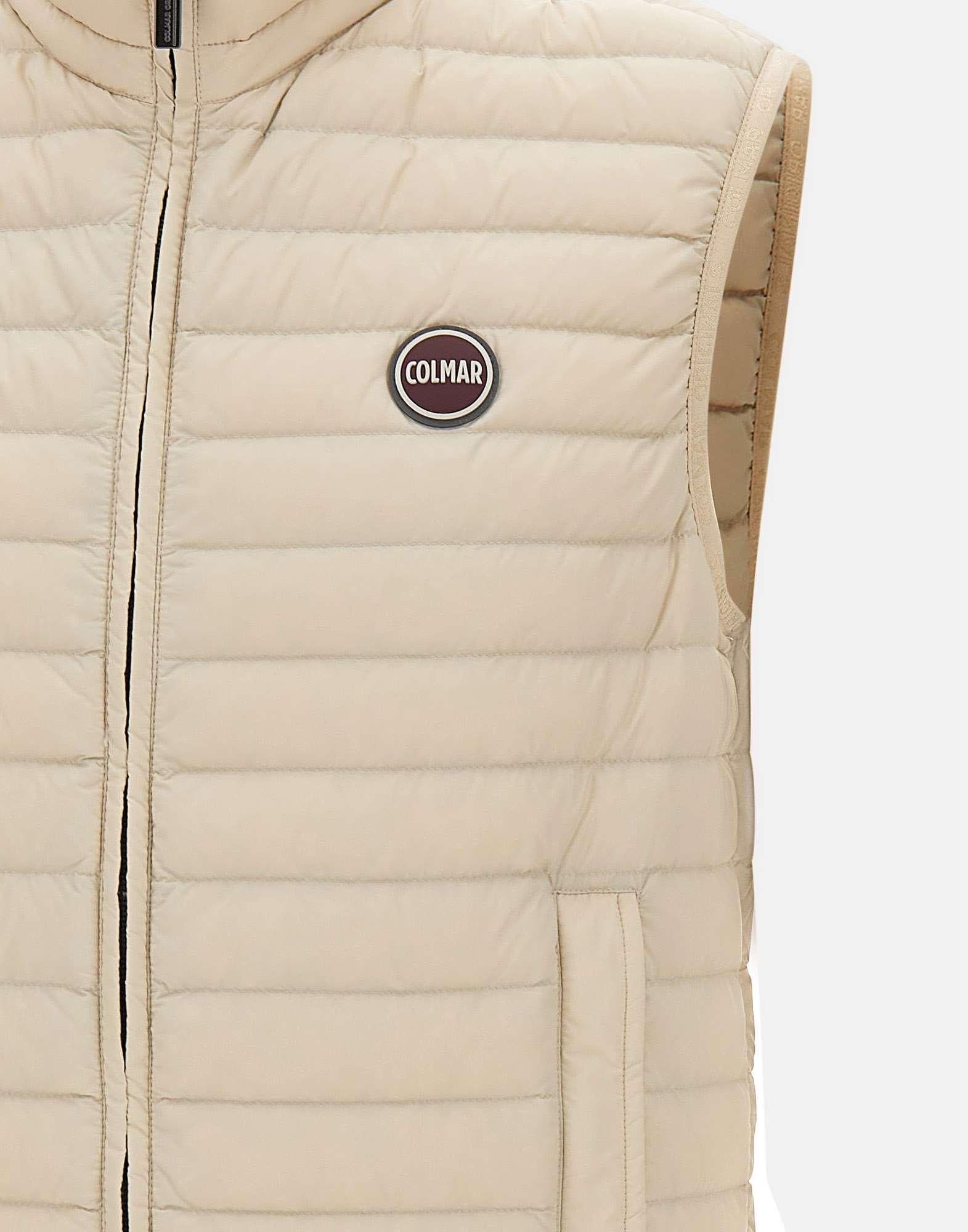 Colmar Originals men's gilet crafted from light beige nylon with light natural down padding certified RDS and horizontal quilting, designed to provide comfort and protection in an essential and versatile silhouette. The style features a two-way zip closure, side zip pockets and an internal zip pocket, functional details that enhance everyday practicality. The adjustable drawstring at the hem allows for a more personalized fit, while the iconic rubber logo on the chest and back adds a distinctive brand signature. Regular fit.