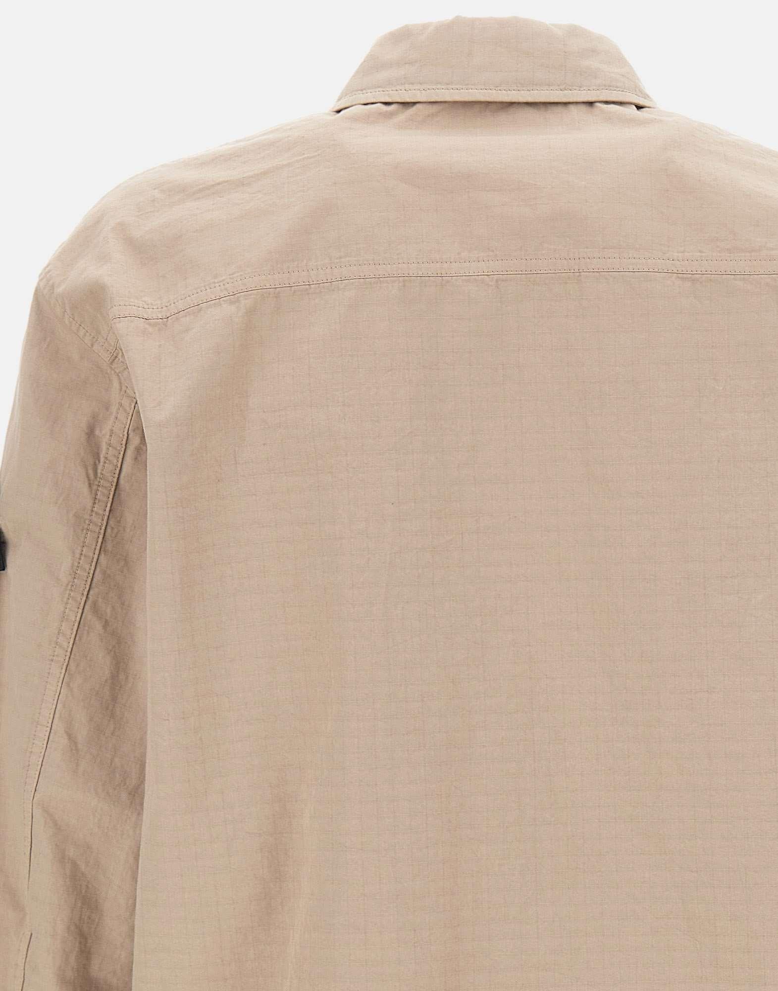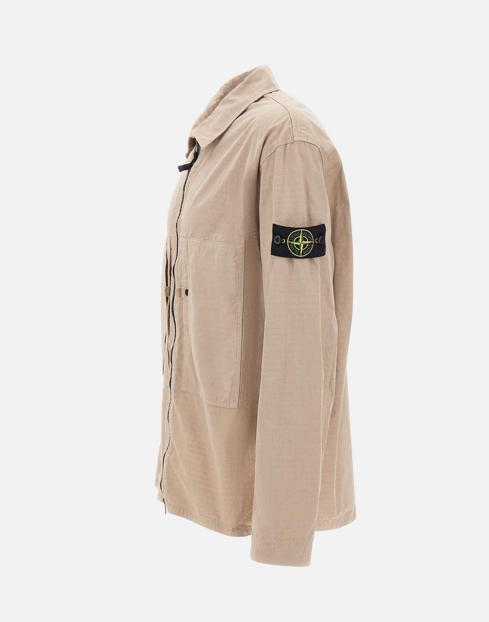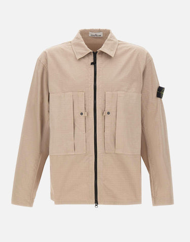 Stone Island men's overshirt jacket crafted from mercerized organic cotton ripstop in beige, combining durability with a modern aesthetic. Garment dyed for a distinctive, rich color finish. Features chest pockets with pleat detail, adjustable cuffs with snap button, and a contrasting black double-slider zip closure at the front. Finished with the iconic logo patch on the left sleeve secured with buttons. Ideal as a lightweight men's jacket for seasonal layering.