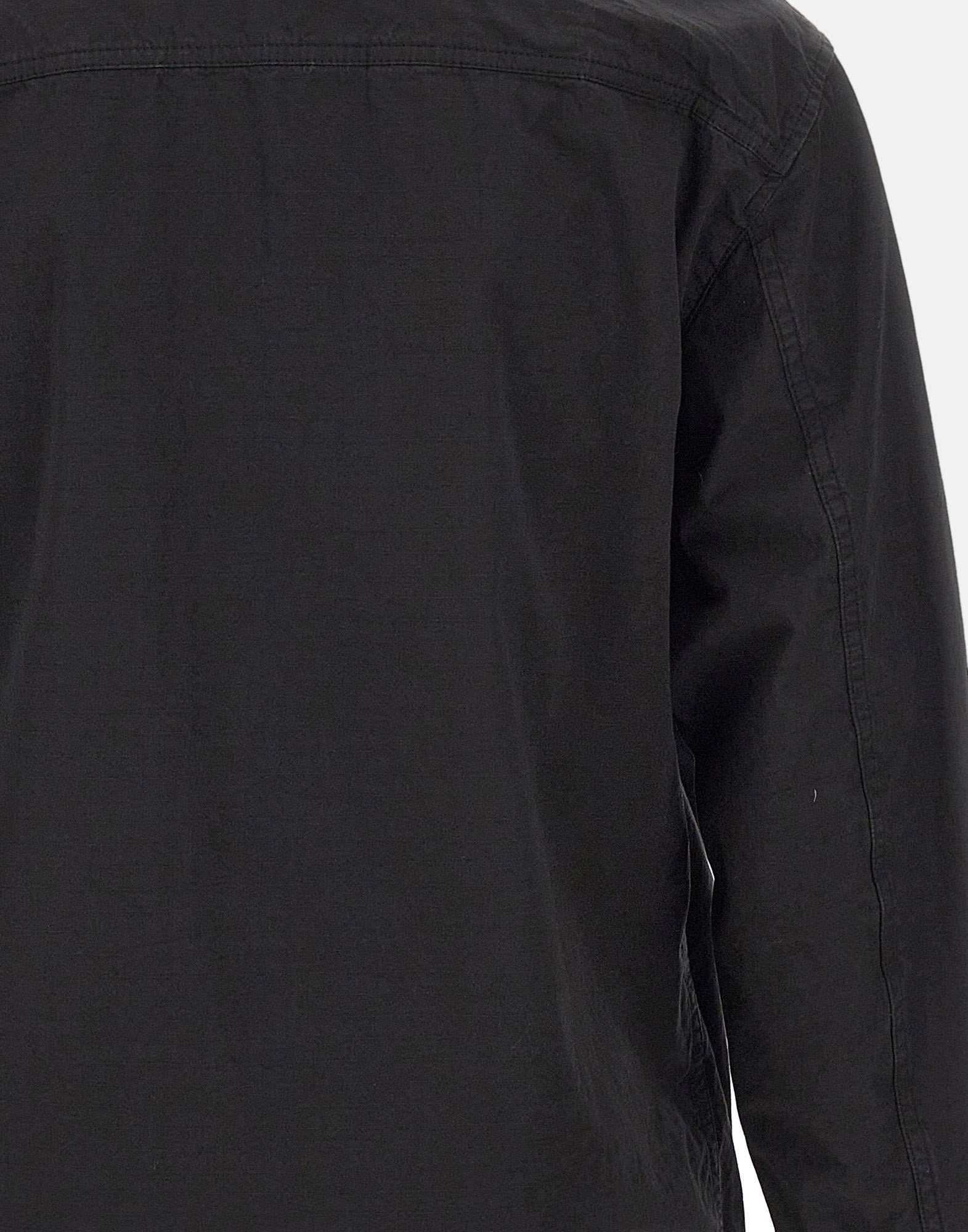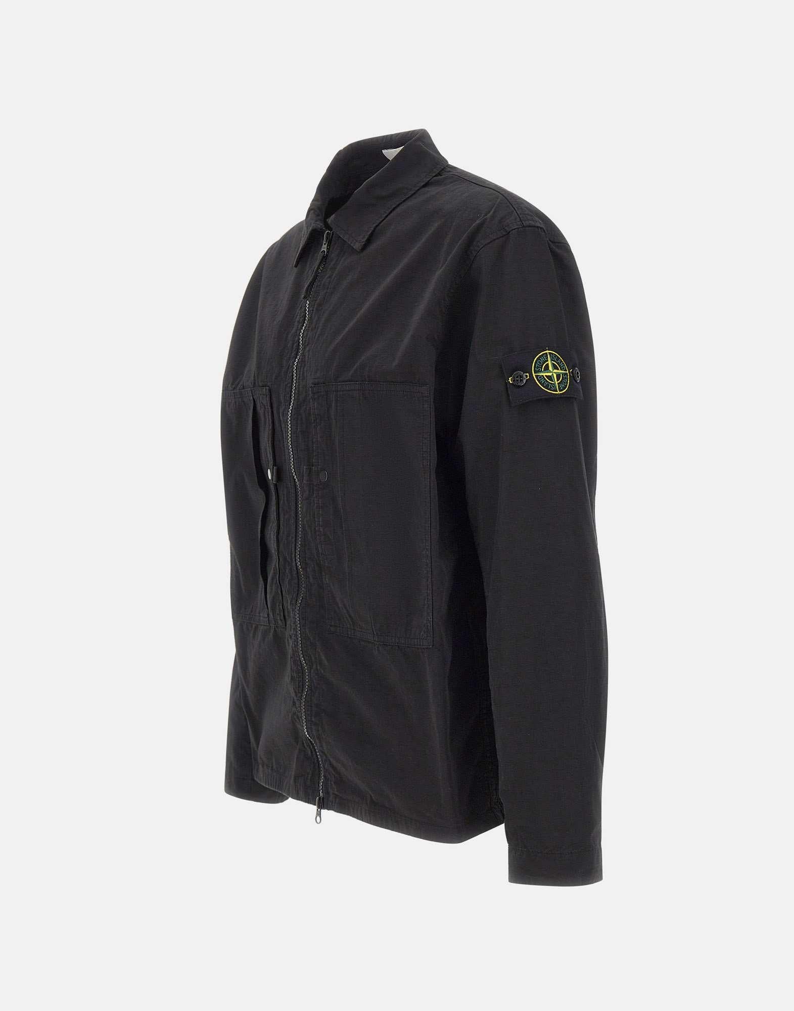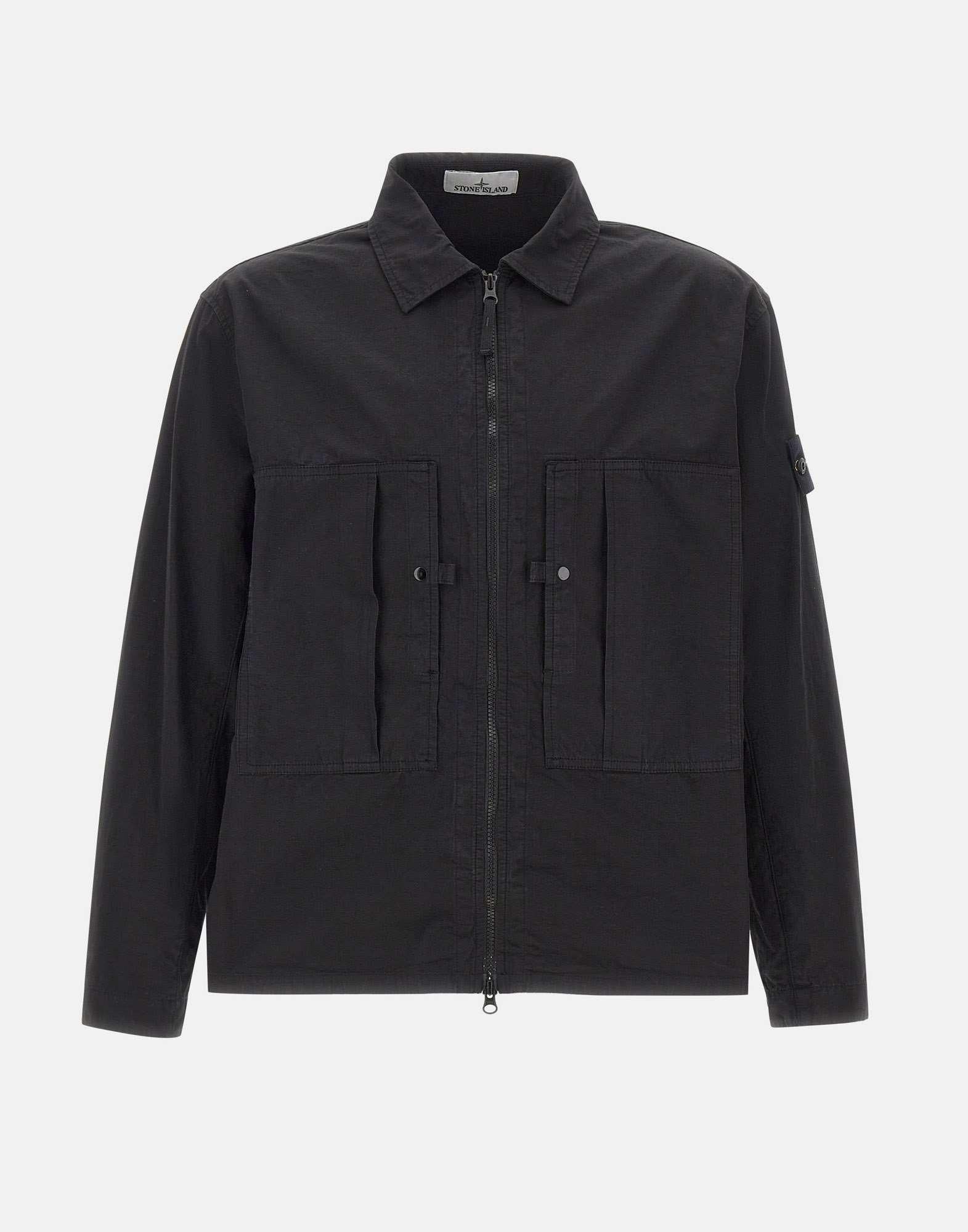 Stone Island men's overshirt jacket crafted from mercerized organic cotton ripstop in black, combining durability with a modern aesthetic. Garment dyed for a distinctive, rich color finish. Features chest pockets with pleat detail, adjustable cuffs with snap button, and a contrasting black double-slider zip closure at the front. Finished with the iconic logo patch on the left sleeve secured with buttons. Ideal as a lightweight men's jacket for seasonal layering.