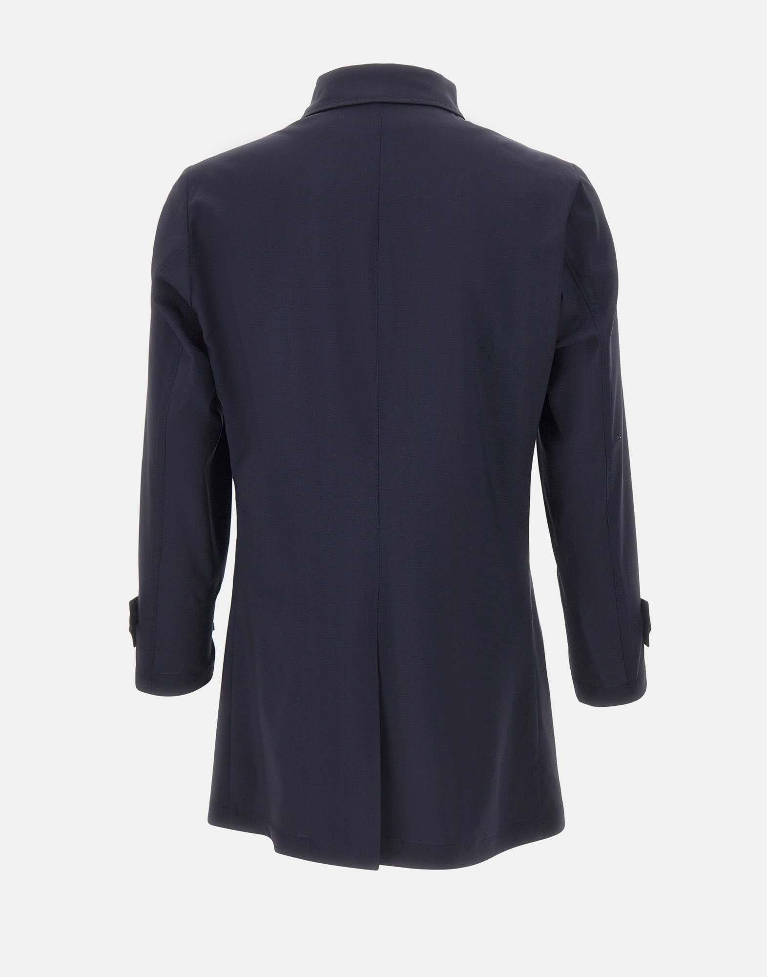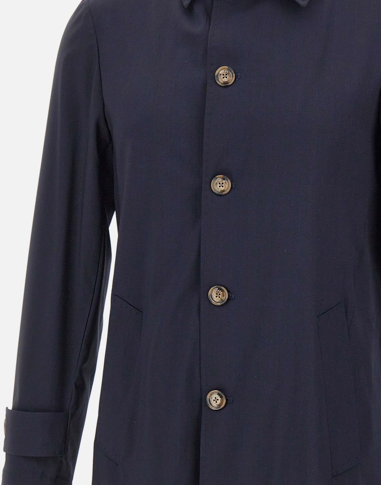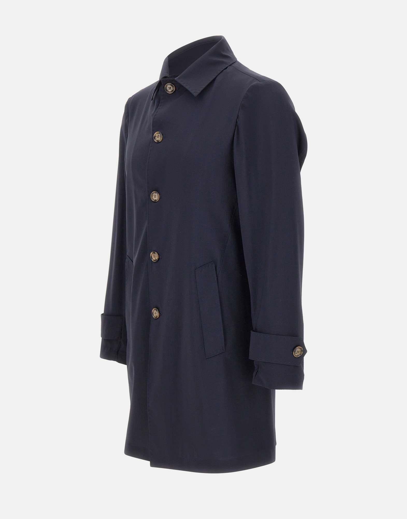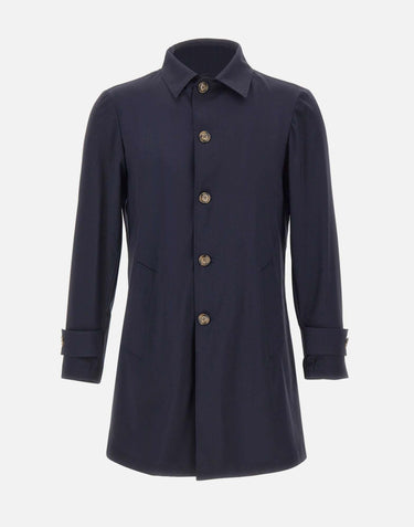 Barba "Bristol" men's trench coat crafted from soft dark navy virgin wool, designed for clean, timeless elegance. It features a straight cut and a regular fit, perfect to elevate both formal and everyday looks with a tailored touch. Welt side pockets and a contrast fastening with branded tortoiseshell buttons define the style, while cuff tabs with button add a refined detail. Classic collar and a center back vent ensure comfort and ease of movement. Made in Italy.