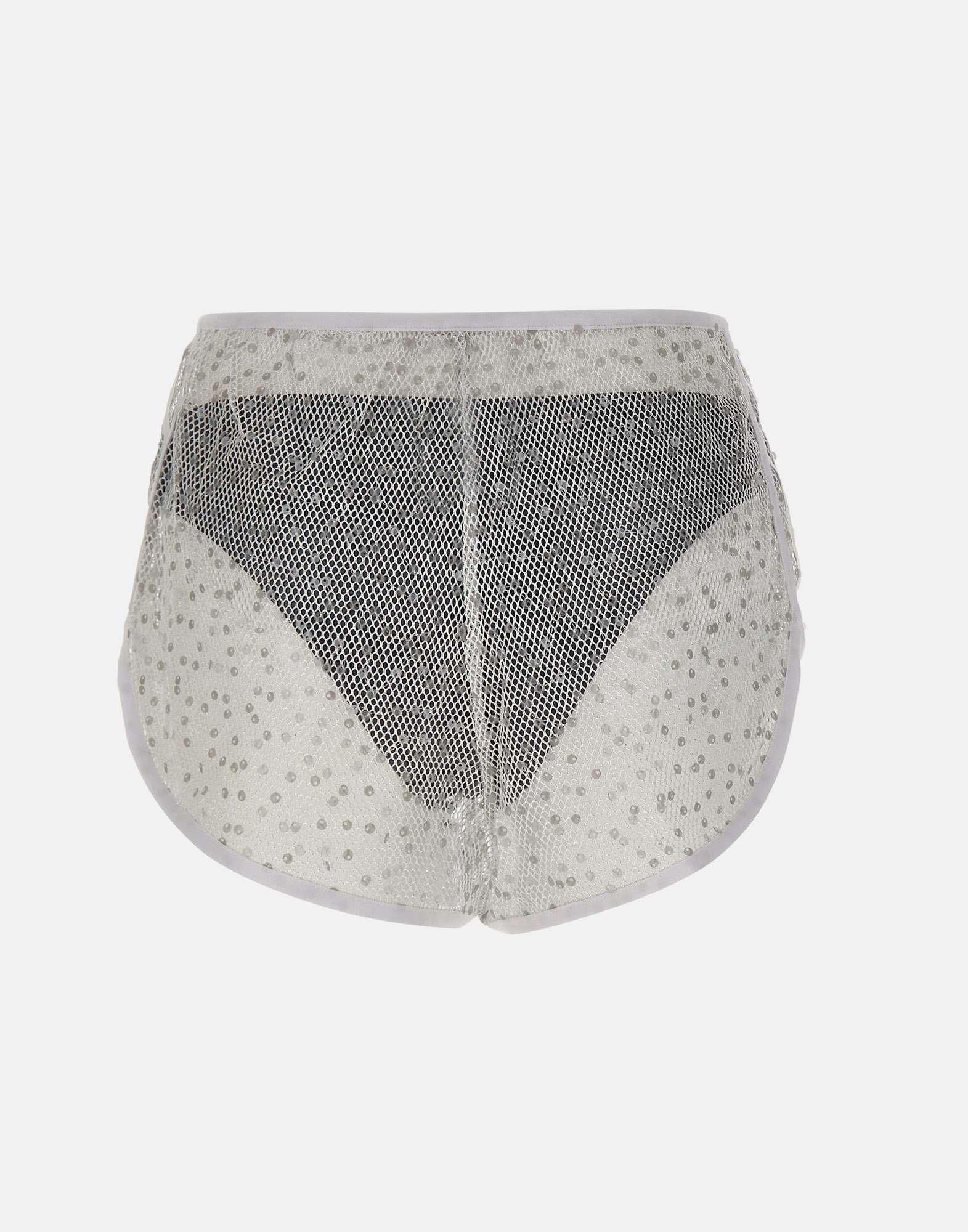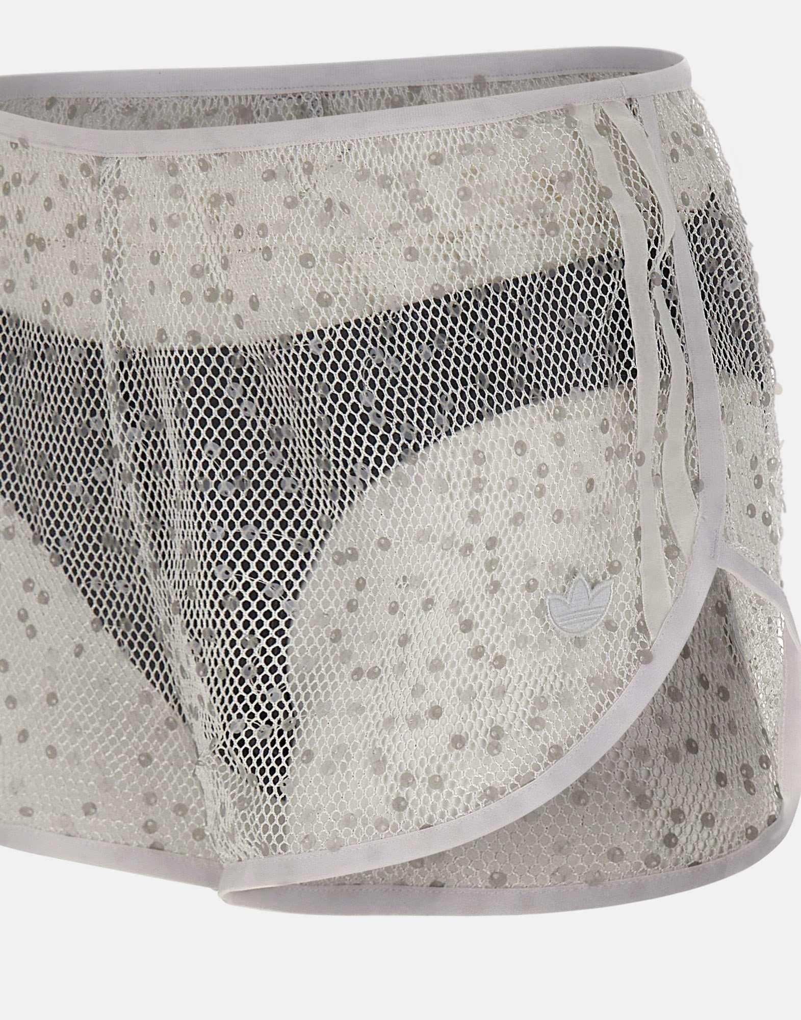 Women's Adidas "Sunset Rhythms" shorts crafted from white stretch fabric with an open woven construction that creates a sheer effect, enhanced by shimmering sequins. Designed with side stripes and an applied logo at the hem for a signature sporty touch. The style includes an integrated dark grey underwear for coverage and comfort, finished with a contrasting embroidered logo on the back. A bold, statement piece made for standout contemporary looks.