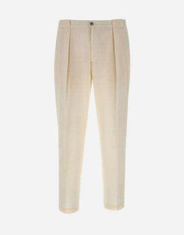 Briglia 1949 "Portobellos" men's trousers in white wool-blend bi-stretch fabric, crafted with Marzotto EarthEarth materials and part of the Racconta la Sartoria line. They feature a regular, partially elasticated waistband with belt loops, a zip fastening with a tone-on-tone branded button, side welt pockets, and a double front pleat that enhances the tailored structure. Back pockets with branded buttons complete the design. The regular easy fit offers comfort and refined style. Hem width: 18 cm. Hand wash. Made in Italy.