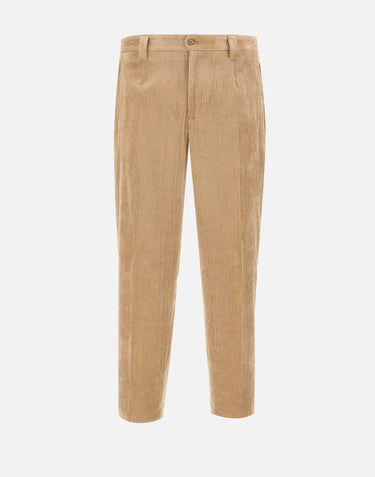 Briglia 1949 "Portofinos" men's trousers in beige velvet, blending retro inspiration with contemporary tailoring from the Racconta la Sartoria line. Crafted with a soft, velvety texture, they feature a classic cut enhanced by refined details. Designed with two slanted side pockets, two back welt pockets, a zip and button closure, and belt loops for a structured, versatile fit. The wide 20 cm hem adds balance to the silhouette, making them ideal for sophisticated outfits from office to leisure. Made in Italy.