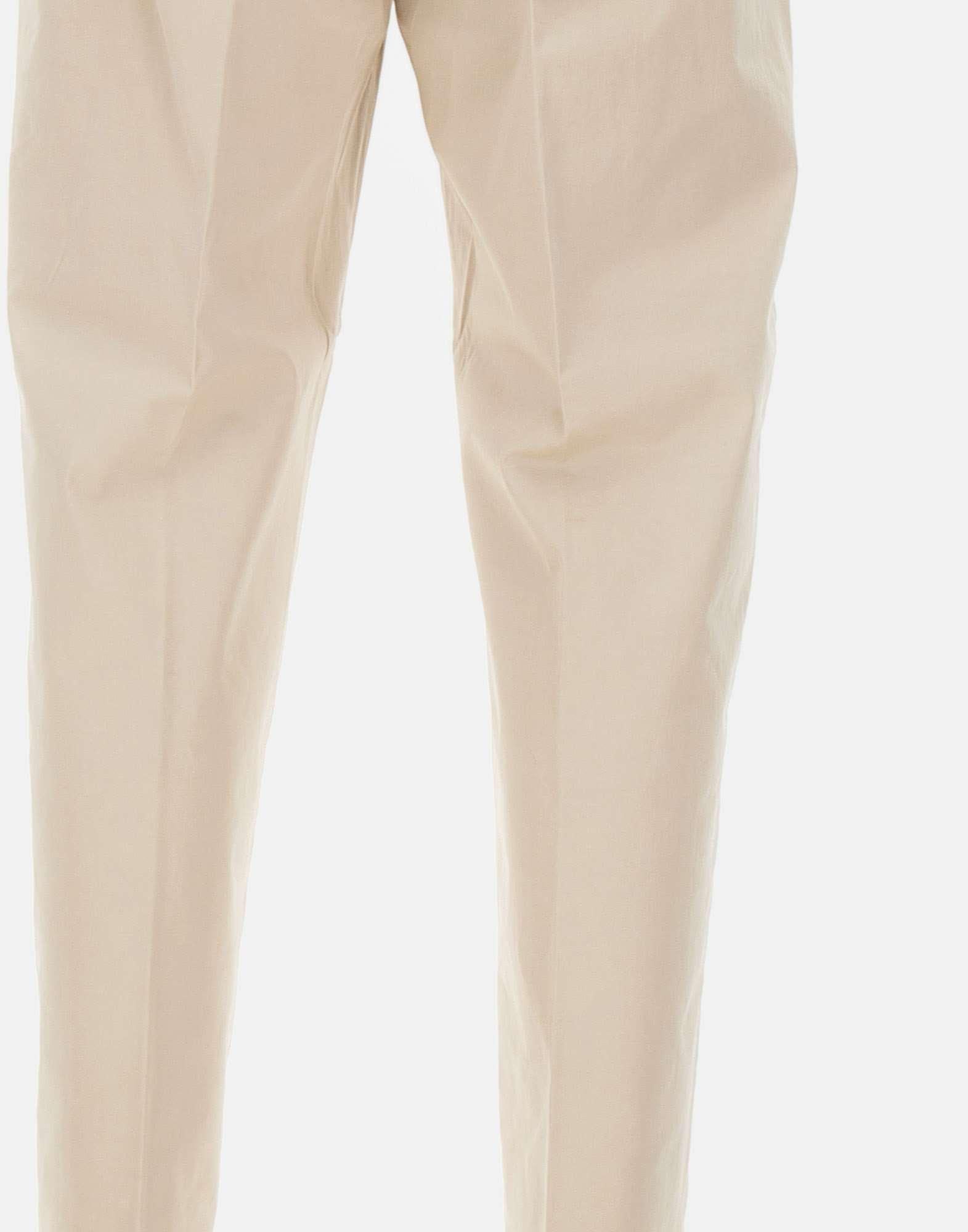 Men's Eleventy trousers crafted from light beige cotton, designed to combine comfort with a refined contemporary look. Feature an elasticated waistband with zip, button, and drawstring fastening for an adjustable and practical fit. Finished with Italian front pockets, back flap pockets with hidden button, and belt loops. The straight leg silhouette ensures a clean and versatile line. Regular fit. Bottom width: 18 cm. Made in Italy.