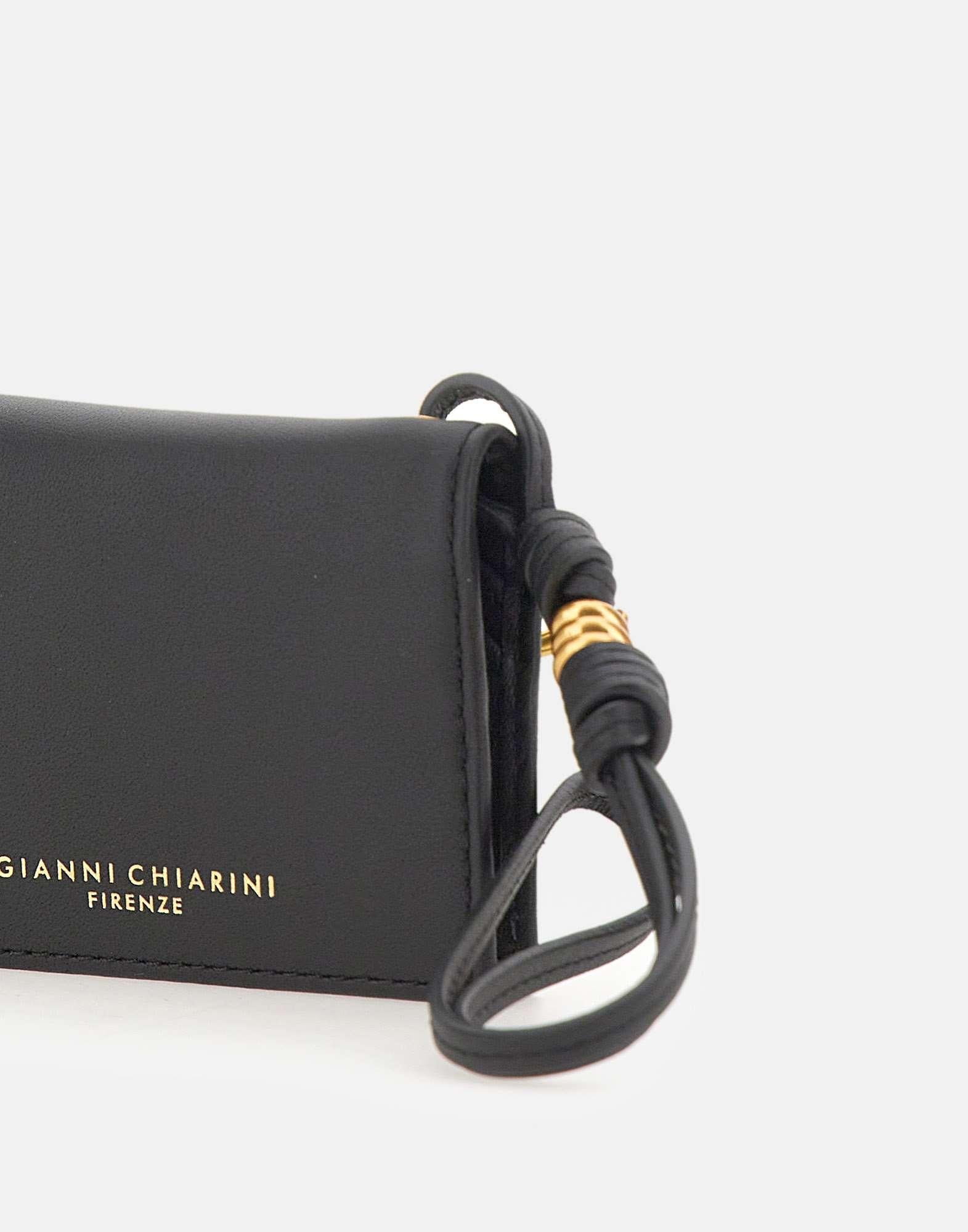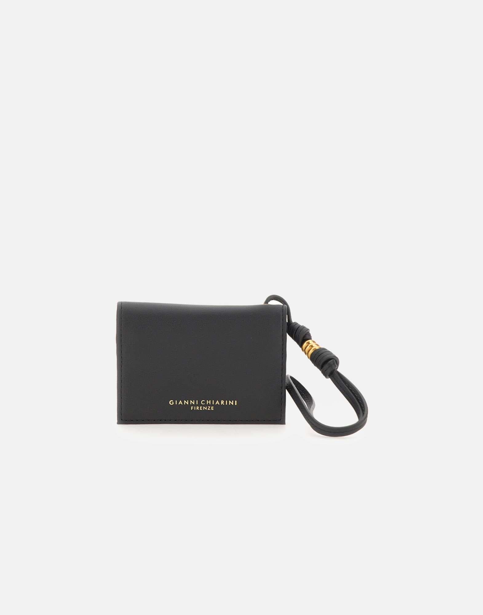 Gianni Chiarini "Nappa" women's card holder crafted from black nappa leather, designed to keep essentials neatly organized. Features a snap-button closure and multiple internal card slots. The exterior is finished with a gold printed logo and a leather wrist strap, embellished with gold-tone details and the brand's iconic knot. Size: 10.5x8x1.5 cm.