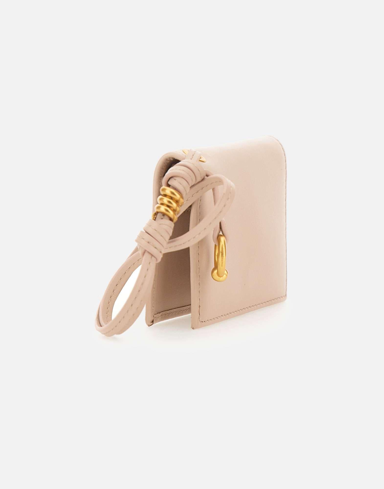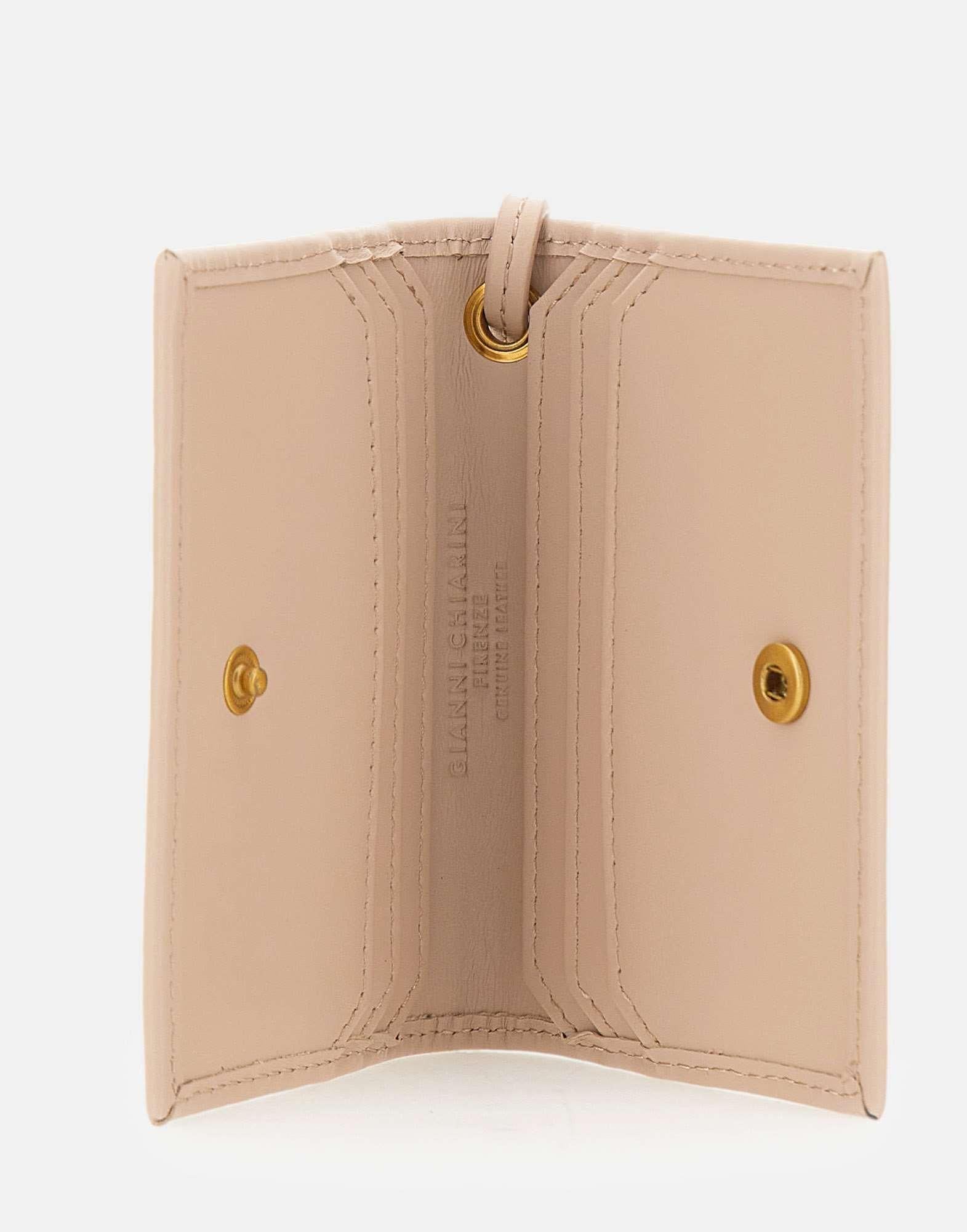 Gianni Chiarini "Nappa" women's card holder crafted from soft nude nappa leather, designed to keep essentials neatly organized. Features a snap-button closure and multiple internal card slots. The exterior is finished with a gold printed logo and a leather wrist strap, embellished with gold-tone details and the brand's iconic knot. Size: 10.5x8x1.5 cm.