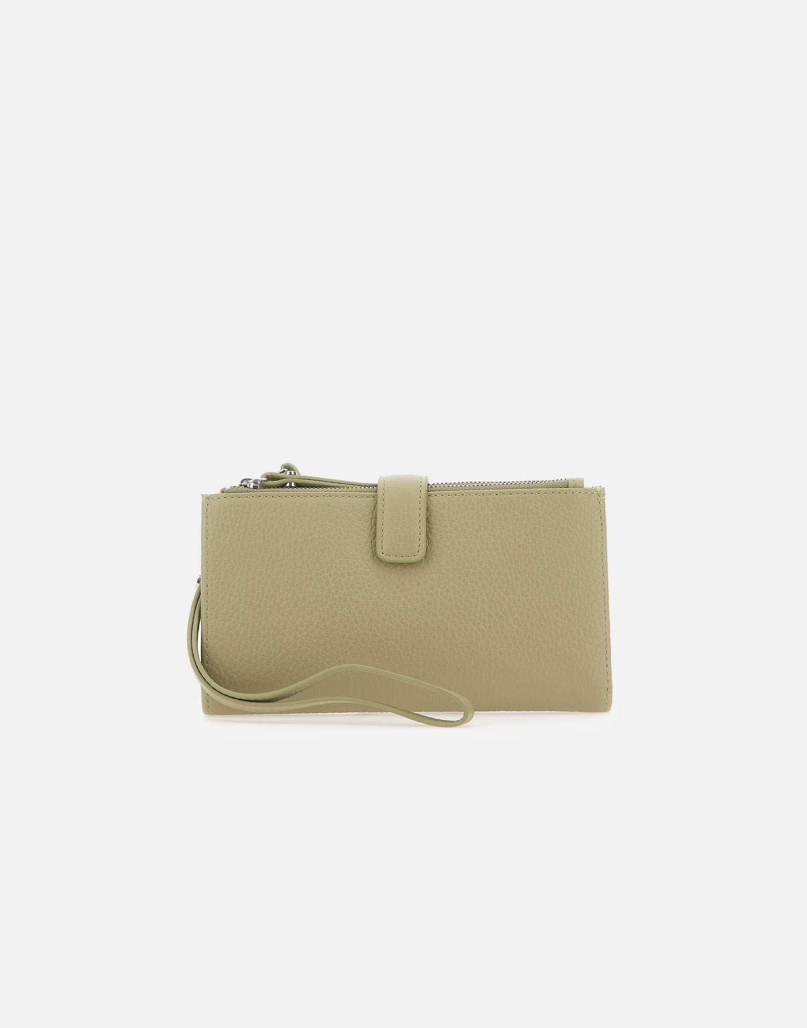 Gianni Chiarini women's wallet "Dollaro" crafted from sage green pebbled leather, combining elegance with everyday practicality. It features a flap with a snap button closure, two zip compartments and a printed exterior logo. Inside, it offers multiple card slots and a bill compartment, plus a phone pocket secured with a flap and snap button. For versatile functionality, it comes with a removable wrist strap and an adjustable, removable shoulder strap, allowing it to be carried in different ways. Size: 18.5x10x3 cm.