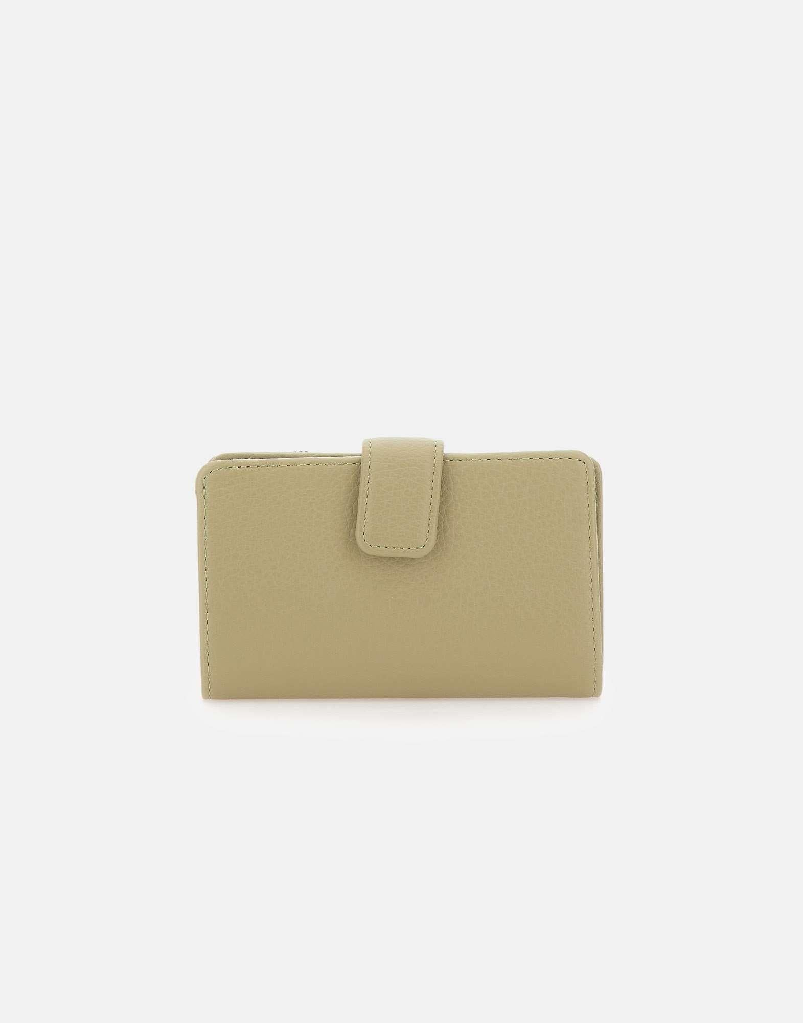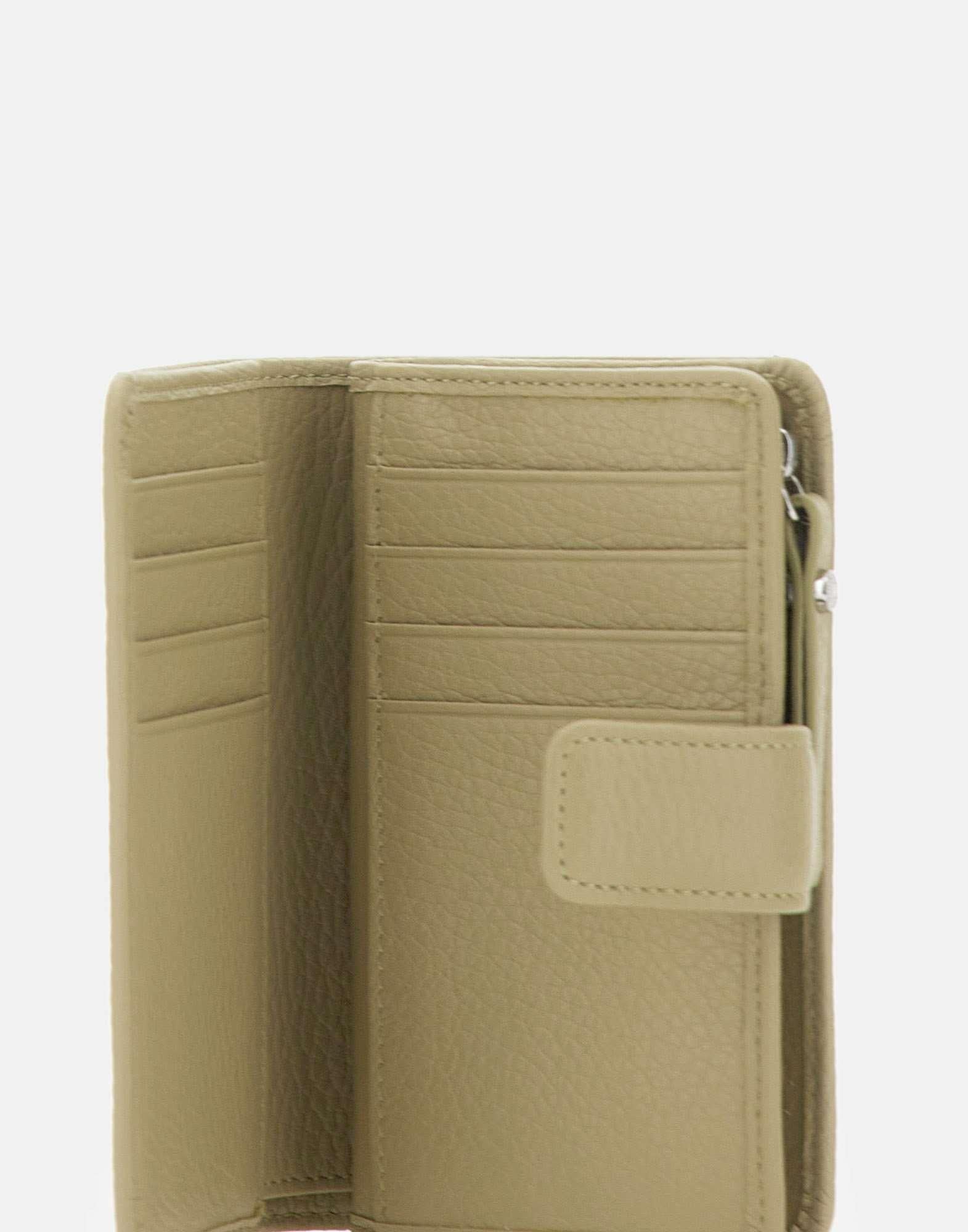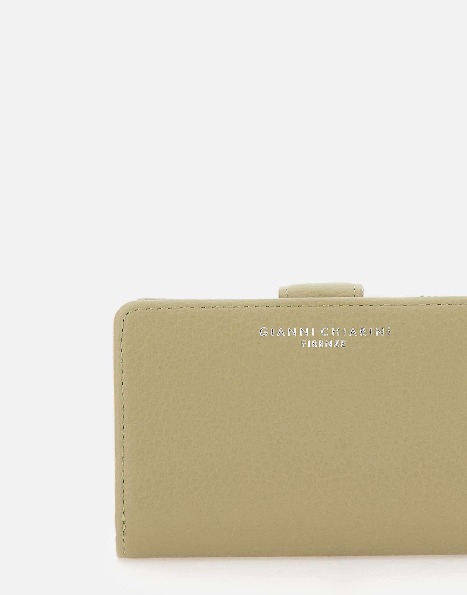 Gianni Chiarini women's wallet "Dollaro" crafted from sage green pebbled leather, a compact accessory for everyday practicality. The tab with a magnetic button closure offers quick, secure access, while a printed exterior logo adds a discreet signature touch. It features a zip pocket revealing two coin compartments, a bill pocket, and multiple slots for credit cards and ID cards for complete organization. Size: 13.5x8.5x3 cm.