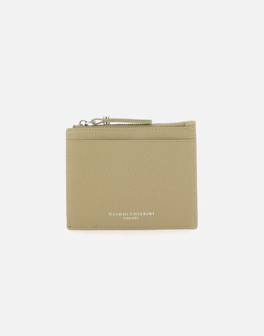 Gianni Chiarini women's wallet "Grain" crafted from sage green pebbled leather, a compact and functional accessory designed for everyday use. A printed exterior logo adds a discreet signature touch. It features a top zip pocket with a tonal zip pull, ideal for keeping small items secure. Multiple card slots on the back and a flat front pocket complete the practical layout. Size: 13x10x1.5 cm.