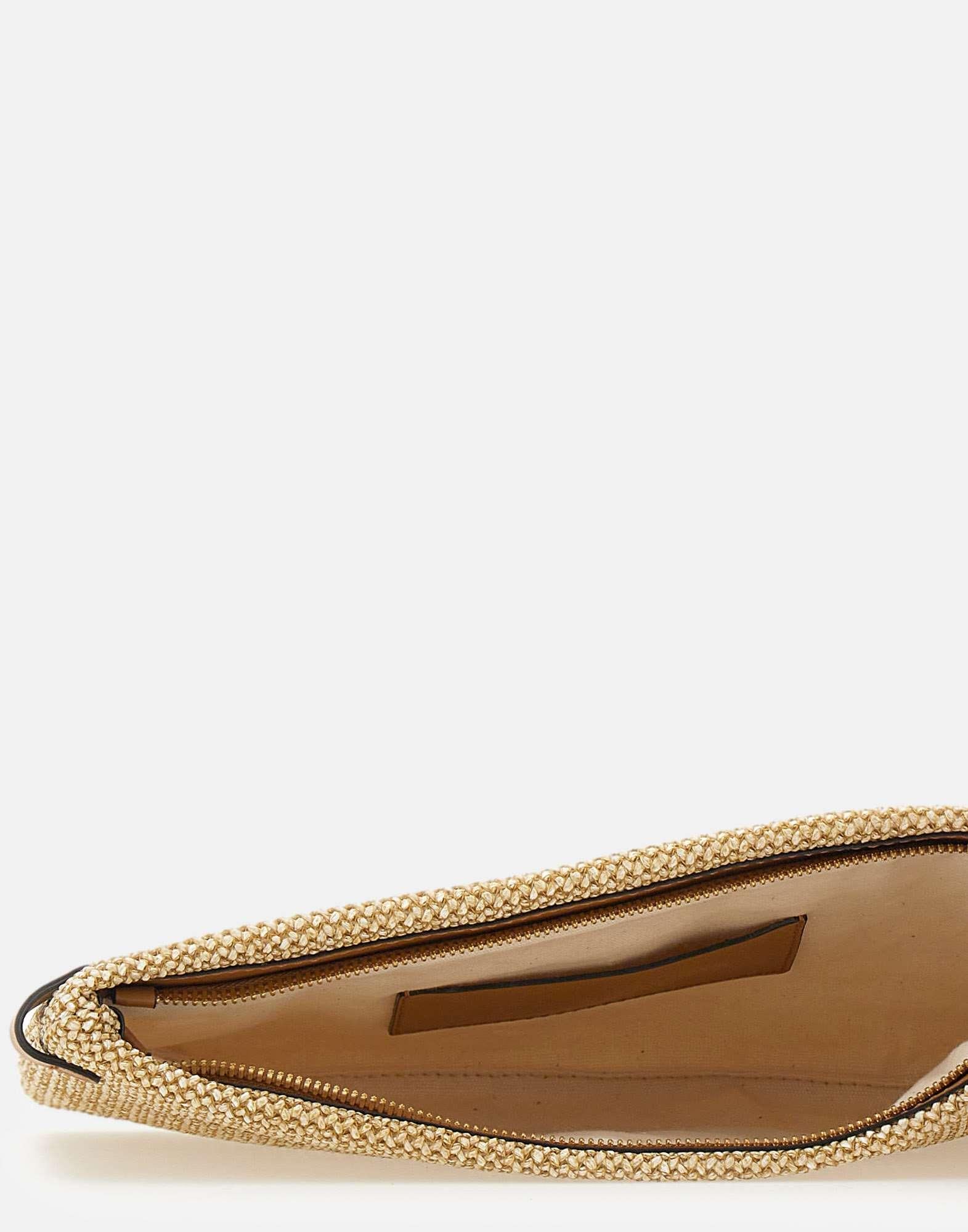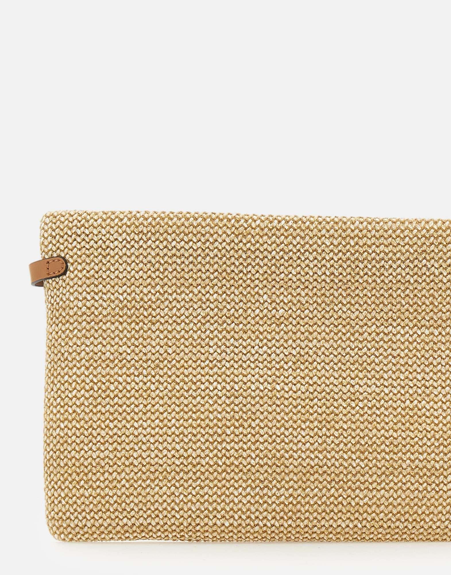 Gianni Chiarini women's pouch "Hermy" crafted from beige straw with tan leather details, a lightweight summer clutch with a clean, modern feel. The main zip closure keeps essentials secure, while the canvas-lined interior is finished with an inner logo patch. It can be carried on the wrist or worn with the adjustable and removable shoulder strap for versatile styling. Made in Italy. Size: 28x18 cm.