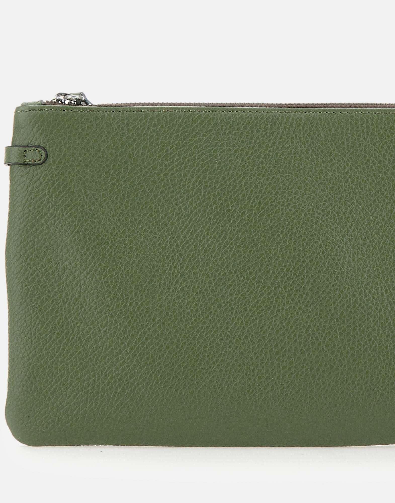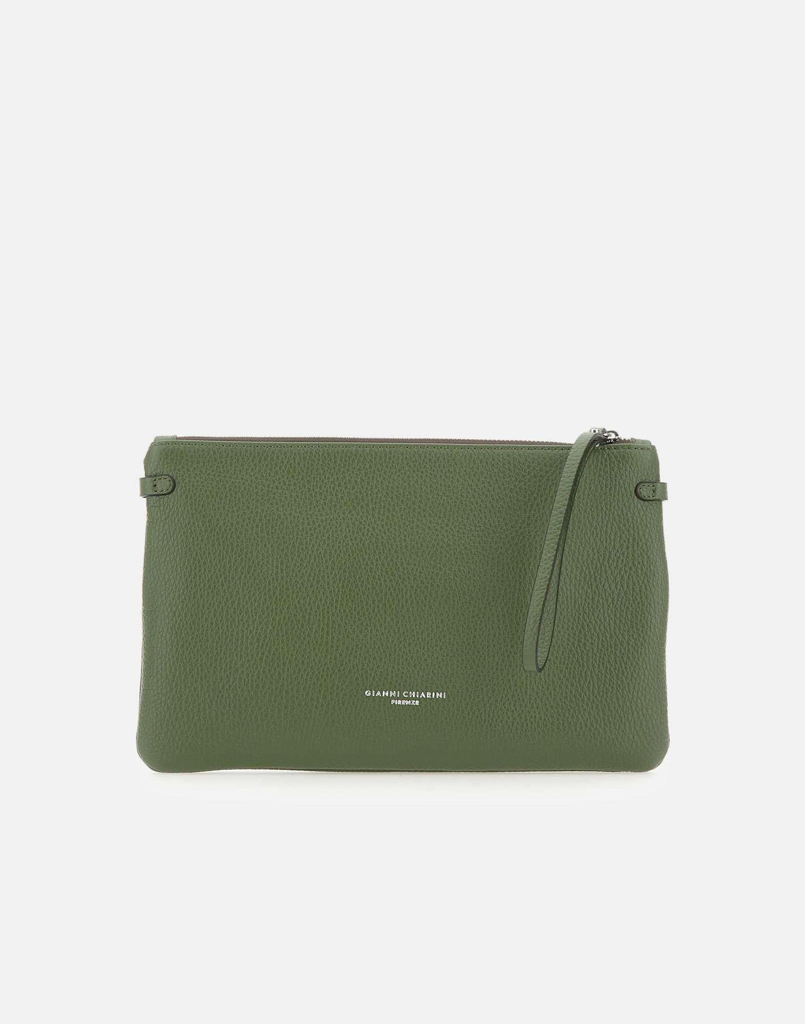 Gianni Chiarini "Hermy" clutch bag in maxi grain leather, green, zip closure and strap for wearing on the wrist, silver plating, external silver logo, adjustable and removable shoulder strap approximately 90cm, dimensions: height 18cm, length 28cm, depth 3cm, dustbag included, made in Italy