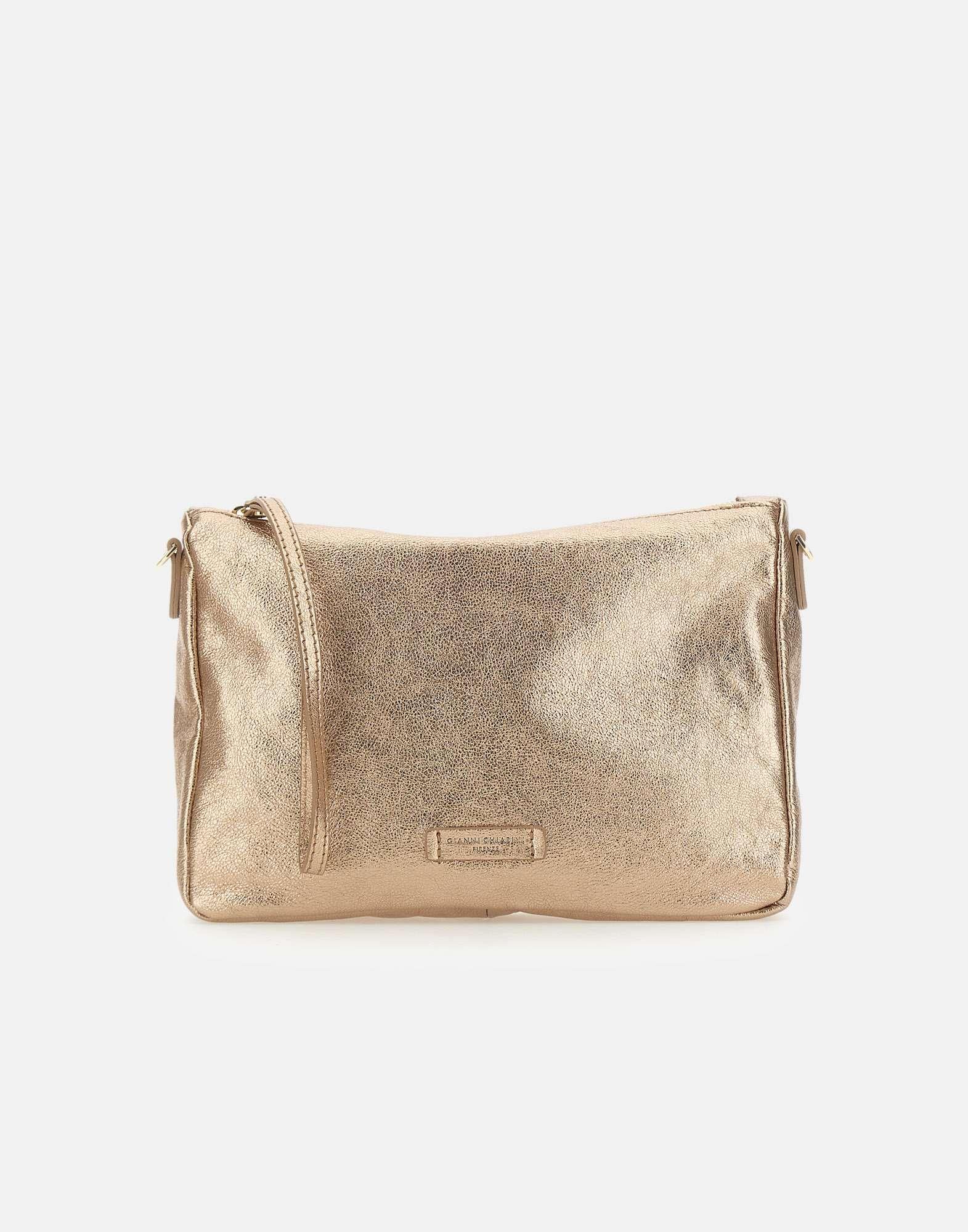 Gianni Chiarini "Nora" women's clutch bag in gold-tone leather, a lightweight and contemporary clutch designed for the summer season. The main zip closure protects your essentials, while the canvas interior features two flat pockets. Carry it on your wrist or with the removable and adjustable shoulder strap for versatile portability, ideal for completing casual yet refined looks. Made in Italy. Dimensions: 27 x 20 x 7 cm.