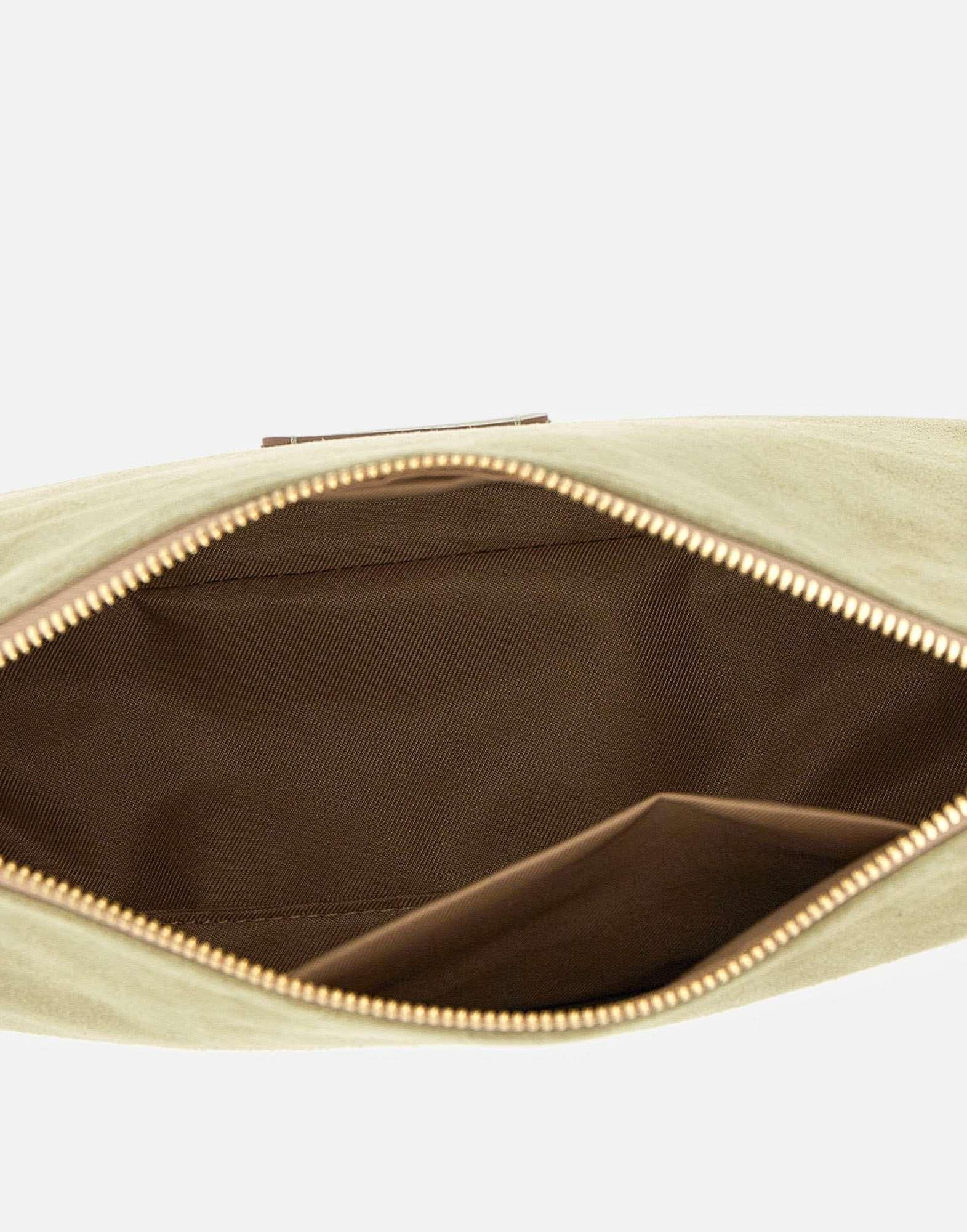 The Gianni Chiarini "Nora Pouch" women's clutch bag in sage green suede is designed for practical elegance. It features a leather wrist strap and an adjustable, removable leather shoulder strap for cross-body wear. The top zip closure ensures practicality, while the interior features two patch pockets. Logo patch on the bottom front. Includes a dust bag. Made in Italy. Dimensions: 28 x 21 x 9 cm.