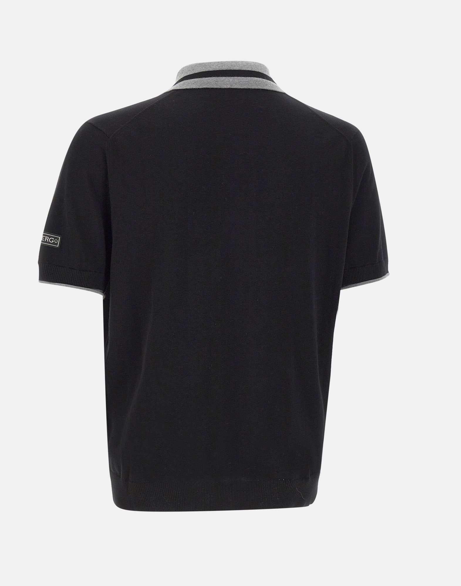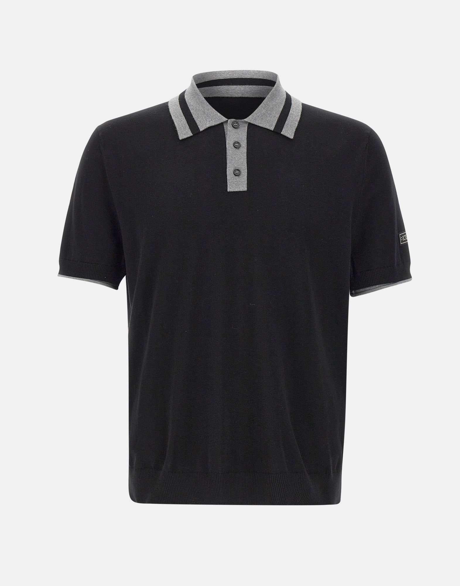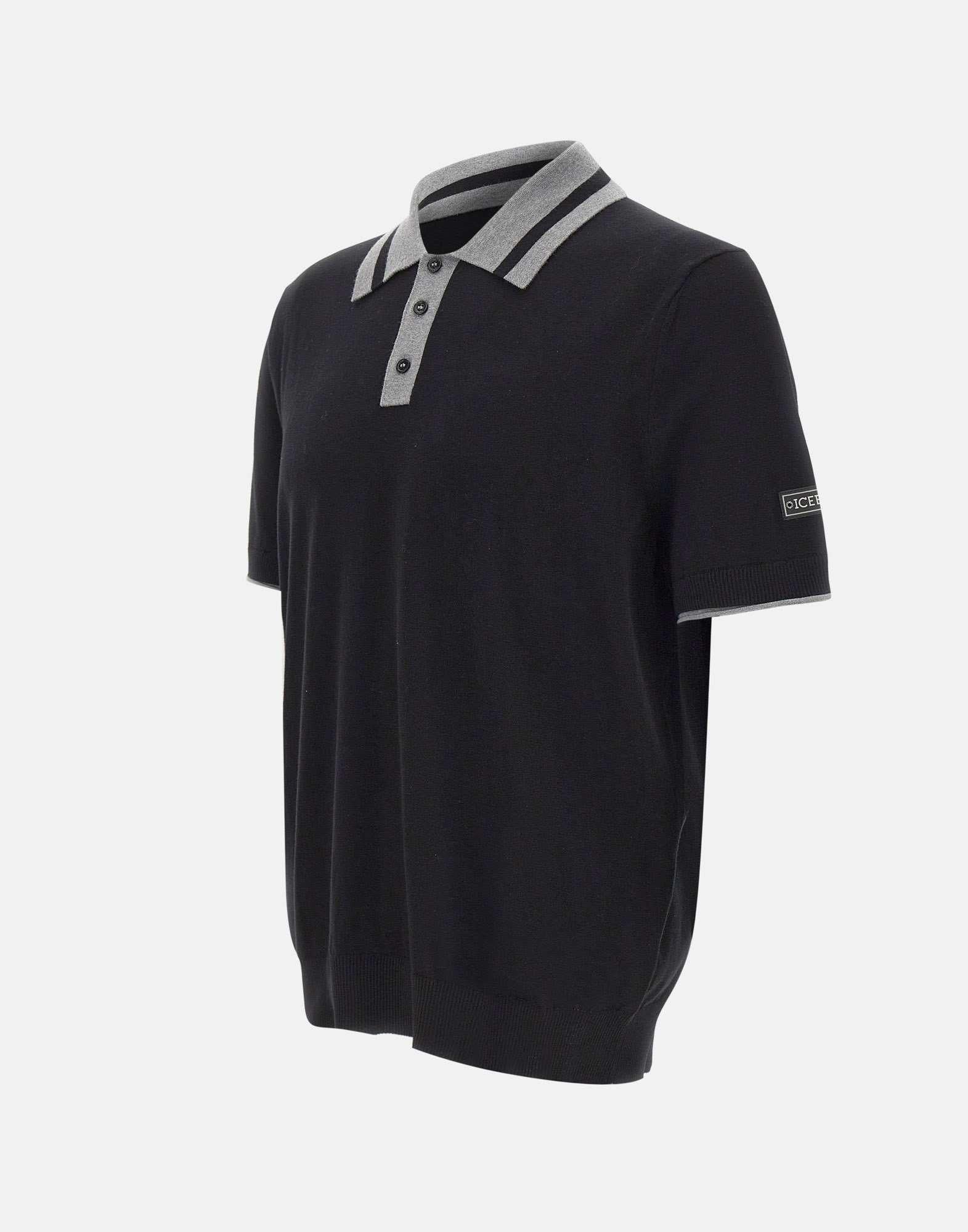Iceberg men's polo crafted from black cotton, featuring a clean and modern design. Grey contrasting trims on the collar and sleeve hems add a subtle graphic accent that enhances the essential silhouette. The Iceberg label applied on the left sleeve signs the piece with understated elegance. Finished with three black logo buttons and ribbed trims, this polo is designed to bring character to everyday wardrobes. Regular fit.
