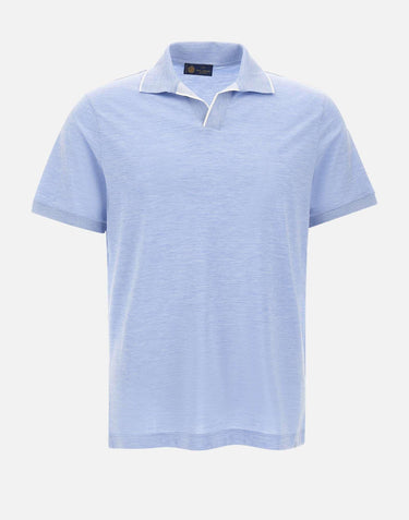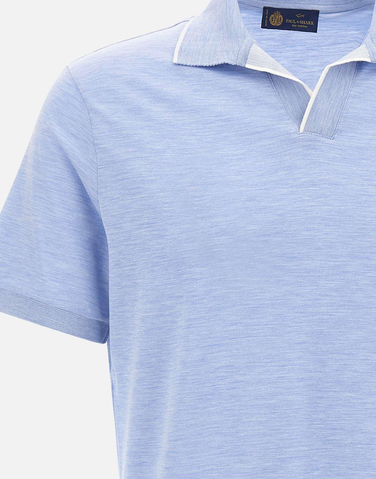 Paul&Shark men's polo crafted from a silk and cotton blend in light blue melange, soft and lightweight for effortless warm-weather style. It features a buttonless collar with white contrast trims for a clean, contemporary look. Finished with short sleeves with ribbed cuffs, small side vents for comfort and a stitched label at the hem for a subtle signature detail. The regular fit ensures easy versatility, perfect with denim or tailored trousers. Made in Italy.