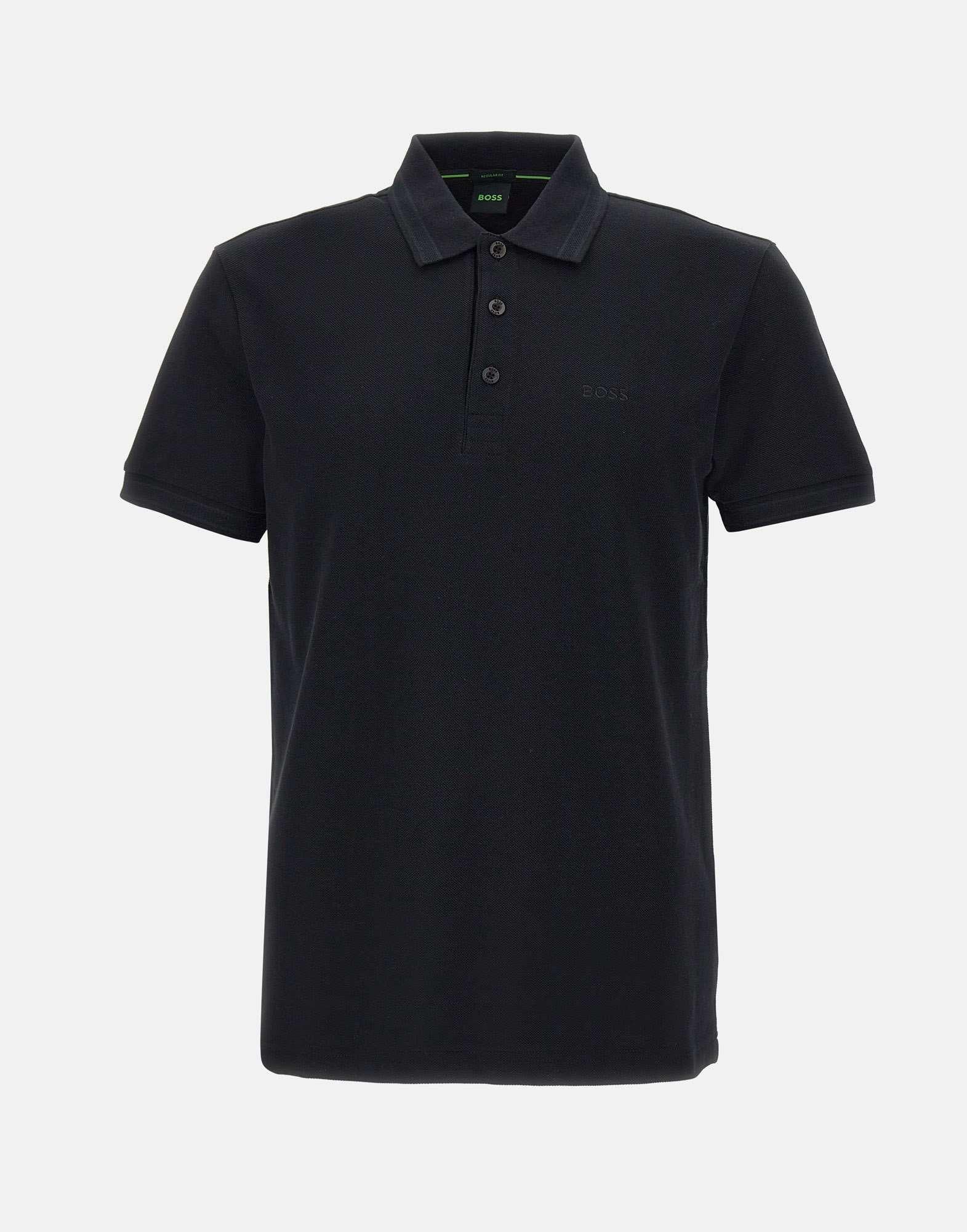 Boss "Paddy" men's polo shirt, black, cotton piqué fabric, short sleeves, classic collar with three-button placket with matching logo, ribbed edges, logo embroidery on chest, regular fit
