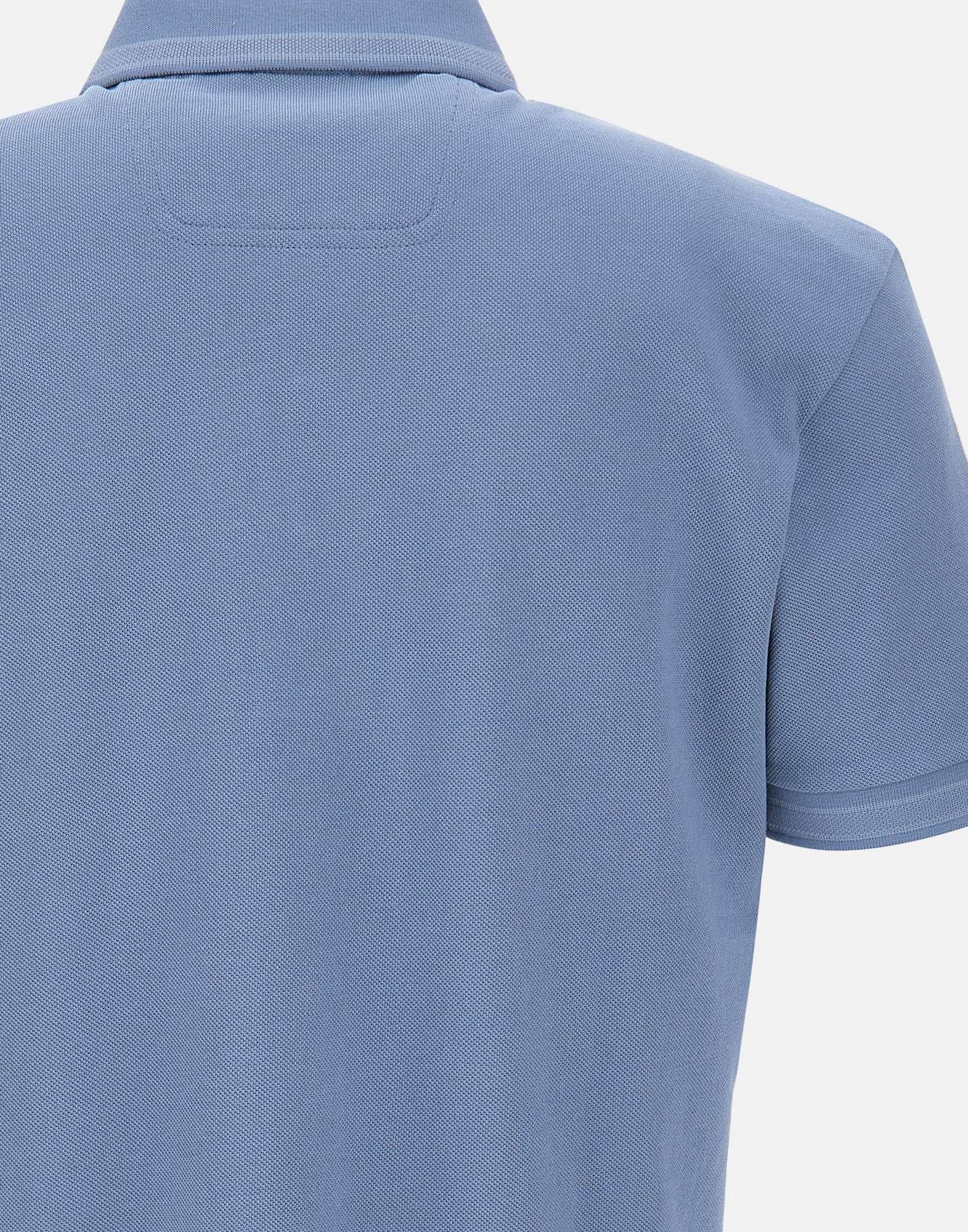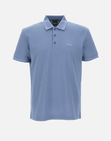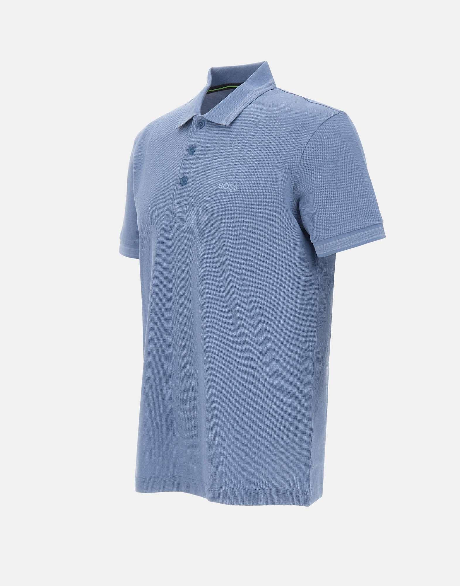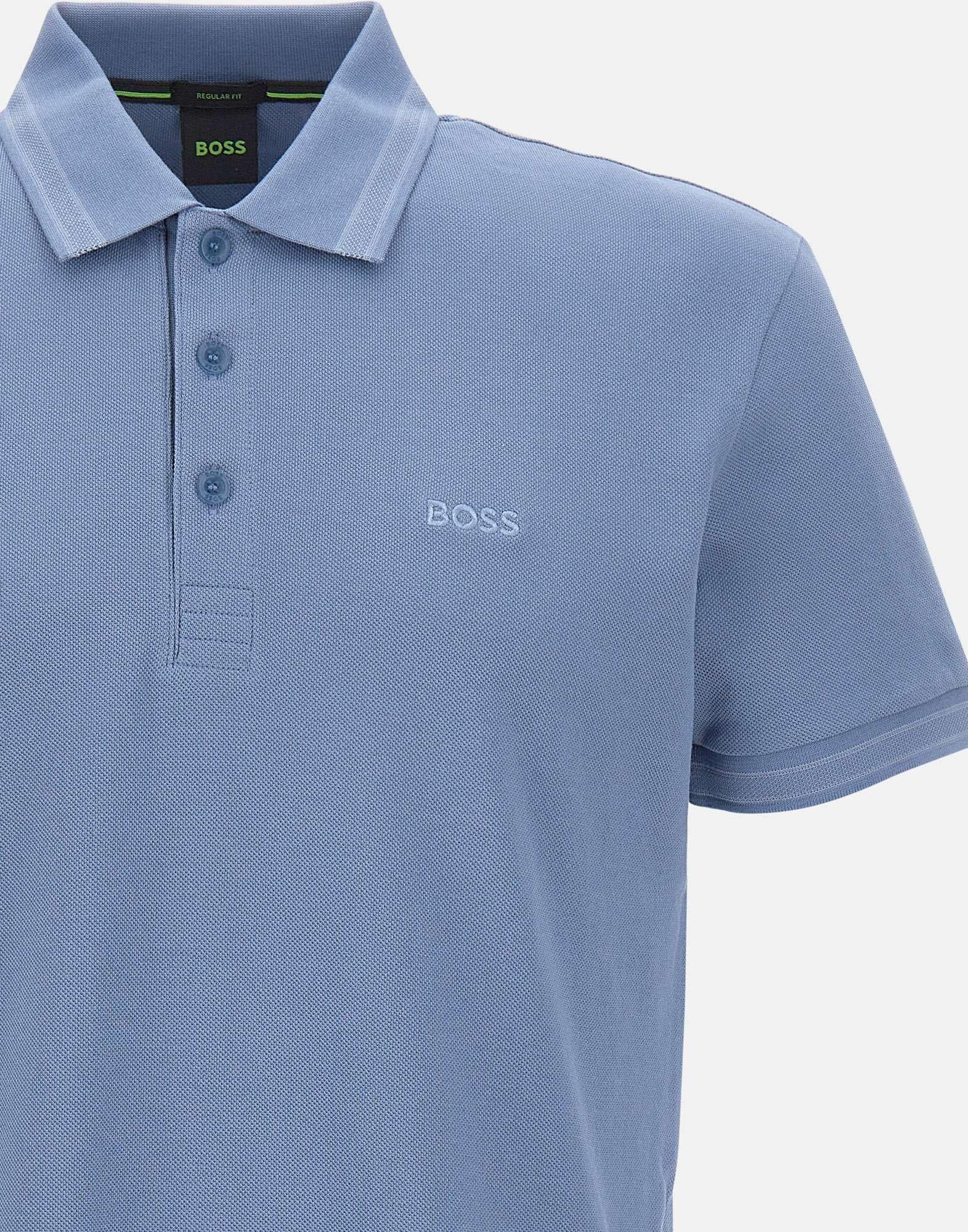 Boss men's polo shirt "Paddy" crafted in cotton in a mid-blue shade with a breathable pique weave, ideal for a clean, polished look in warmer seasons. Designed with short sleeves, a regular fit and a flat-knit collar with three tonal branded buttons for a neat, versatile silhouette. A contrasting embroidered logo on the chest adds a distinctive touch, while sporty tonal striped trims on the collar and sleeve hems bring a contemporary graphic accent. Ribbed sleeve cuffs complete the design for comfortable wear. A polo perfect for casual and business casual styling.
