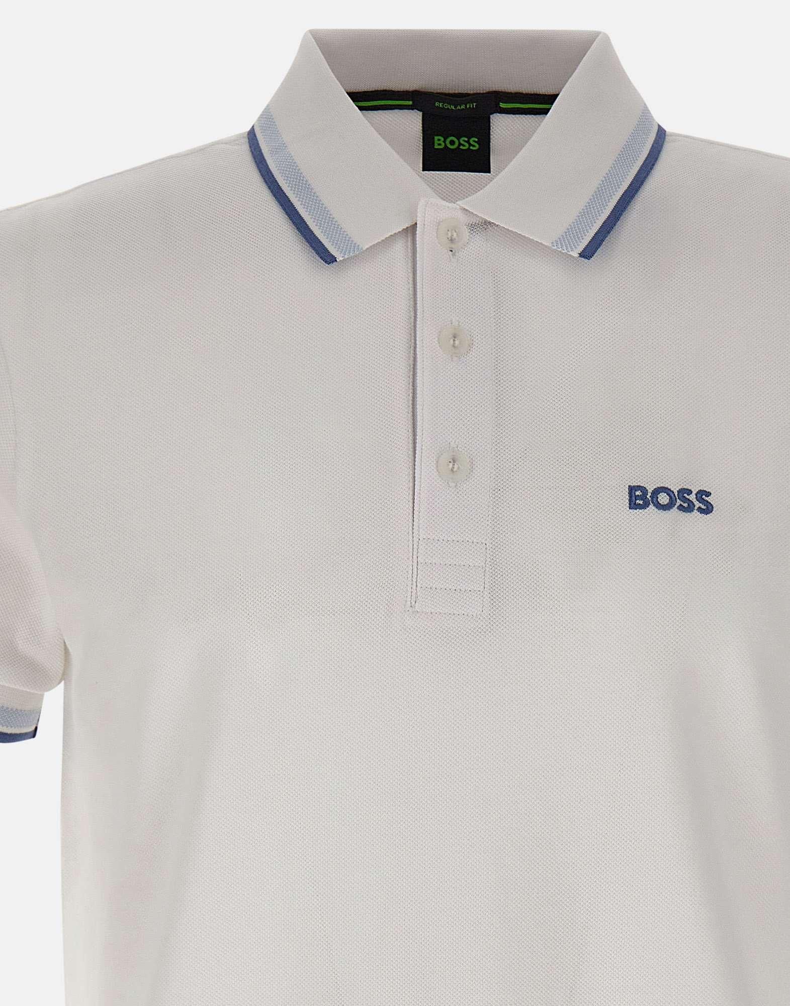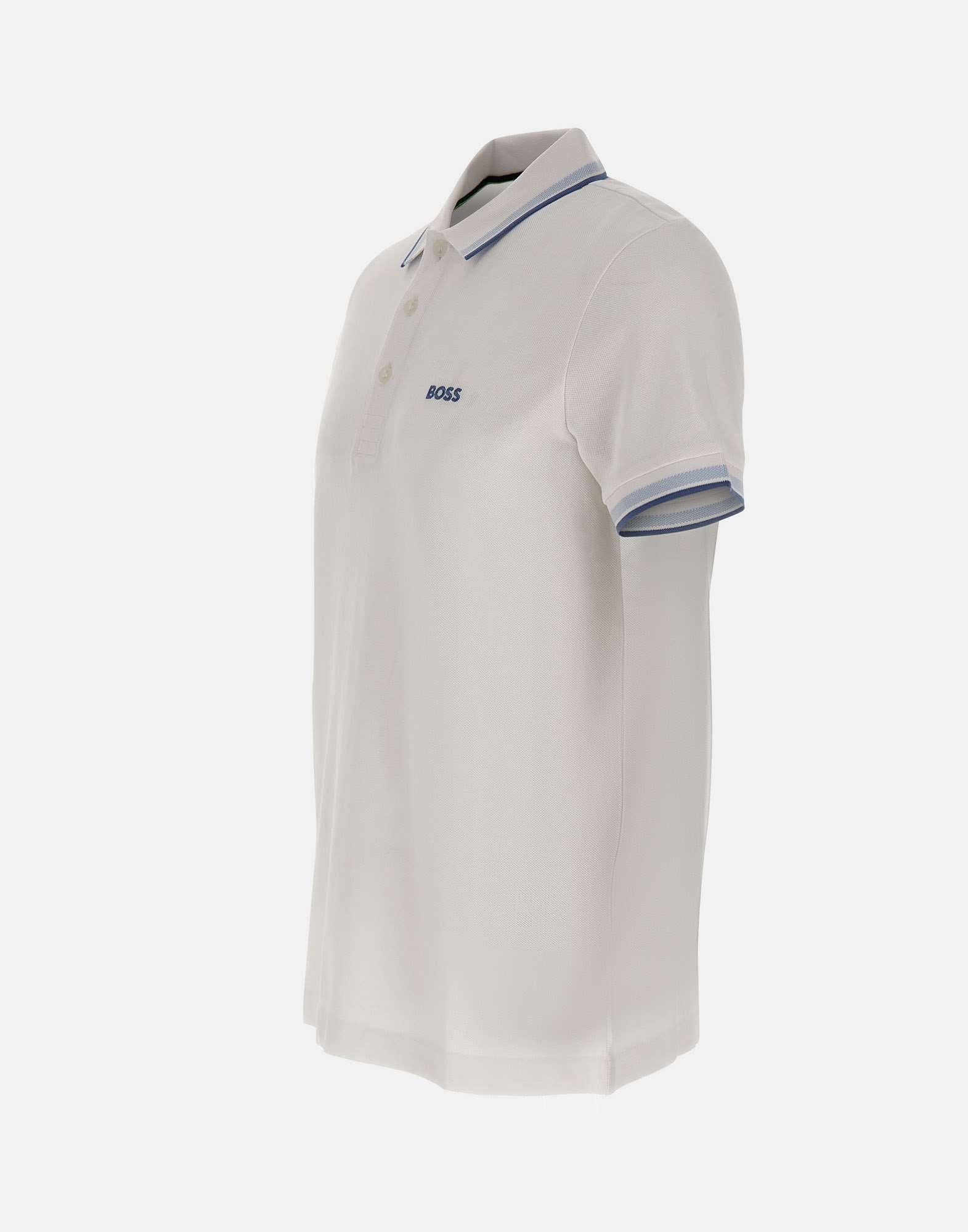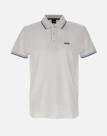 Boss men's polo shirt "Paddy" crafted in white cotton with a breathable pique weave, ideal for a clean, polished look in warmer seasons. Designed with short sleeves, a regular fit and a flat-knit collar with three tonal branded buttons for a neat, versatile silhouette. A contrasting embroidered logo on the chest adds a distinctive touch, while sporty striped trims on the collar and sleeve hems bring a contemporary graphic accent. Ribbed sleeve cuffs complete the design for comfortable wear. A polo perfect for casual and business casual styling.