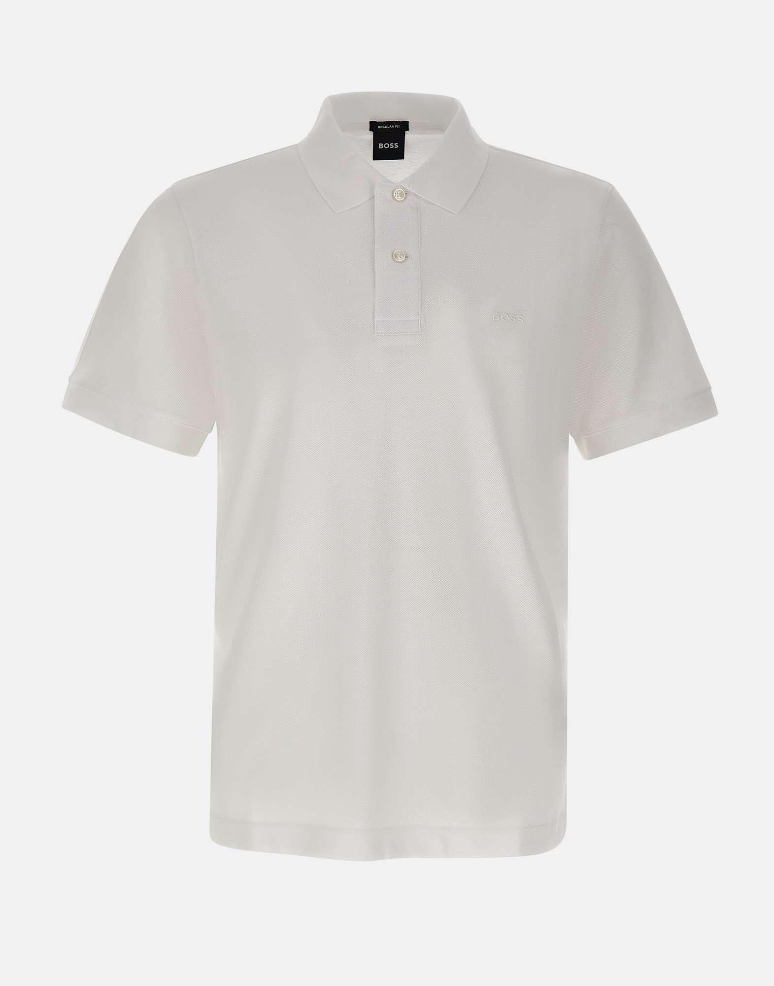 Boss men's polo shirt "Pallas" crafted in premium white cotton pique, designed to deliver a clean, sporty look. It features a tonal embroidered logo on the chest for a discreet, refined signature. The construction includes a flat-knit collar with two buttons, short sleeves with ribbed cuffs and small side slits for comfort and a neat finish. The regular fit makes this polo easy to style for casual and business casual outfits.