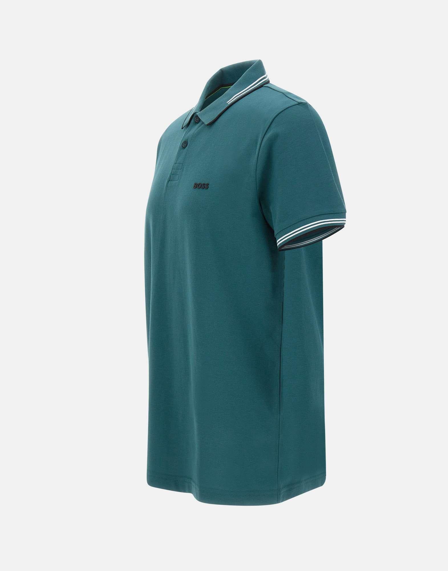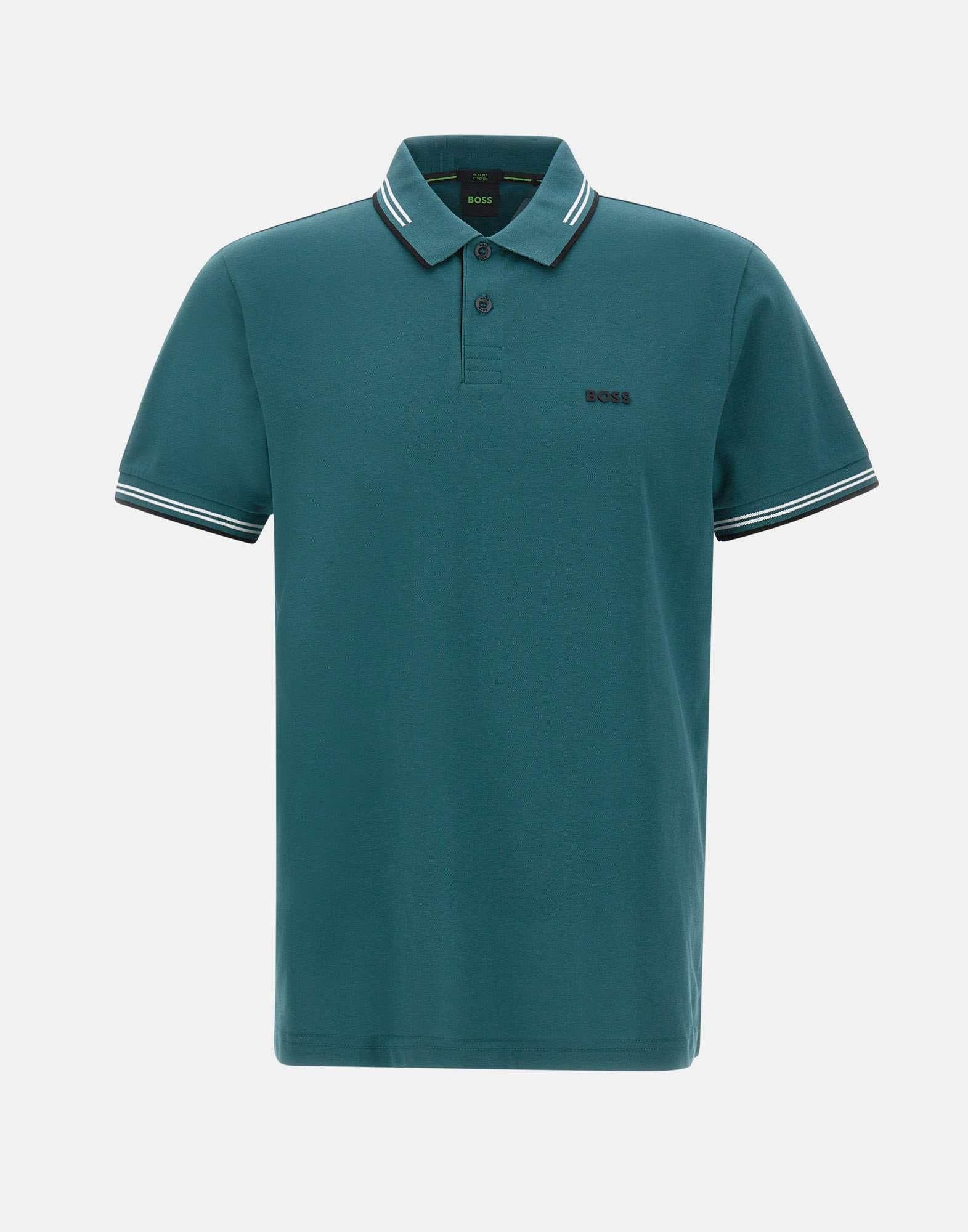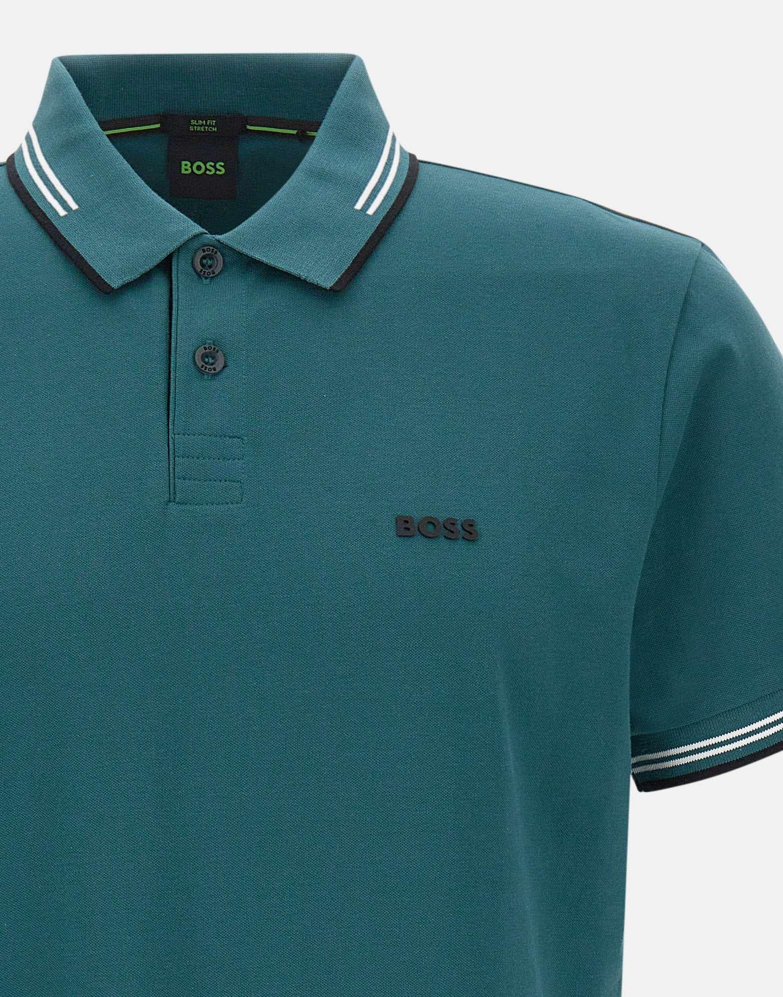 Boss men's polo "Paul" crafted in blue-green stretch cotton, defined by a clean look with sharp contrast details. It features a flat-knit collar with two buttons and short sleeves with ribbed cuffs, finished with contrasting white and black stripes on the collar and sleeve hems for a modern graphic outline. A black rubberized contrast logo sits on the chest, discreet yet distinctive. The slim fit creates a sleek, contemporary silhouette. A polo ideal for refined casual outfits and summer business casual styling.