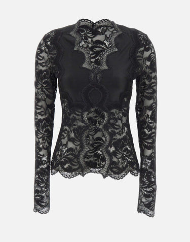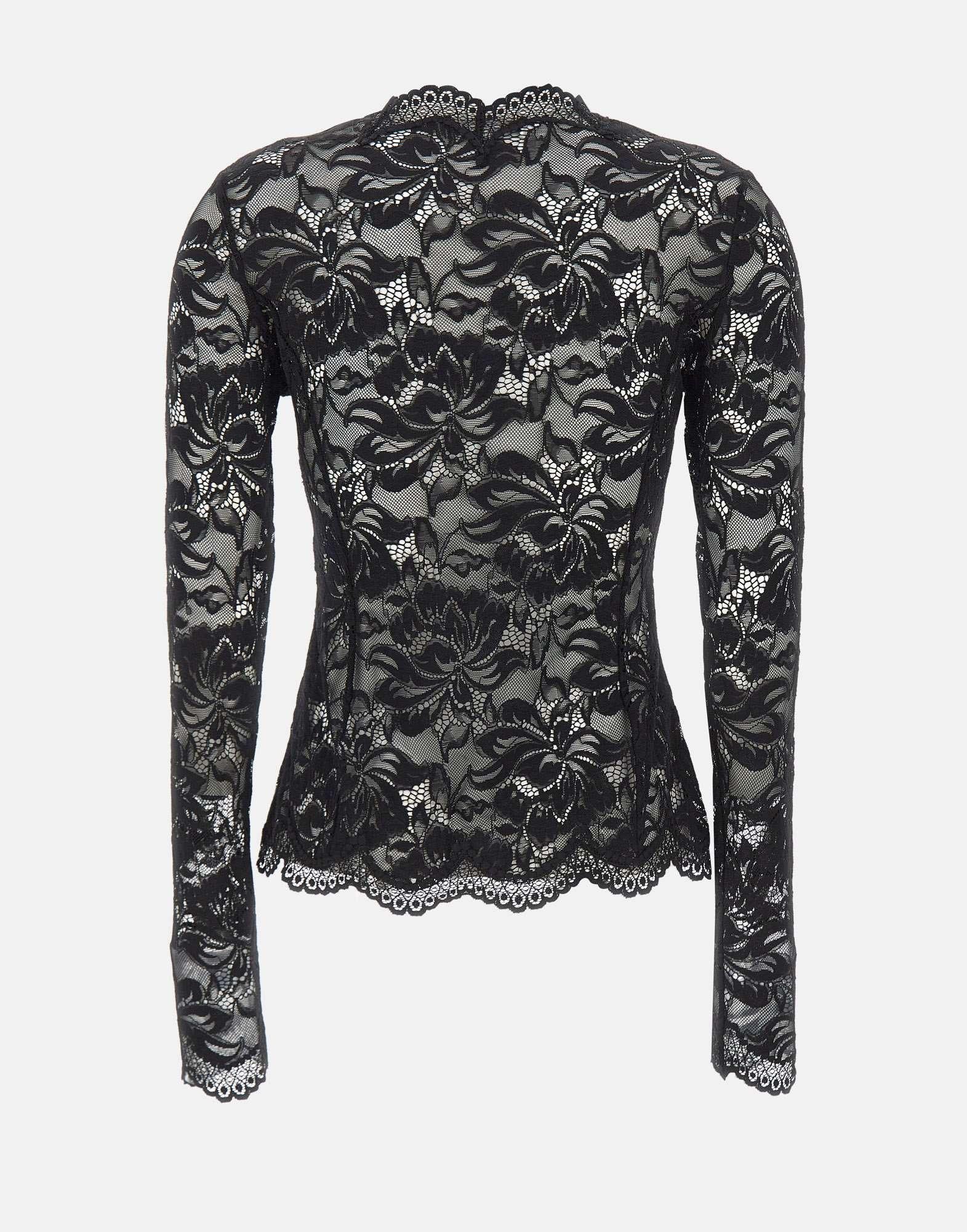 Rabanne women's top crafted from black lace, designed with subtle sheerness for a bold, refined look. Features long sleeves and a V-neckline trimmed with lace, finished with a cut-out detail at the waist for a modern touch. Scalloped hem and cuffs complete the design with a delicate finish. Slim fit.