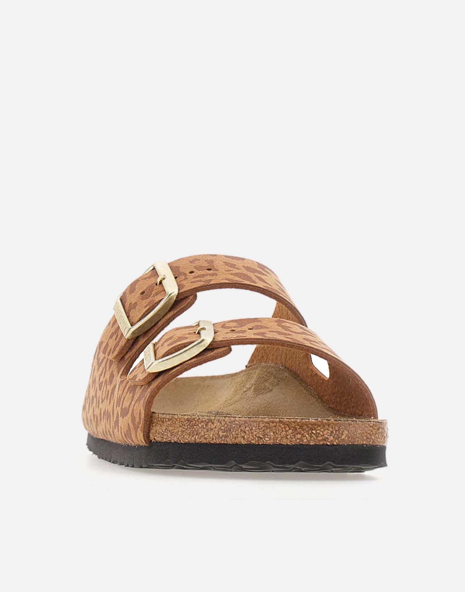 Birkenstock women's "Arizona" sandals with a skin-friendly synthetic upper in brown with a leopard pattern. The iconic two-strap design, known for its timeless style, is finished with metal pin buckles for an adjustable fit. A lightweight EVA sole adds practicality, while the anatomically shaped cork and latex footbed and the suede insole deliver the signature Birkenstock comfort for everyday wear. A true cult classic with a bold, distinctive look. Narrow fit.