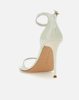 Sergio Levantesi "Rave5" women's sandals, white colour, patent leather, ankle strap, upper strap, rounded toe, covered heel, 12cm stiletto heel, leather sole, made in Italy, regular fit