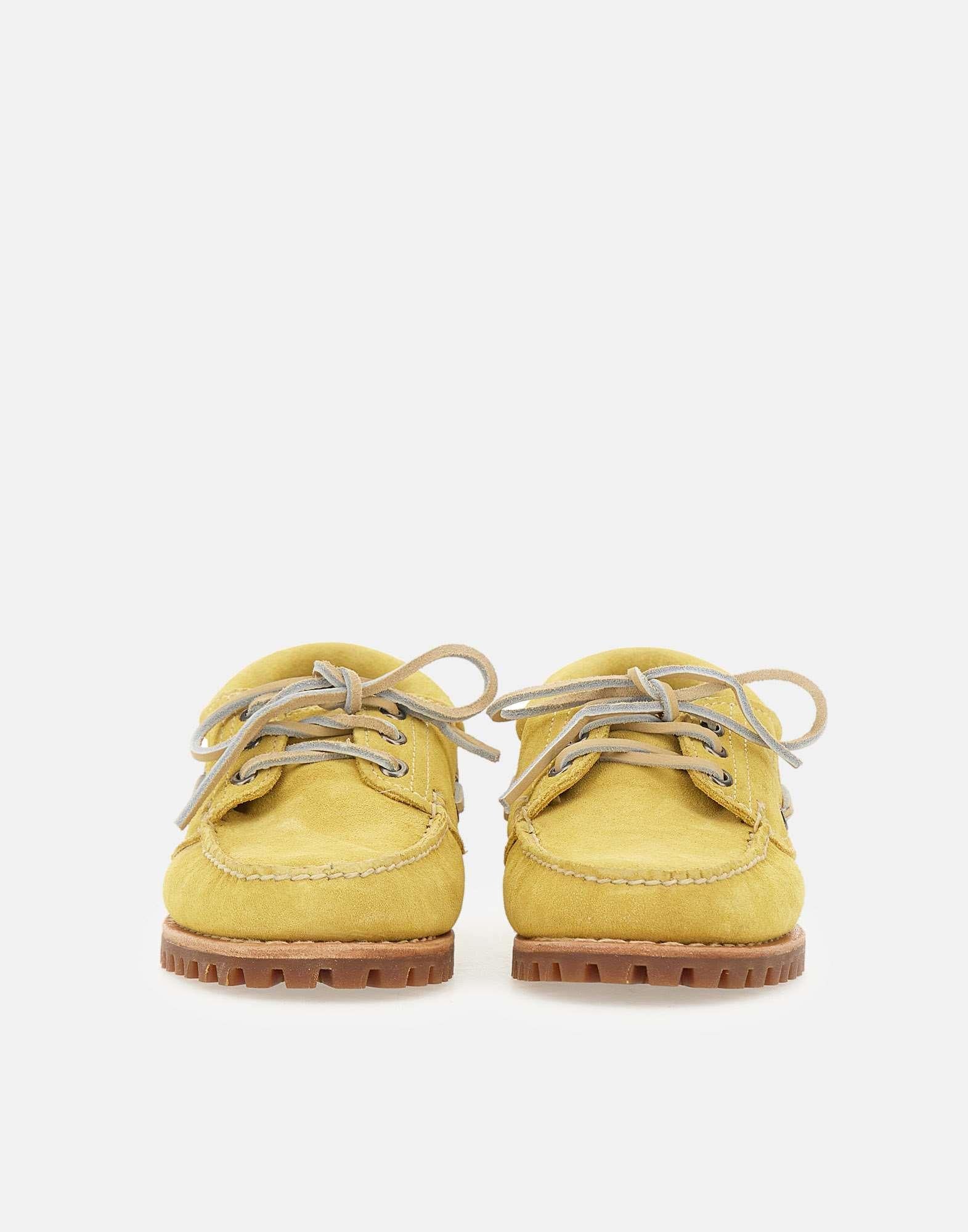 Women's Timberland boat shoes crafted from yellow suede leather, offering a fresh take on a timeless classic. Designed with a 2 cm lug rubber outsole, beige contrast stitching and laces that enhance the handcrafted look. Feature three eyelets, a heat-embossed iconic logo, a padded collar, and leather lining for comfort. The bold color choice updates the traditional silhouette, making this boat shoe unique and contemporary.