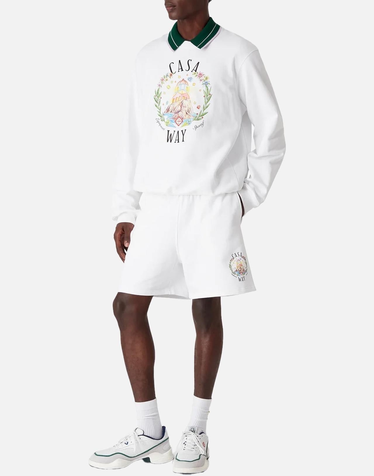Casablanca men's shorts "Casa way" crafted from organic cotton jersey, featuring a multicolor print at the hem of the left leg. Finished with an elasticated waistband and drawstring with a silver-tone tip, plus side pockets and a back patch pocket for added practicality. Relaxed fit, perfect for modern casual looks.