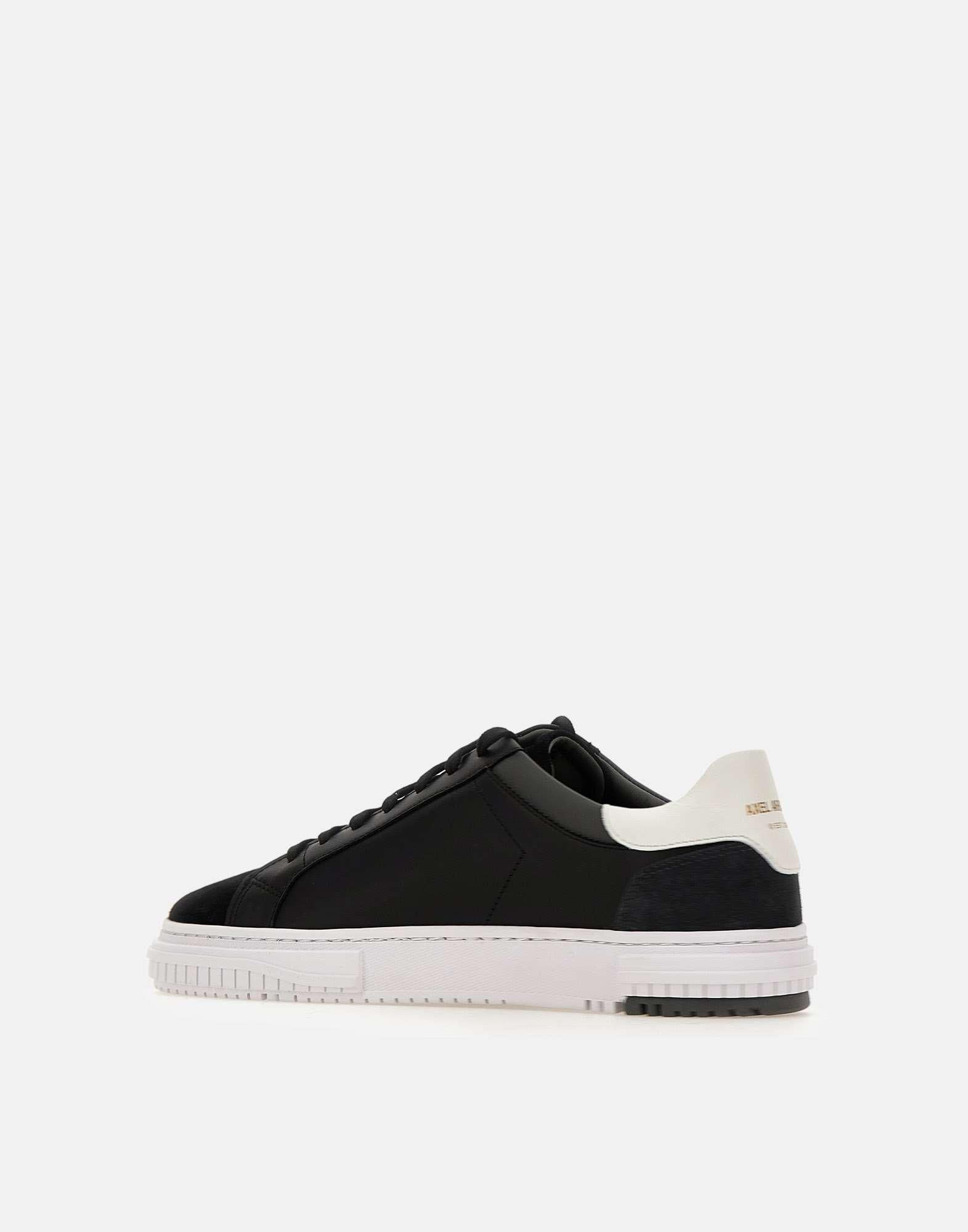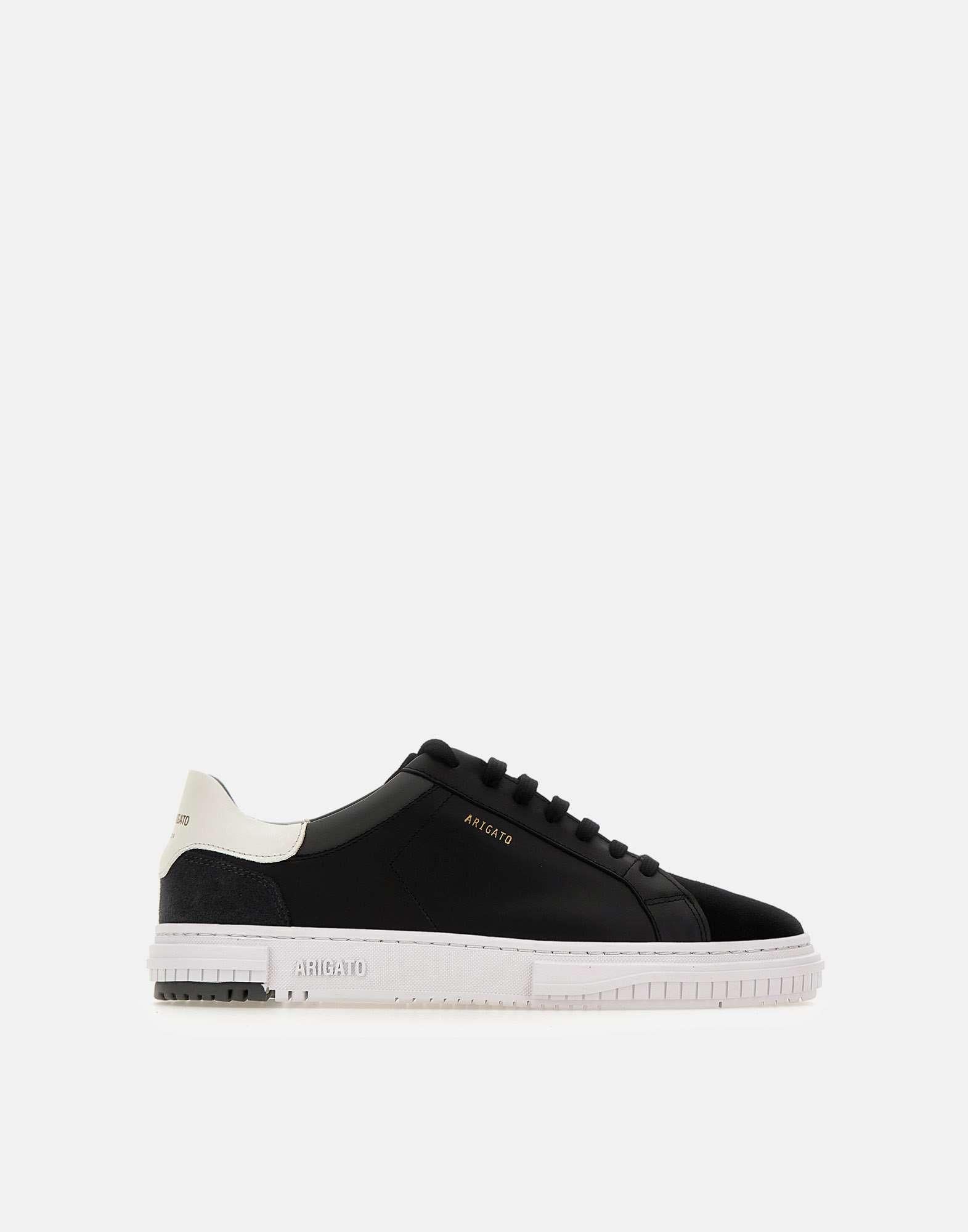 Axel Arigato "Atlas" men's sneakers handmade from black leather with matching suede inserts, designed with a clean, contemporary feel. The 3 cm rubber sole is stitched and glued to the upper for added durability; it is partly recycled and specially molded for a graphic, textured look. Subtle gold logos enhance the side and the white heel tab, while flat black cotton laces complete the design. A removable padded insole provides everyday comfort.