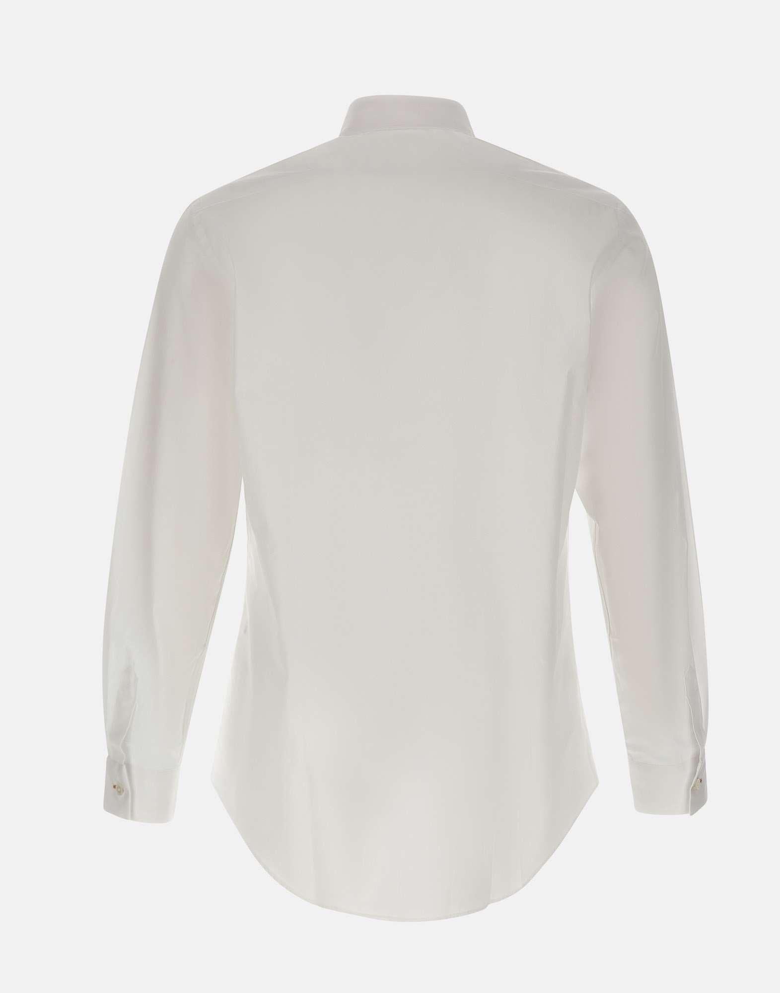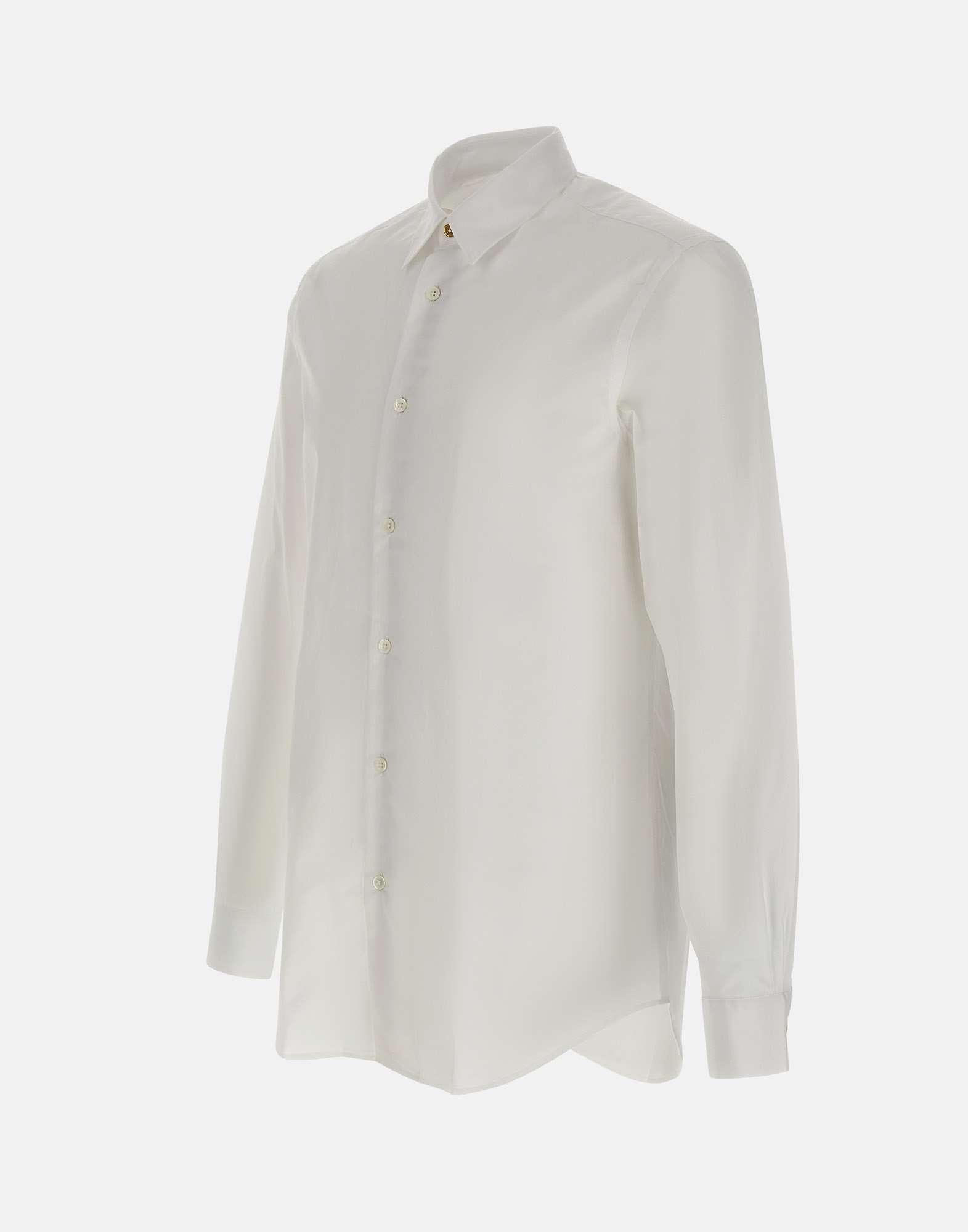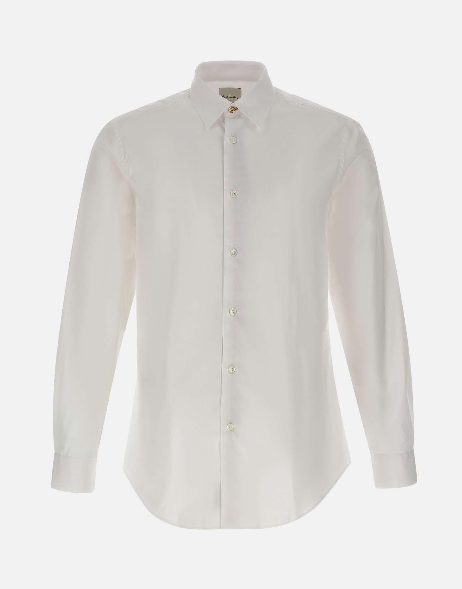 Paul Smith men's shirt crafted from white cotton, defined by a clean look enhanced with signature brand details. The long-sleeve design features a pointed collar secured with a gold-tone button and a hidden multicolor stripe motif inside the button placket for a refined, discreet accent. Finished with buttoned cuffs, a rounded hem, and a regular fit for comfortable, versatile wear. Made in Italy.