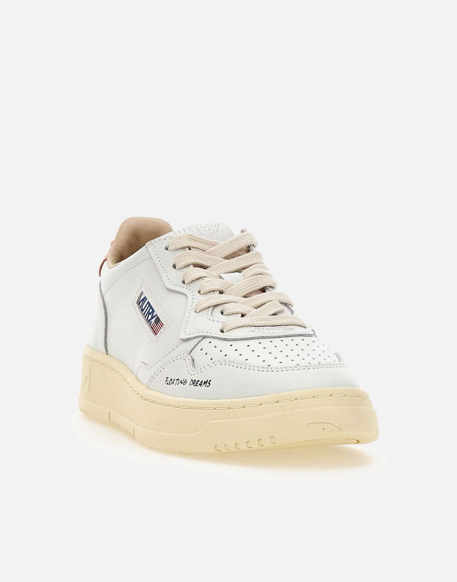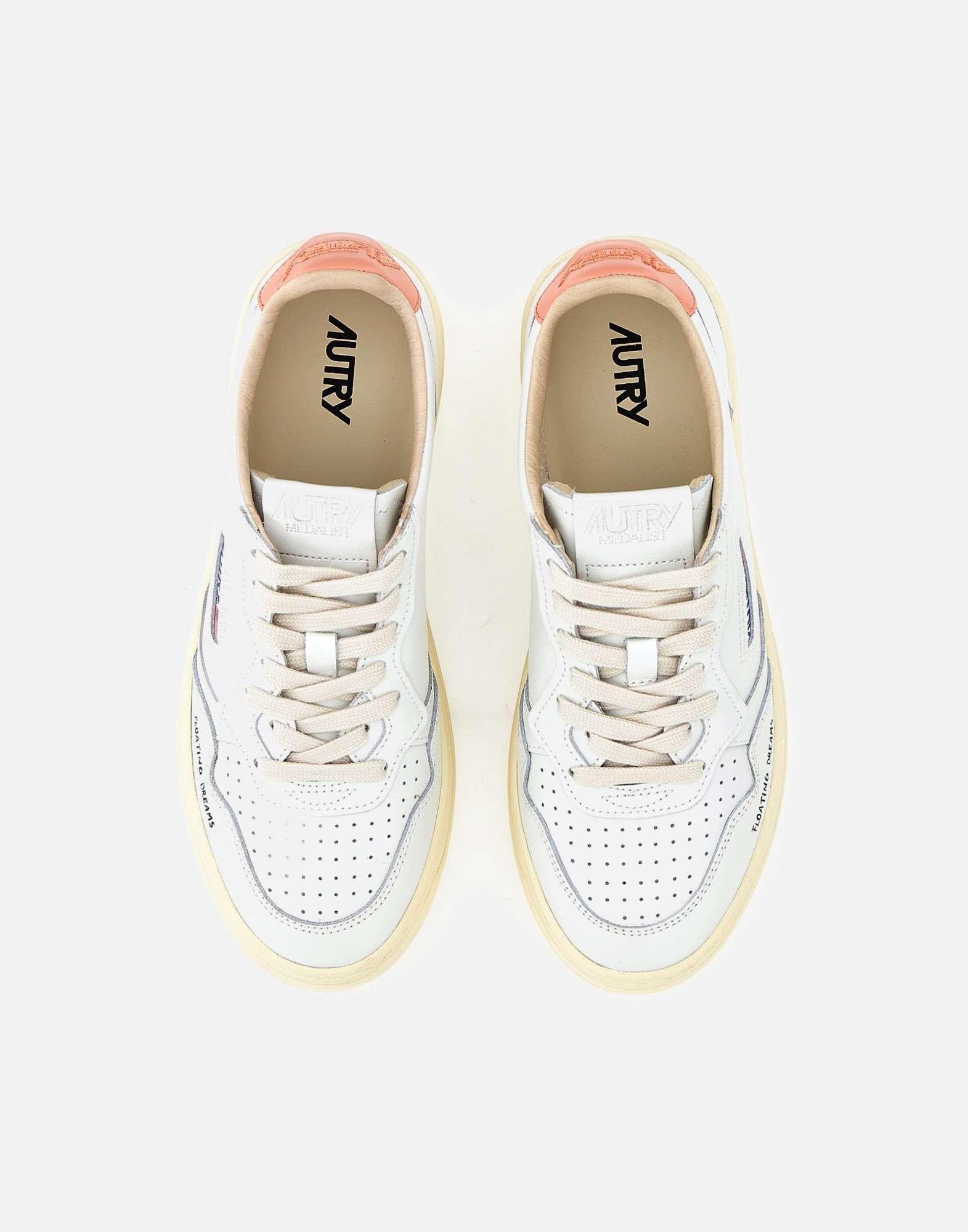 Autry women's sneakers "Medalist Low" in white leather with peach-colored leather heel tab featuring an embossed logo. Perforated toe for enhanced breathability, flat cotton laces, embroidered logo on the tongue and jacquard side label. Cream color rubber sole, 3.5 cm high, "Floating dreams" text printed on the toe side. A modern take on the iconic 1980s tennis sneaker, blending clean lines with delicate color accents for timeless appeal.