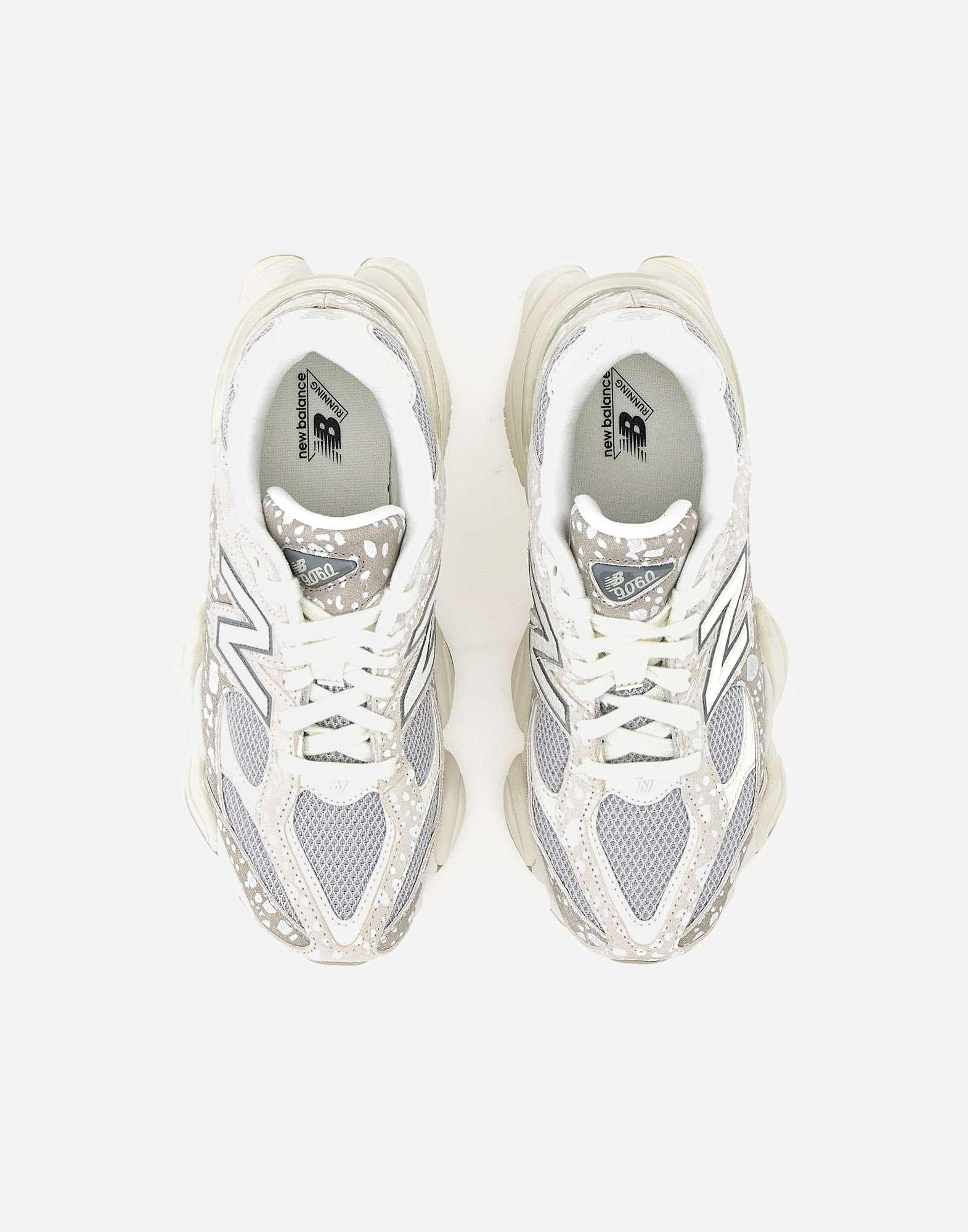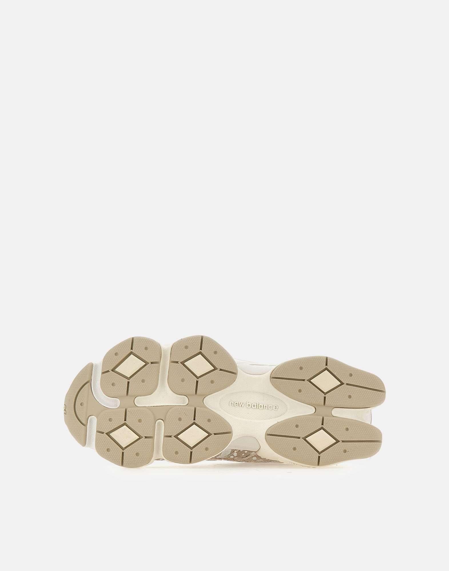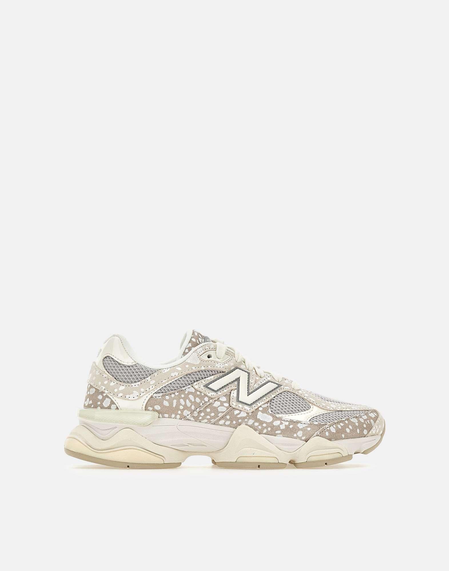 New Balance "9060" sneakers crafted from grey mesh with beige suede overlays featuring a spotted pattern, defined by a bold aesthetic that blends sports heritage with a contemporary vision. This style reinterprets the familiar elements of the classic 99X models through a futuristic and tech inspired early 2000s sensibility. They feature flat white laces, a logo tongue, and a branded heel tab, while the sway bars taken from the 990 are expanded and extended across the upper to create a visible sense of movement. The wavy lines and scaled proportions of the sculpted midsole place strong emphasis on the signature ABZORB and SBS cushioning platforms, while the translucent CR device at the heel and the diamond patterned outsole inspired by the classic 860 design complete the shoe with technical character and visual impact. 5 cm sole. Please refer to the New Balance USA UNISEX footwear conversion chart to find your ideal size.