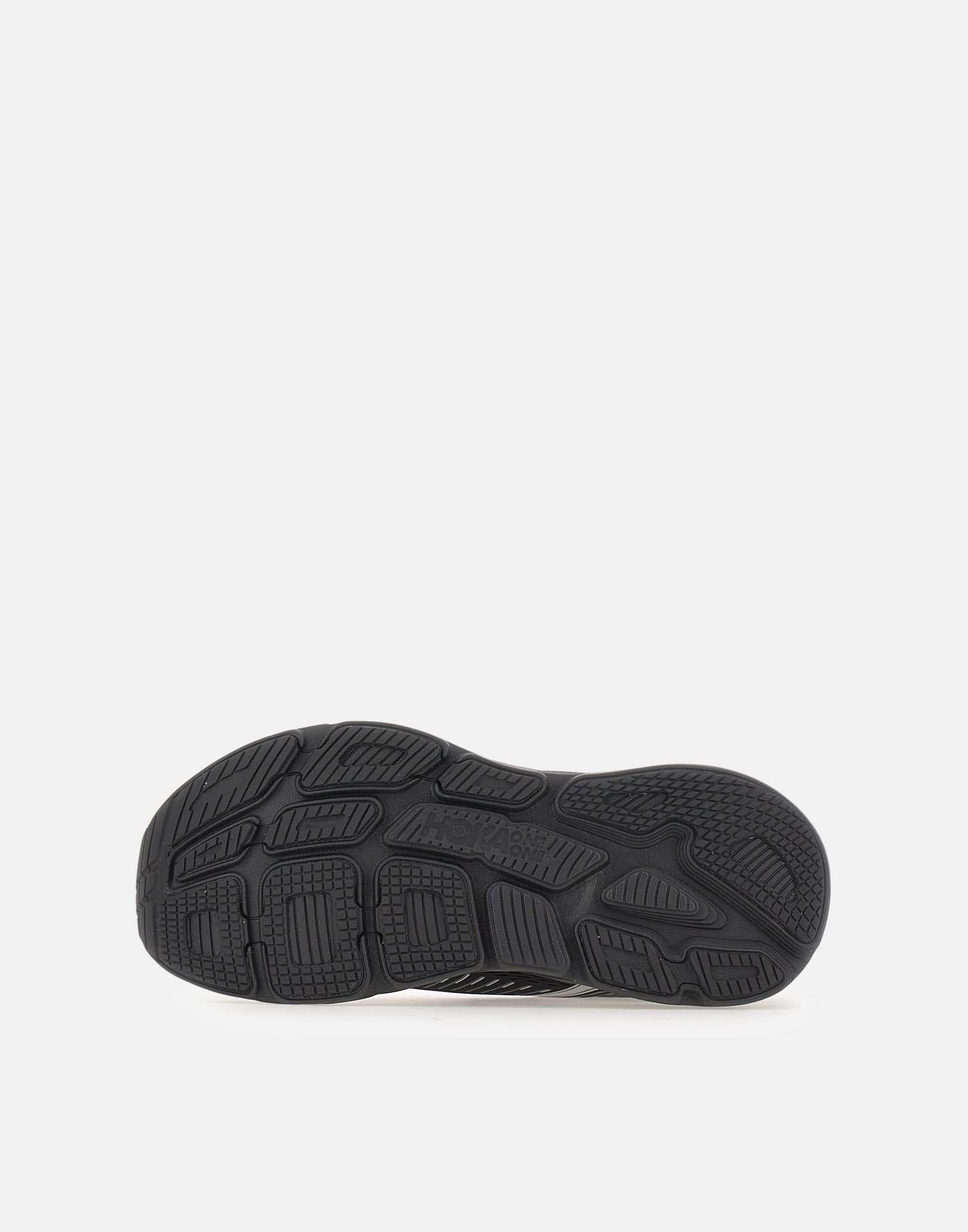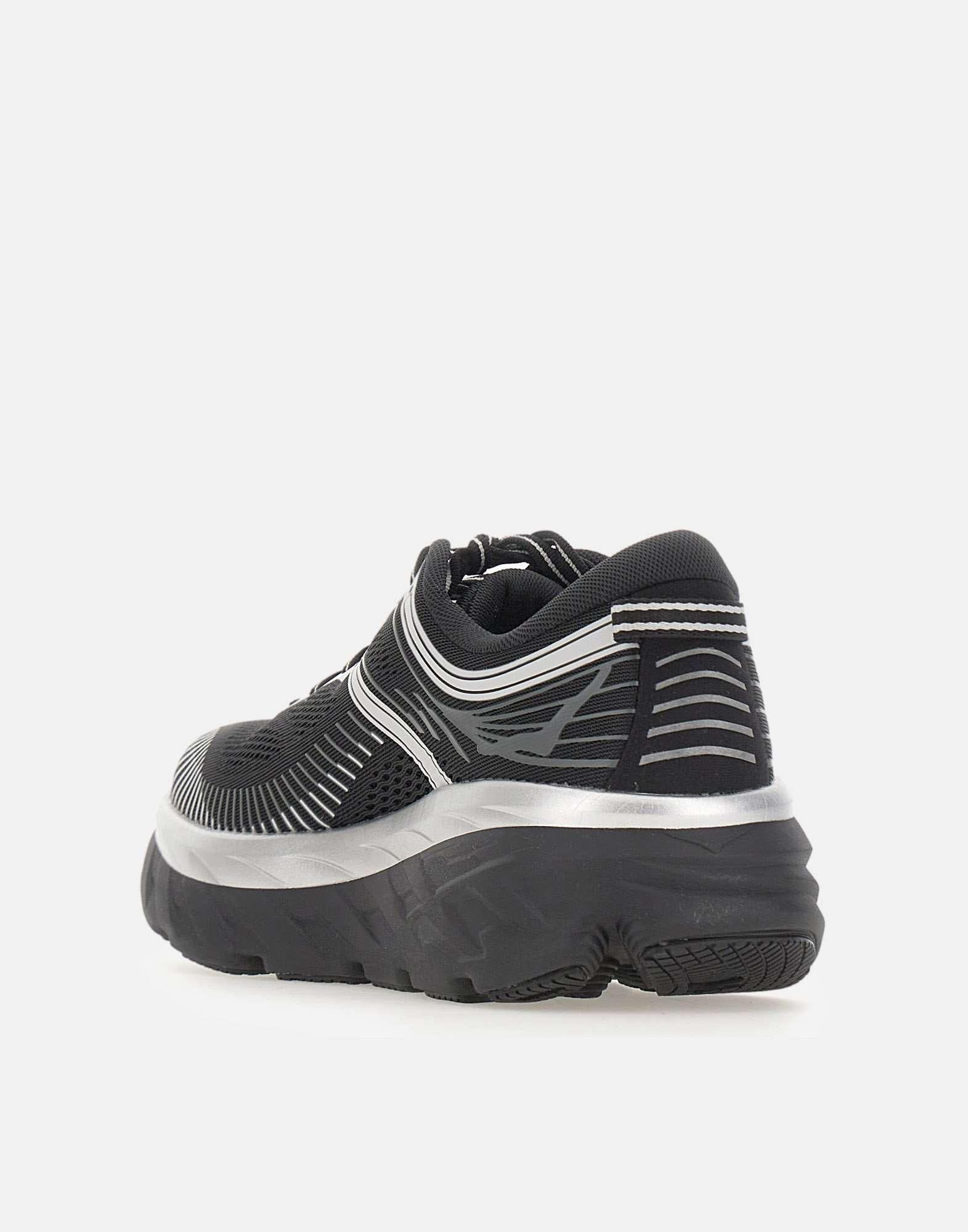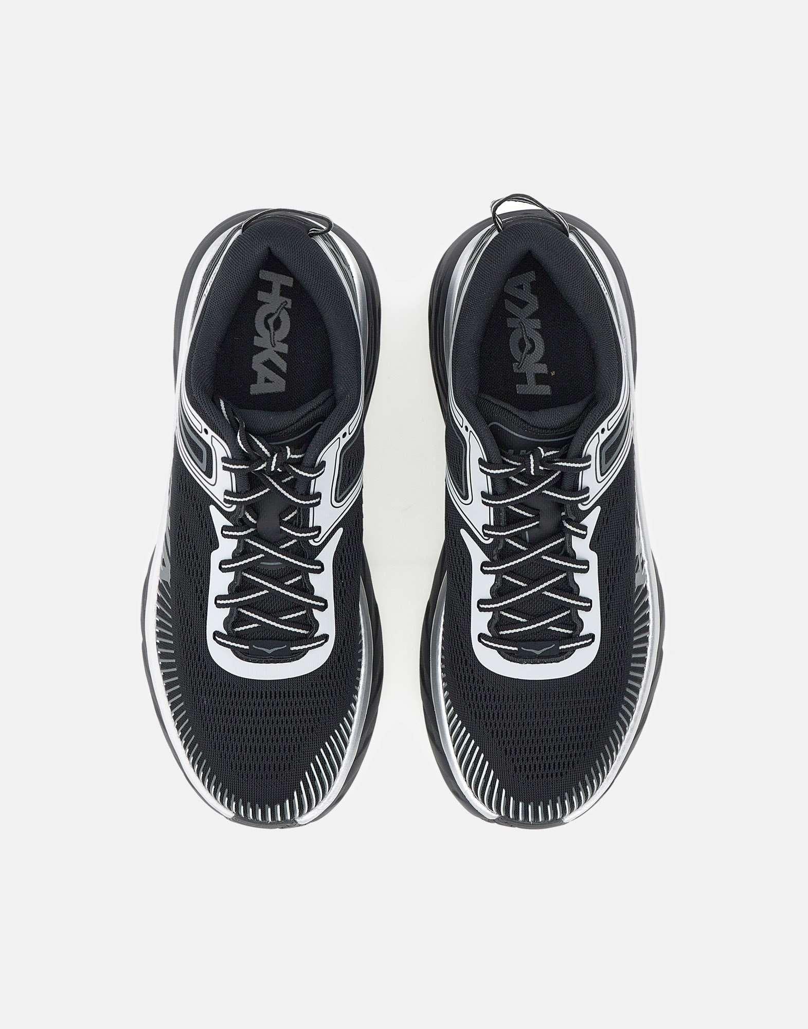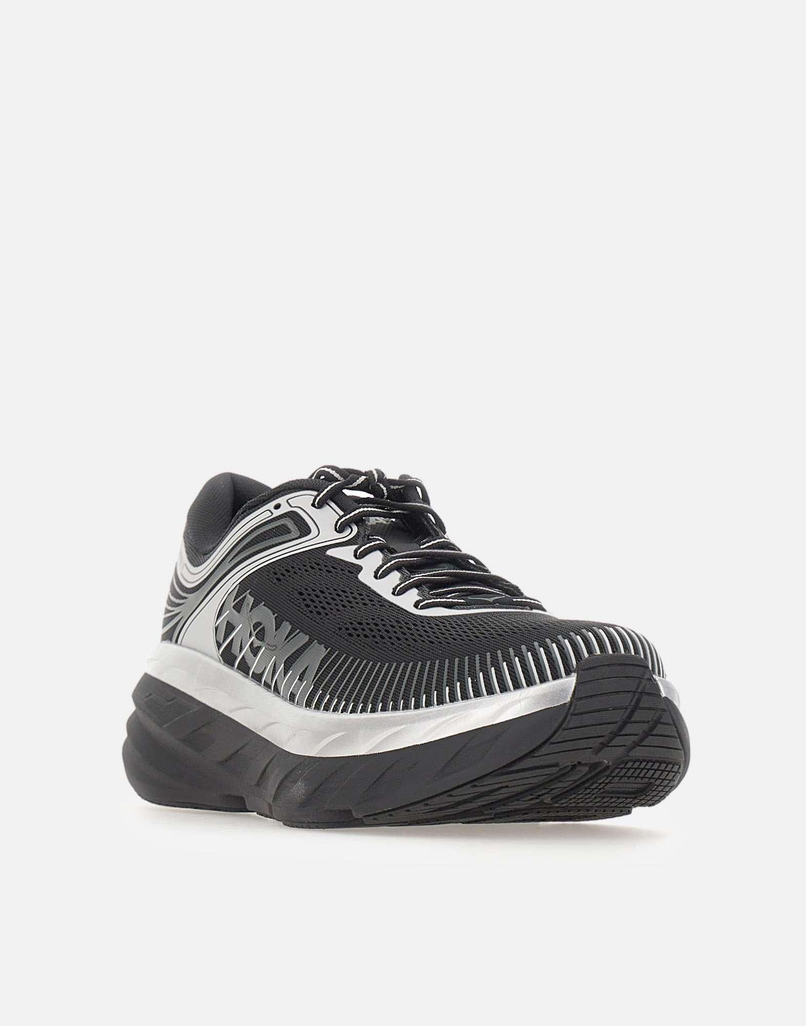 Hoka men's "BONDI 7" sneakers crafted from breathable black fabric, designed to deliver comfort and maximum cushioning. The style features a shaped collar and a 6 cm rubber sole, with silver detail, for a softer, more stable stride. Lace-up closure with black and white cotton laces, finished with synthetic contrasting details and the logo on the outer side for a technical, contemporary look. Pull tab at the heel for easy wear, and a molded EVA insole for comfortable support throughout the day.