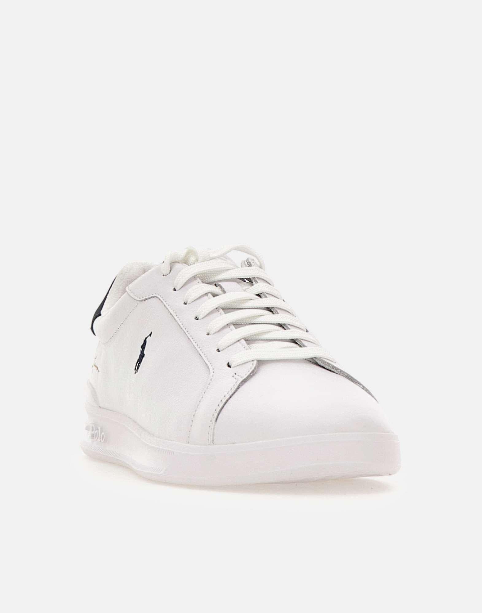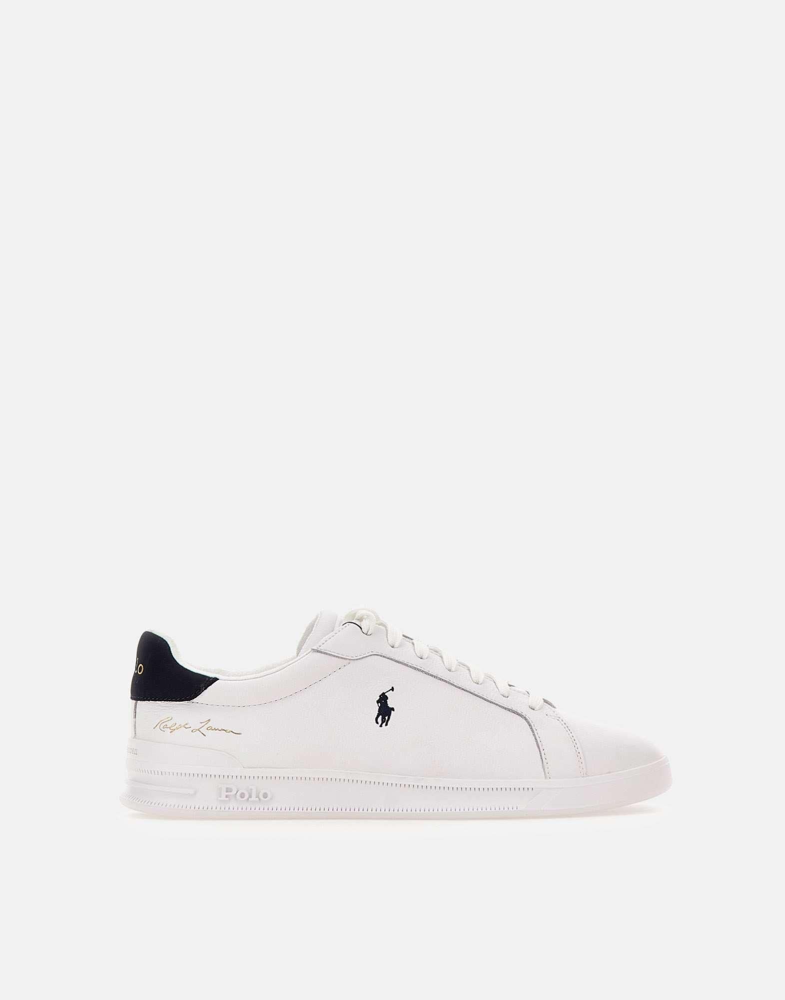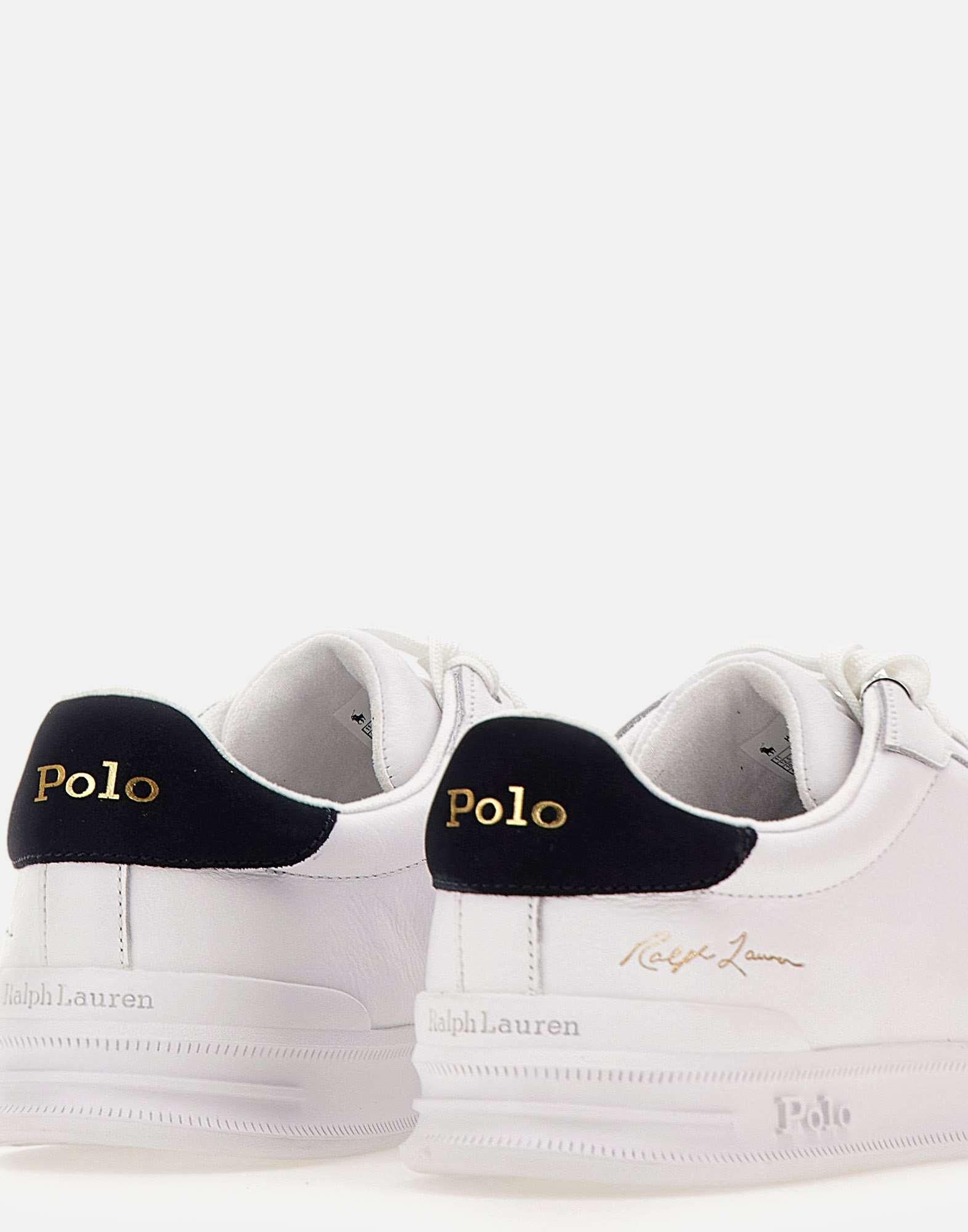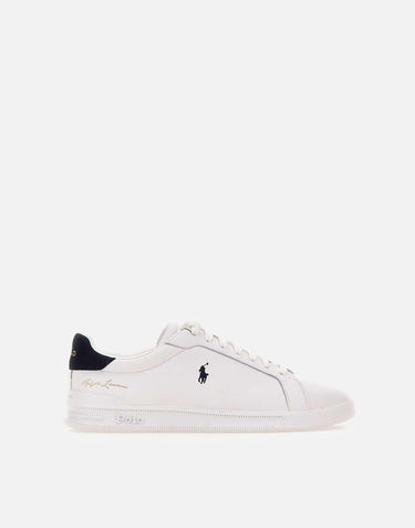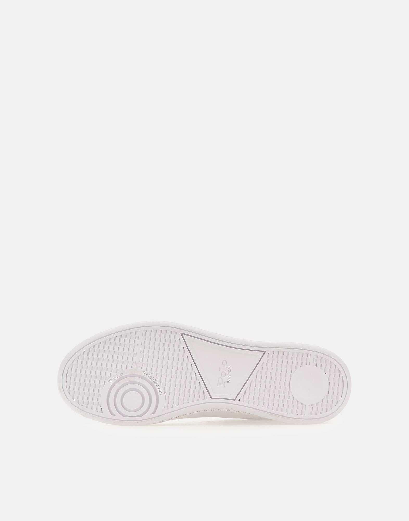 Polo Ralph Lauren men's sneakers crafted from white leather, featuring a clean and refined design inspired by the shoes worn by early professional tennis players. The style is enhanced by a dark blue suede heel tab with logo, flat white laces and the iconic contrasting pony on the outer side. The 2.5 cm molded rubber sole with integrated heel support ensures comfort and stability, while the embossed logo on the outer side of the sole and the engraved branding on the tongue and heel complete the look. Regular fit.