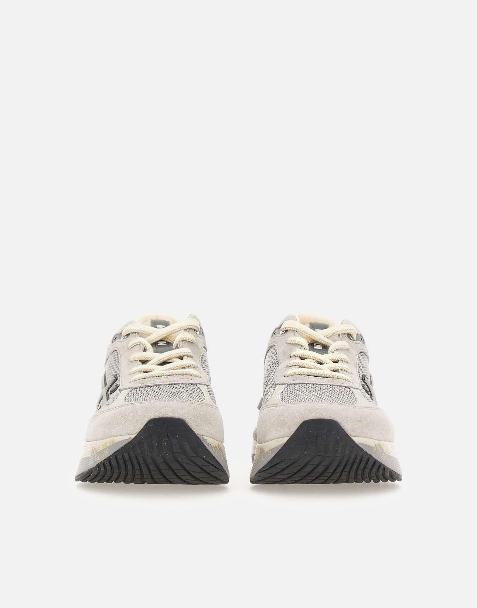Premiata "Moerun 7304" men's sneakers crafted from a mix of fabric and suede in grey tones, designed for a contemporary casual look with a technical edge. The new silhouette is rich in details, featuring the logo on the outer side with contrasting trims, the PREMIATA lettering on the inner side, and the model name on the tongue label. Finished with flat white laces, these Premiata sneakers combine lightweight movement, stability, and a cushioned feel thanks to the innovative sole construction with a 4.5 cm height. Regular fit.