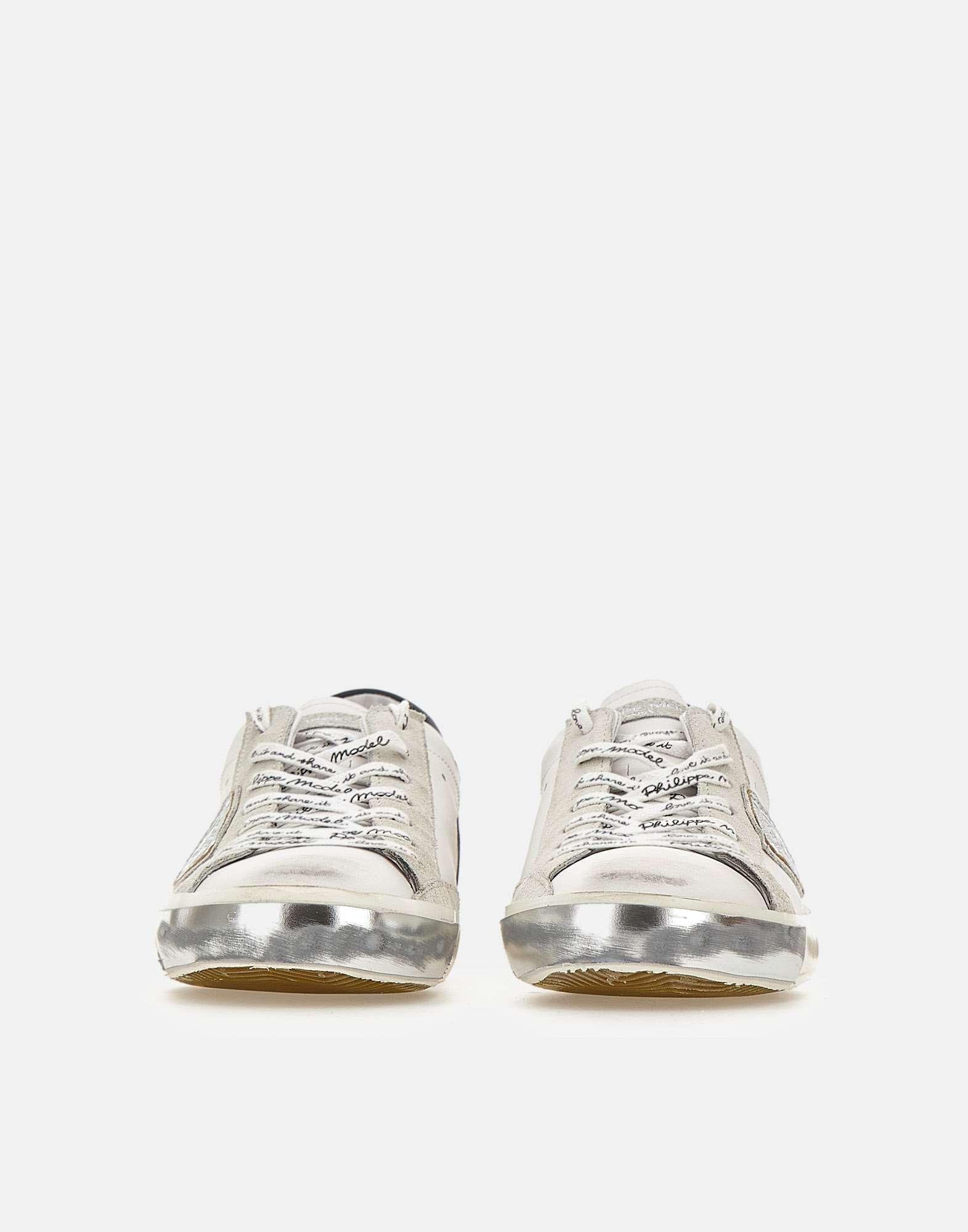 Philippe Model Paris "Prsx" men's sneakers crafted from white leather, finished with a branded black heel tab and light grey suede details. They feature white laces with text, logo patch on the tongue, a silver shield. The interior is lined in leather and cotton terry, while the branded removable insole adds comfort. The iconic 3 cm sole, with handcrafted grooves and smudged details, enhances the lived-in, vintage-inspired look. Regular fit. Extra laces included. Made in Italy.