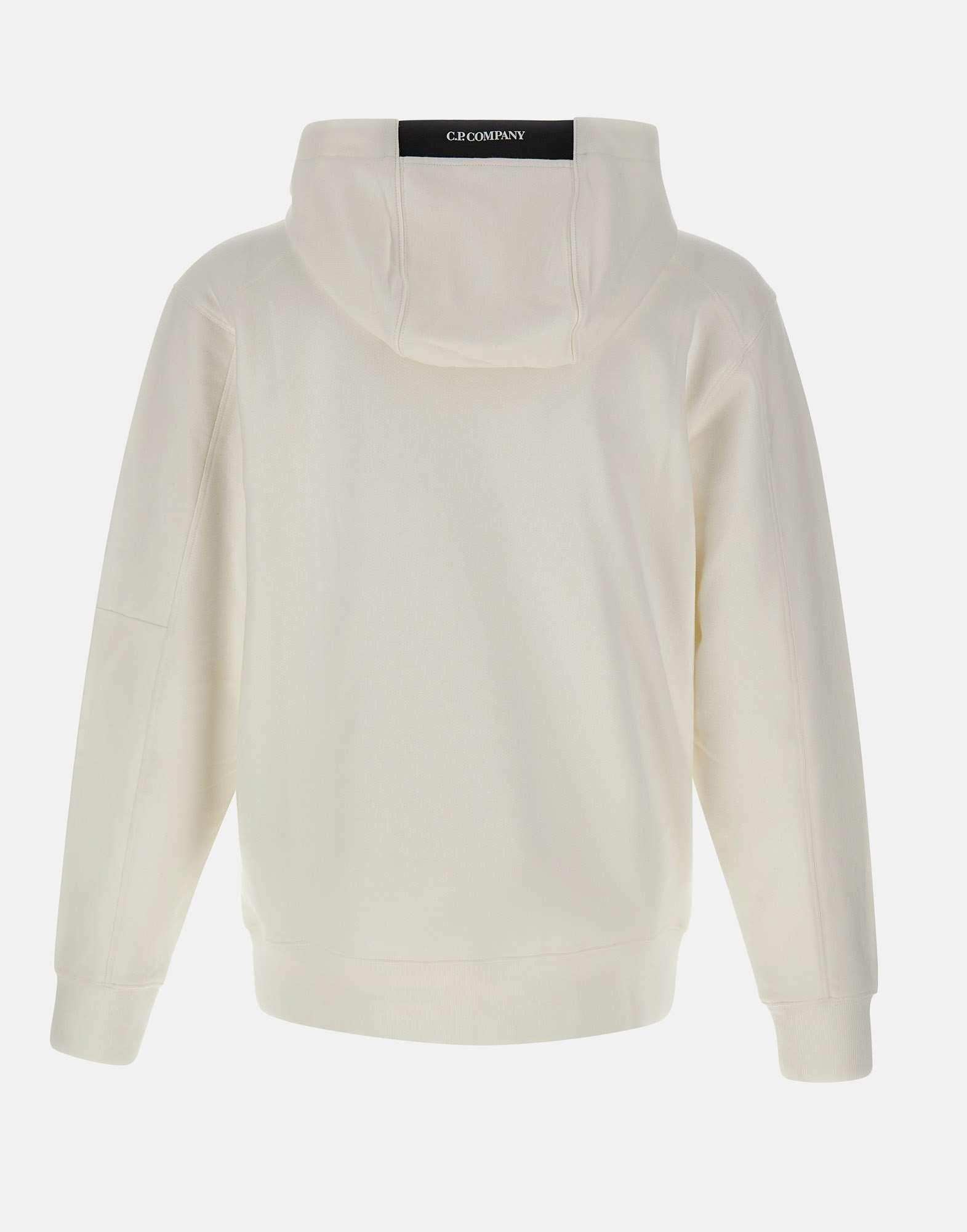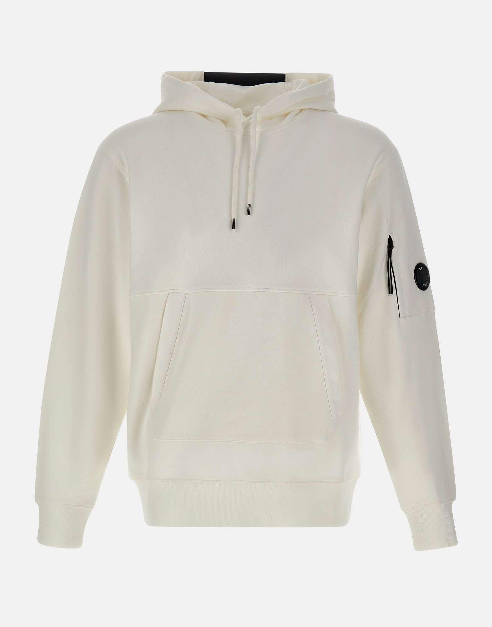 Men's C.P. Company "Diagonal Raised Fleece" hooded sweatshirt crafted from white mid-weight brushed cotton with a diagonal weave designed for comfort and freedom of movement. The soft fabric enhances everyday wearability. Features an adjustable hood, a kangaroo pocket, and a zipped sleeve pocket finished with the iconic C.P. Company Lens. Ribbed cuffs and hem and a branded elastic trim on the hood edge complete the design. Regular fit.