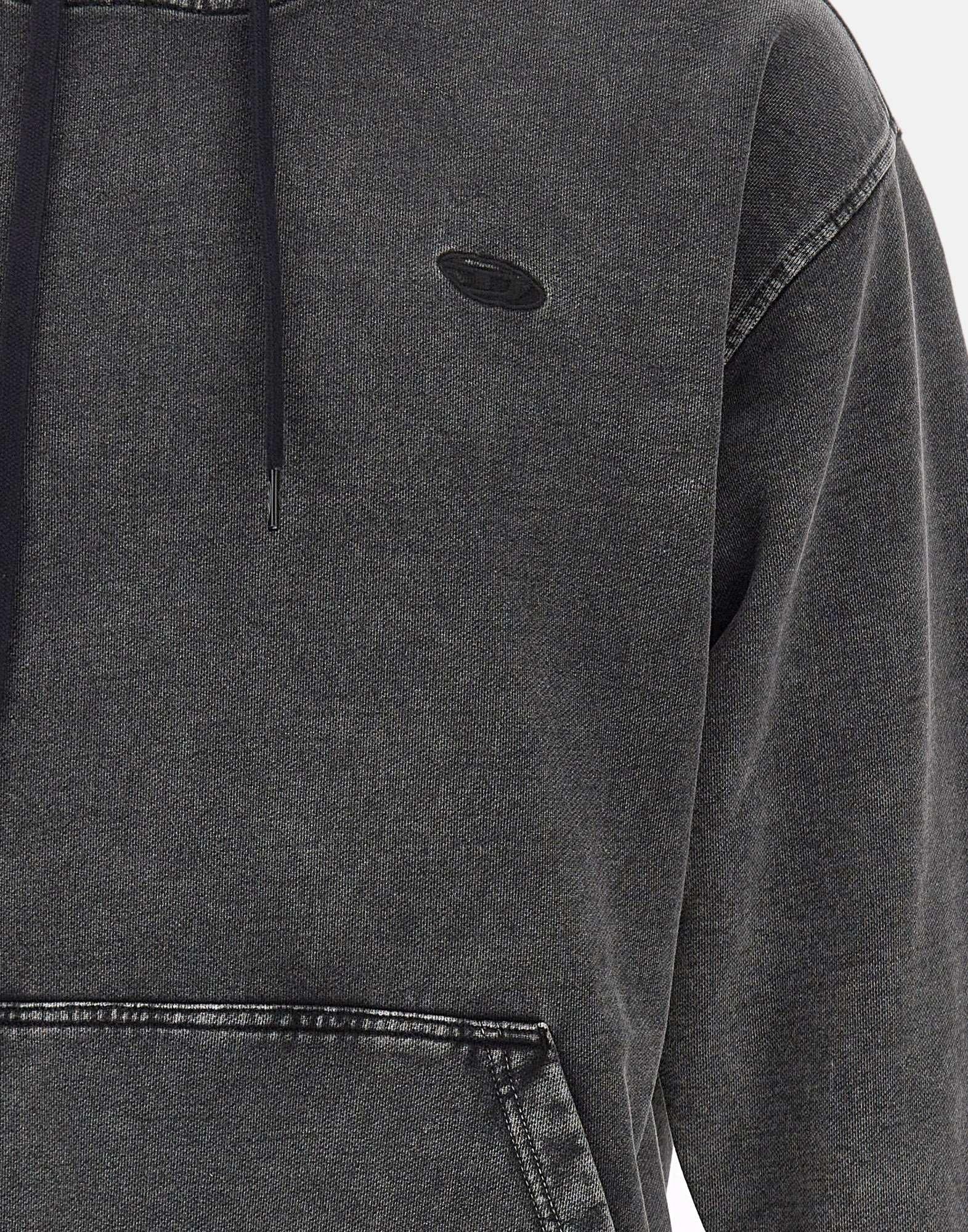 Men's Diesel "S-boxt-hood-den" hooded sweatshirt crafted from dark grey brushed cotton fleece, designed with a relaxed fit. Features an adjustable drawstring hood, kangaroo pocket, and ribbed elasticated cuffs and hem for added comfort. The back is highlighted by a large Oval D patch with raw-cut edges, combined with a small embroidered Oval D on the left chest. Garment dye and acid wash treatments give the sweatshirt a distinctive, lived-in look. Finished with Oval D logo plastic tips on the hood drawstrings.