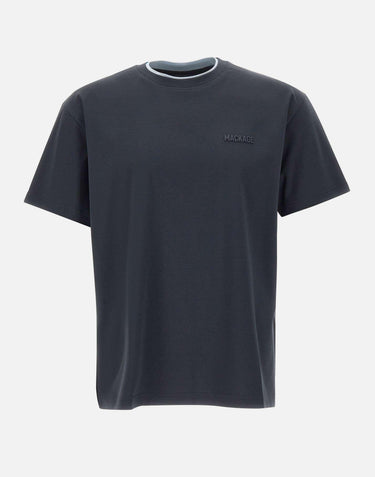Mackage men's t-shirt crafted from navy blue organic cotton, designed as a contemporary everyday essential. It features short sleeves, a crew neck with a light blue ribbed insert, and a straight cut for a clean, versatile silhouette. A tonal rubber logo on the chest adds a subtle, recognizable finish. The regular fit ensures comfort and easy movement, perfect for polished casual looks.